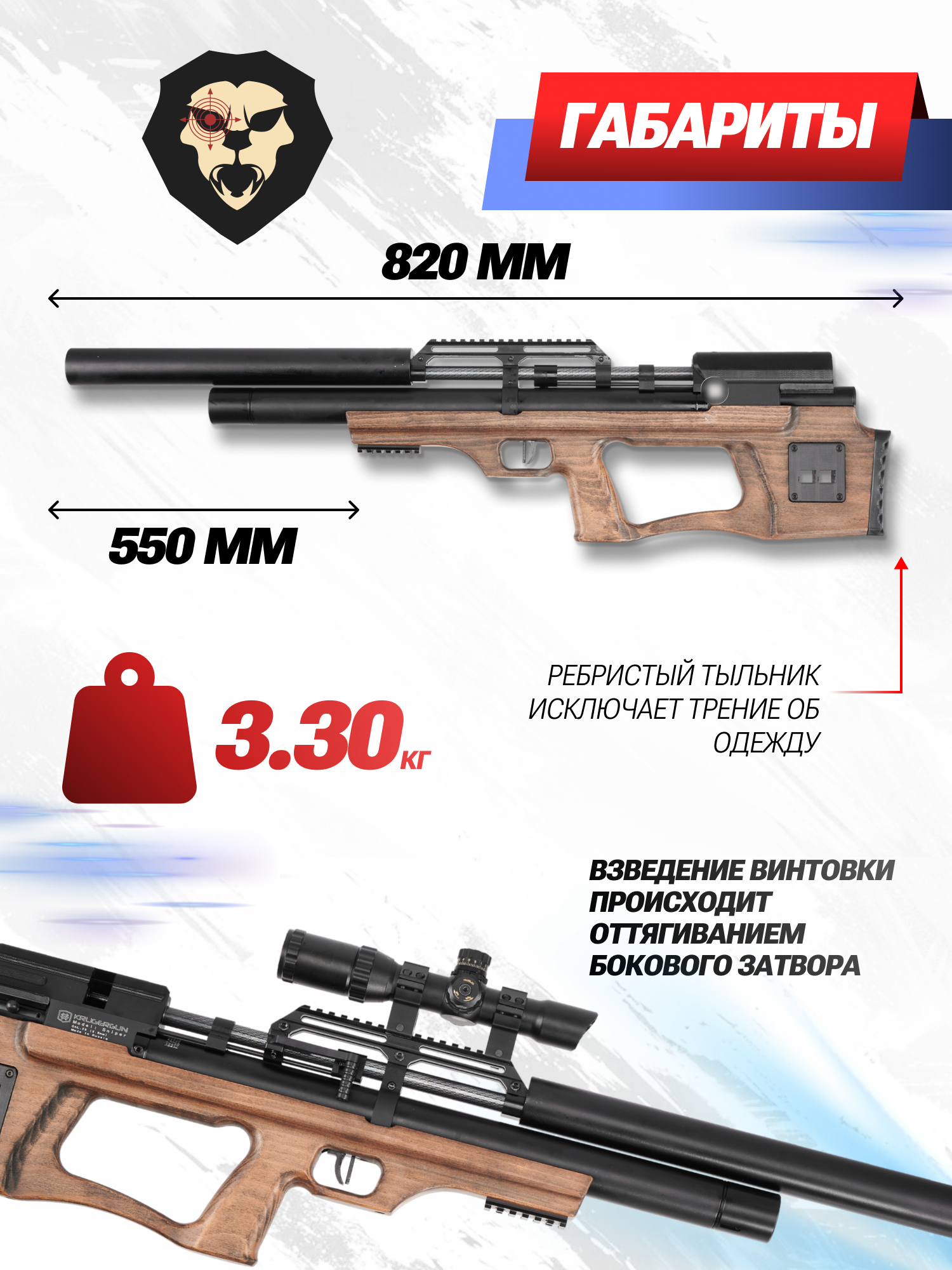 Пневматика KrugerGun серийного ряда булл-пап Снайпер – это винтовки, работающие по прямоточной схеме PCP воздушек. Воздух предварительно нагнетается в баллоне под стволом и при выстреле под давлением 200 Атмосфер высвобождается, поступая в ствол. Боеприпас, попадающий из патронника в ствол оружия, разгоняется потоком воздуха.