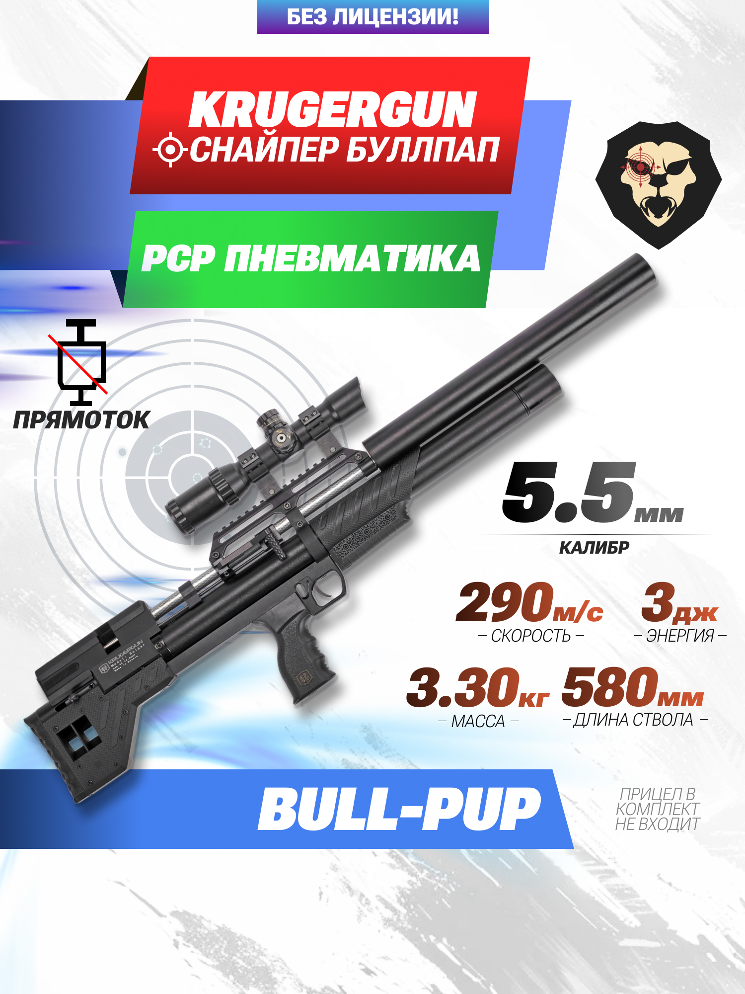 Для стрелков, предпочитающих использовать винтовки с длинным стволом в компактном исполнении bullpup с пластиковой полимерной ложей компанией Крюгерган разработана новая воздушка Крюгер буллпап Снайпер 5.5 миллиметров. Пневматика выпускается в категории многозарядного оружия и для боепитания использует барабанные многозарядные магазины с автоматическим механизмом работы, совершающим смену секции с боеприпасом после взвода затворного механизма.