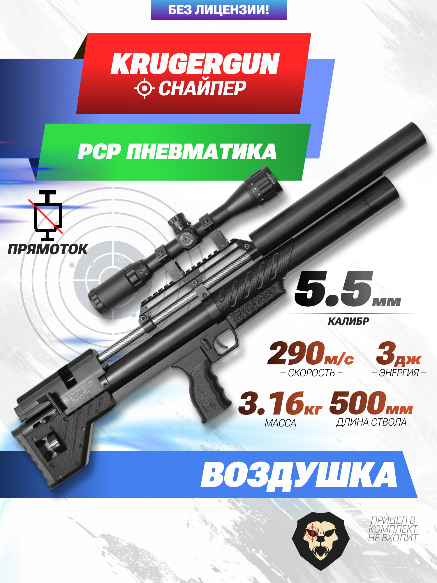 Российская оружейная компания KrugerGun на протяжении многих лет занимается производством пневматического оружия, а также аксессуаров и сопутствующих товаров для пневматики. Серия многозарядных пневматических ПСП винтовок Крюгера Снайпер в обществе гражданских стрелков заслужила репутацию мощной и качественной пневматики, используемой как профессионалами, так и начинающими пользователями.