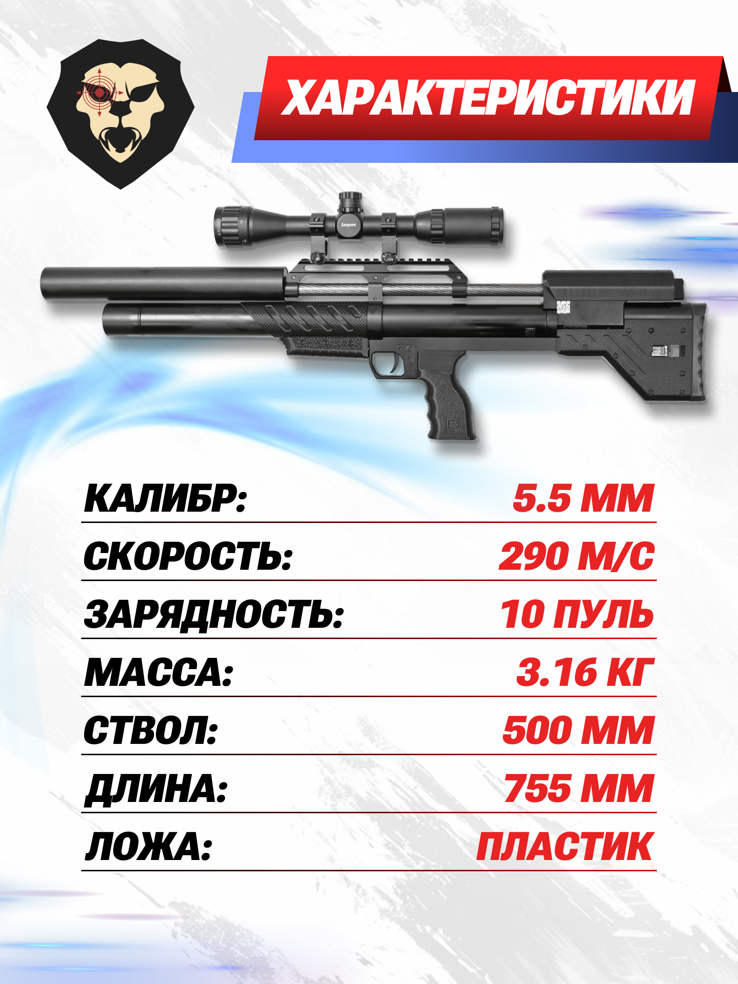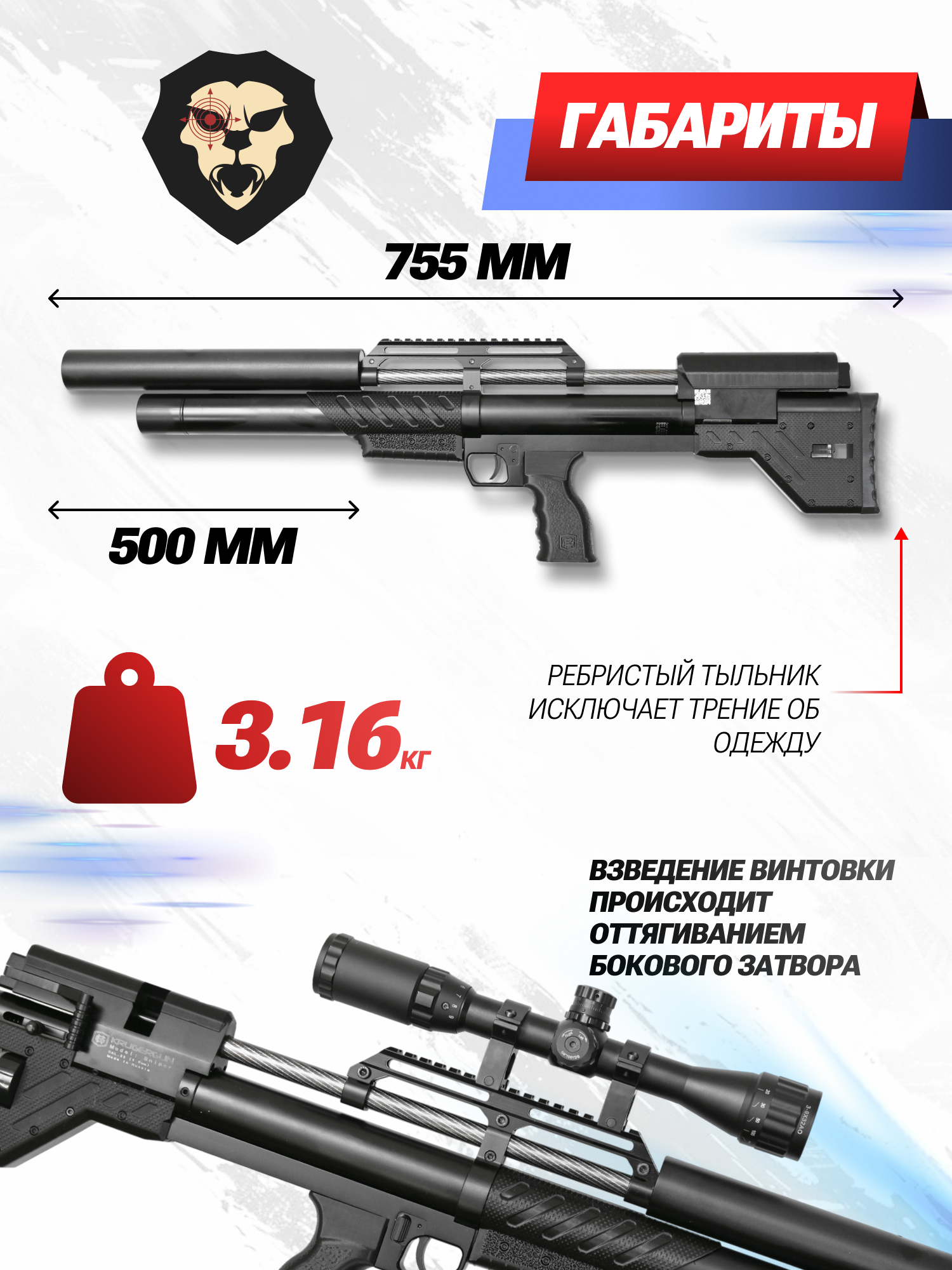 | Комплектация | Винтовка, упаковка, заправочный штуцер, магазин, набор уплотнителей, краткая документация, копия сертификата (по запросу покупателя) |