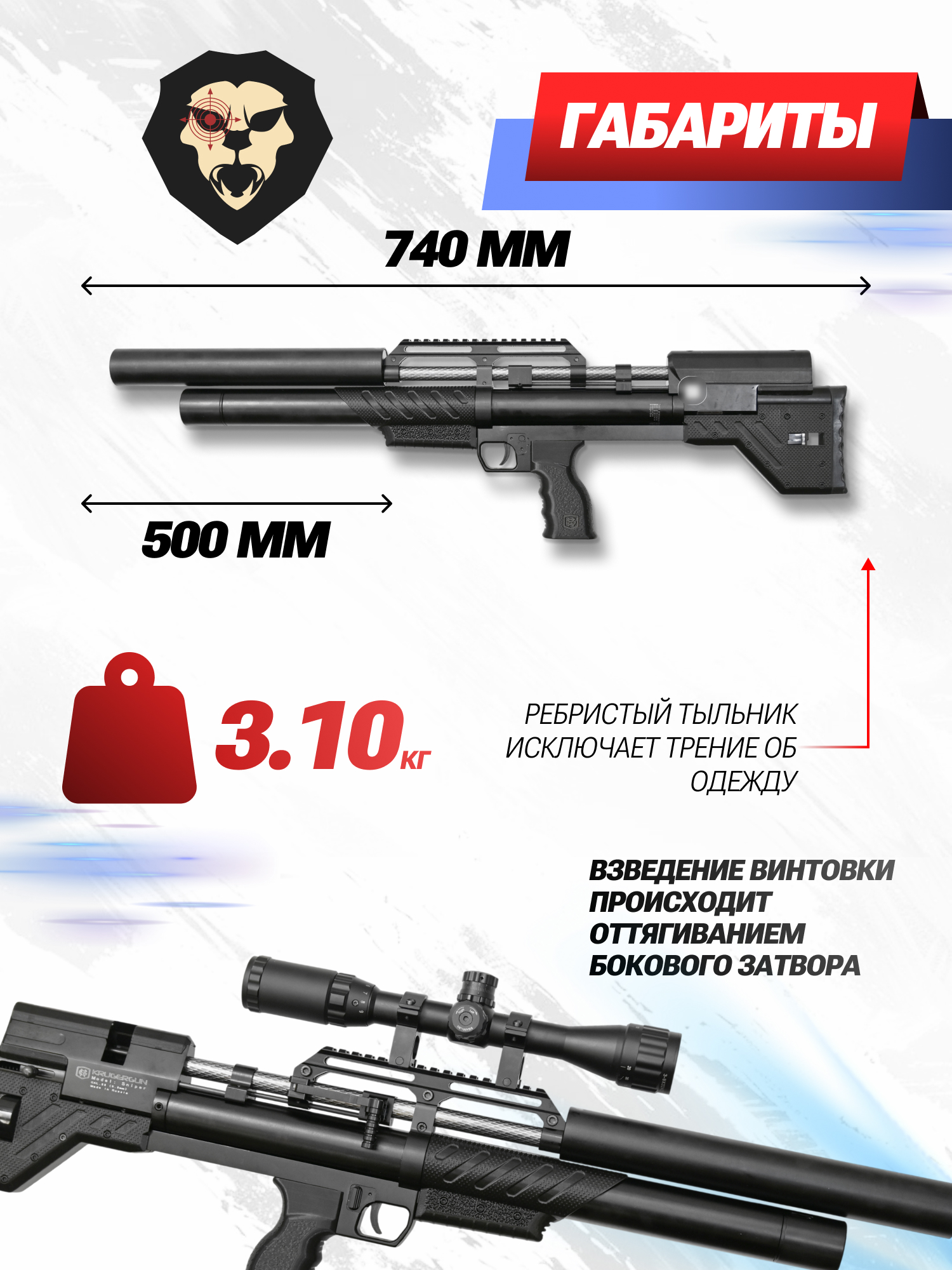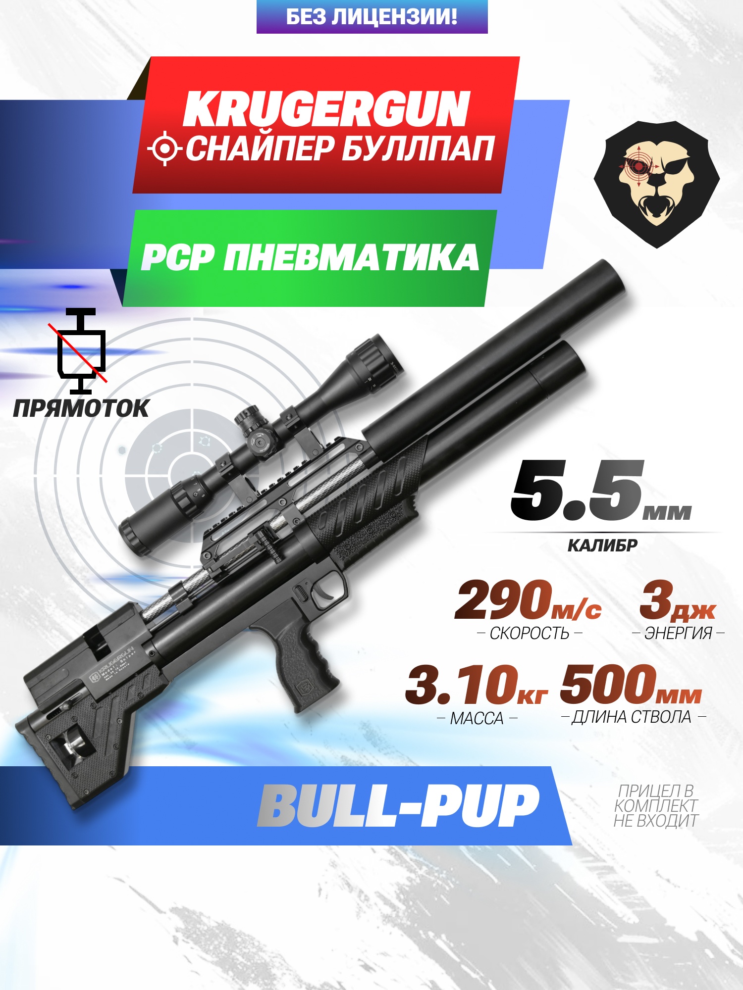 Информация о товаре "Пневматическая винтовка Krugergun Снайпер 5.5 мм Bullpup (500 мм, прямоток, взвод передний, пластик, резервуар 510)" носит ознакомительный характер, и не является публичной офертой, определяемой положениями Статьи 437 Гражданского кодекса Российской Федерации, характеристики, внешний вид, цвет и комплектация могут быть изменены производителем без уведомления.