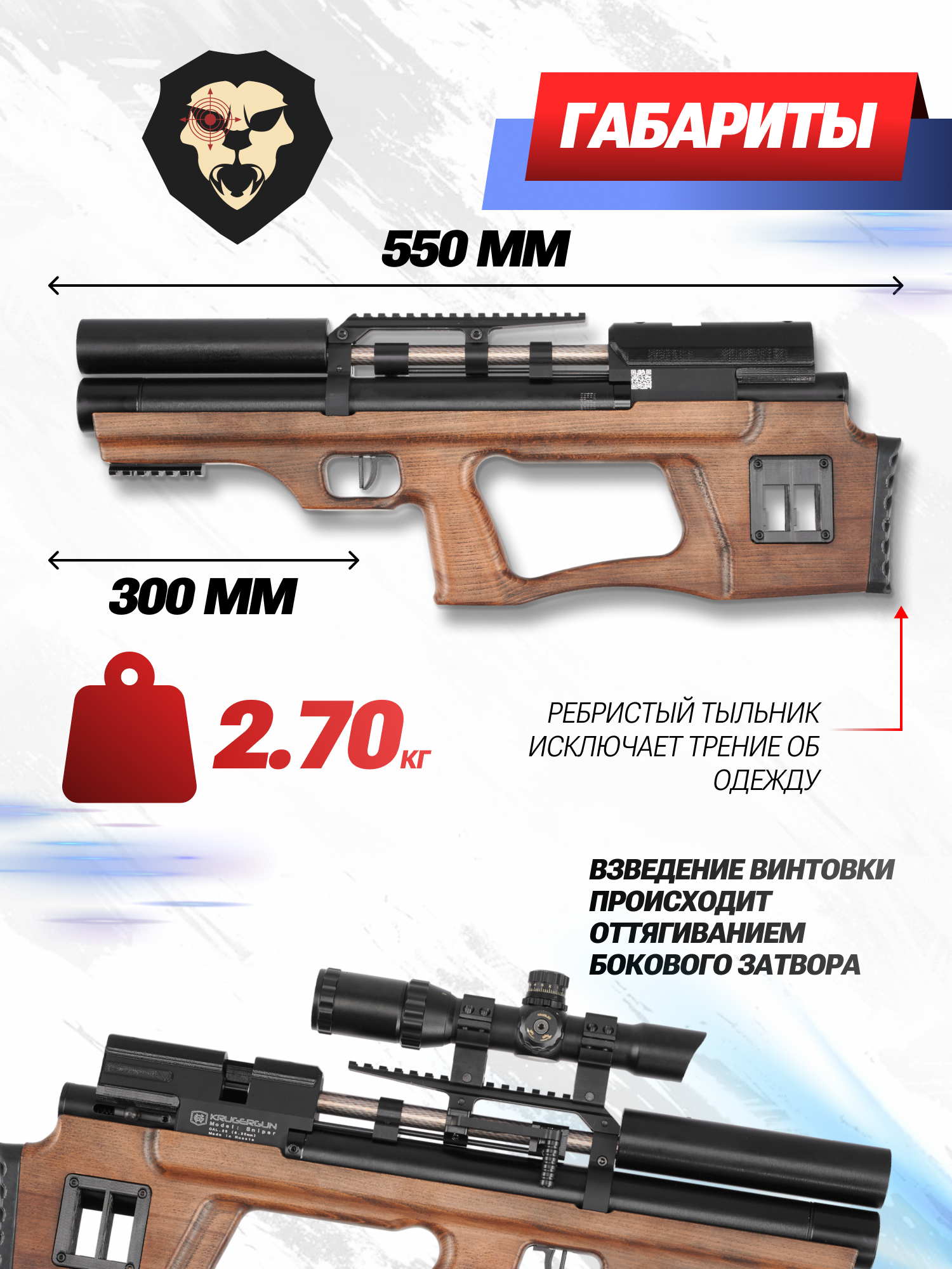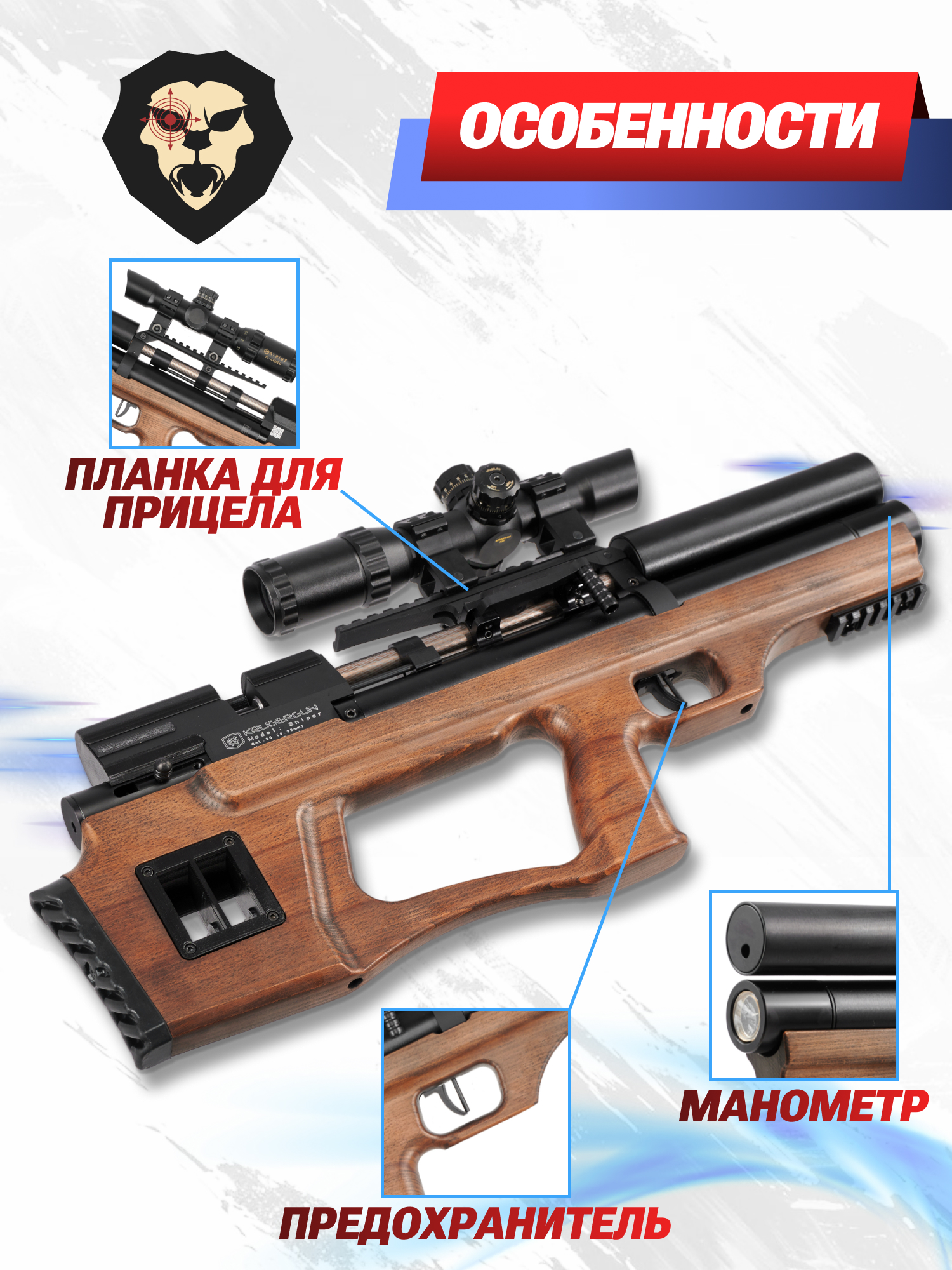 Пневматическое оружие, которое изготавливает российская компания КрюгерГан – это мощные и высокоточные винтовки и пистолеты, которые используются для разных направлений стрелковой подготовки. Обширный модельный ряд дает возможность каждому подобрать для своих увлечений наиболее подходящее оружие. Водушка Крюгера Снайпер буллпап в калибре 6.35 мм с деревянной ложей – это выбор для стрелков, предпочитающих использовать винтовки в компактном малогабаритном исполнении, для транспортировки которых не нужно использовать большие оружейные кейсы.