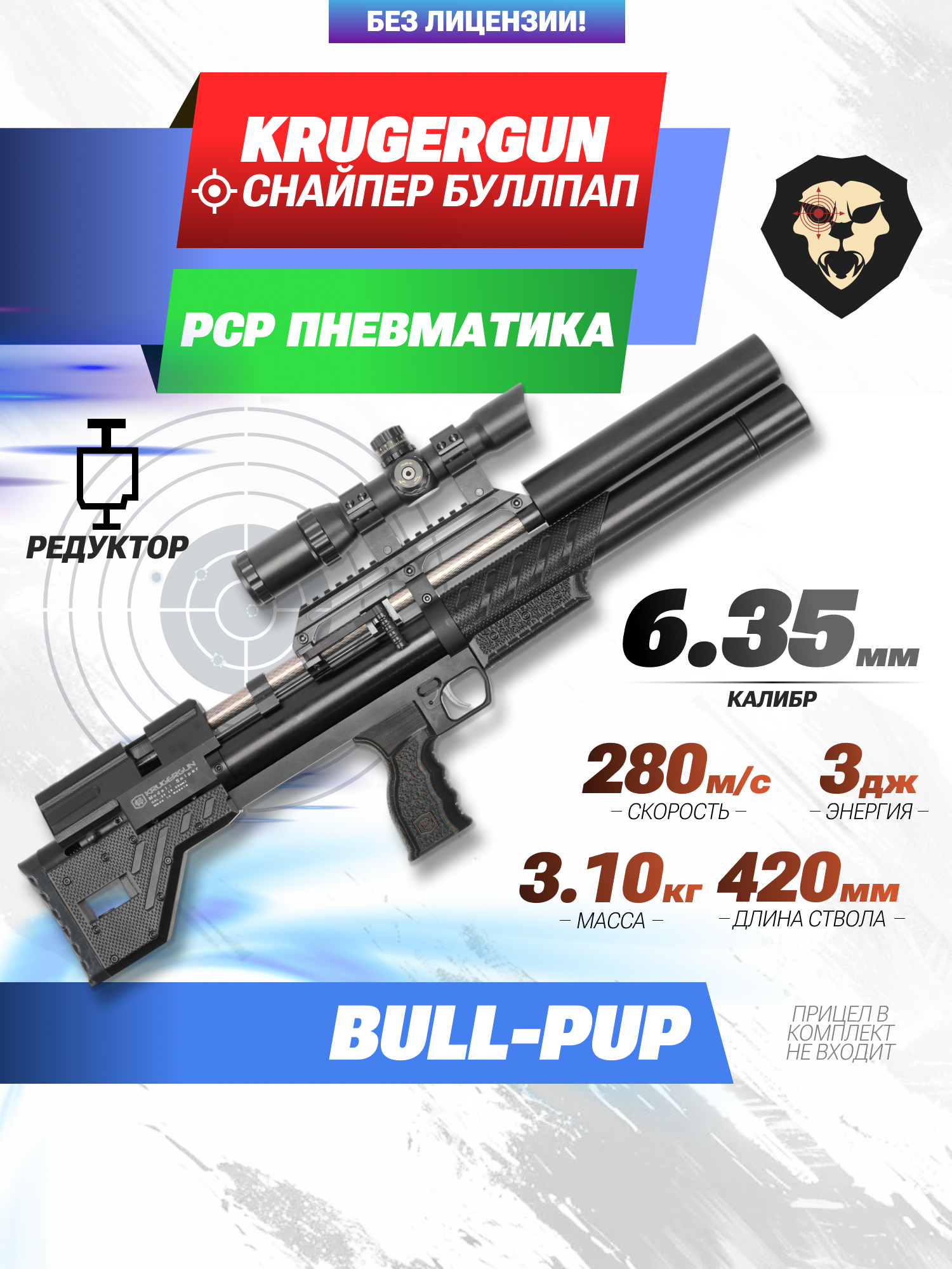 Информация о товаре "Пневматическая винтовка Krugergun Снайпер 6.35 мм Буллпап (420 мм, резервуар 510, взвод передний, редуктор, пластик)" носит ознакомительный характер, и не является публичной офертой, определяемой положениями Статьи 437 Гражданского кодекса Российской Федерации, характеристики, внешний вид, цвет и комплектация могут быть изменены производителем без уведомления.