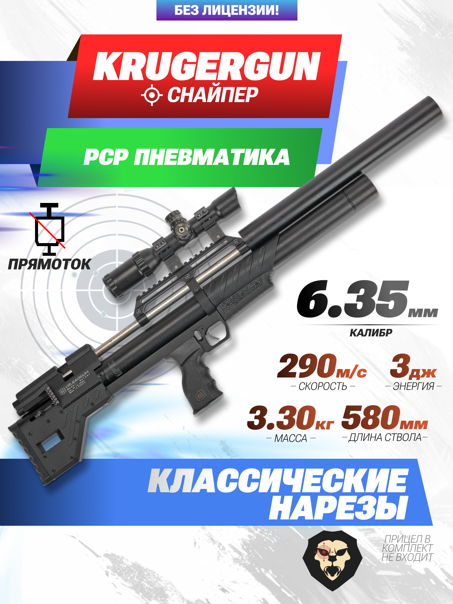 Среди производителей ПЦП пневматики выделяется российский изготовитель качественных и мощных пневматических винтовок компания КрюгерГан. Воздушки Kruger разрабатываются для всевозможных категорий гражданских стрелков. Новинка Снайпер буллпап от крюгера 6.35 миллиметров придется по душе и охотникам, и спортсменам, и желающим пострелять для удовольствия на свежем воздухе.