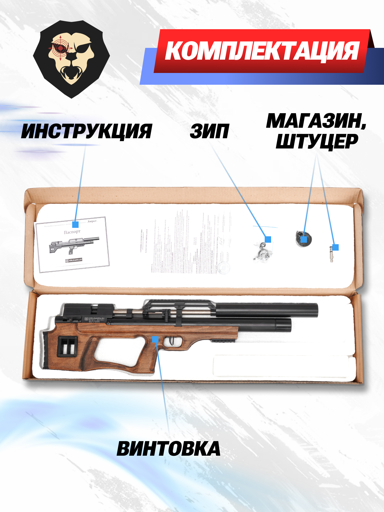 | Комплектация | Винтовка, упаковка, заправочный штуцер, магазин, набор уплотнителей, краткая документация, копия сертификата (по запросу покупателя) |