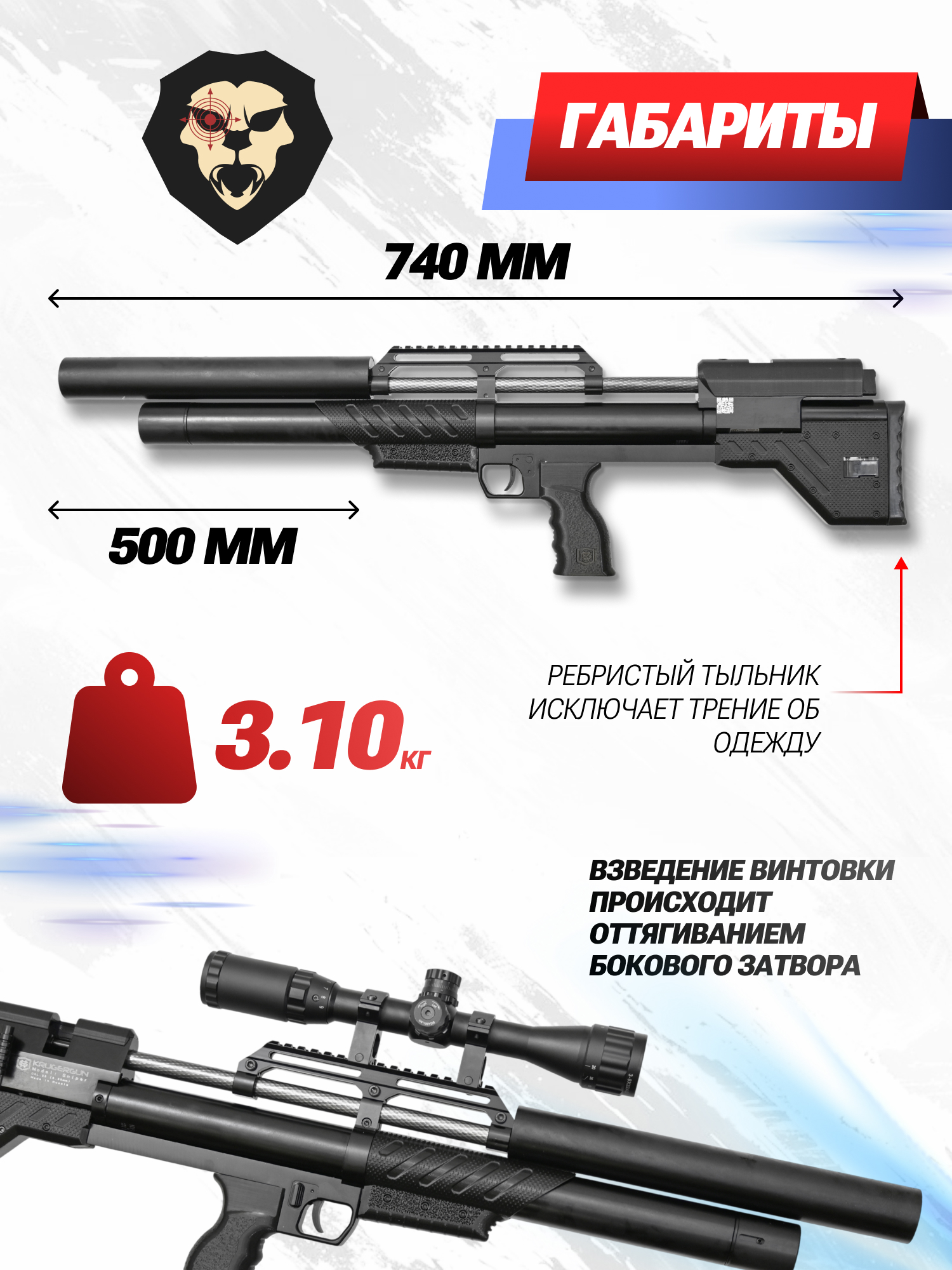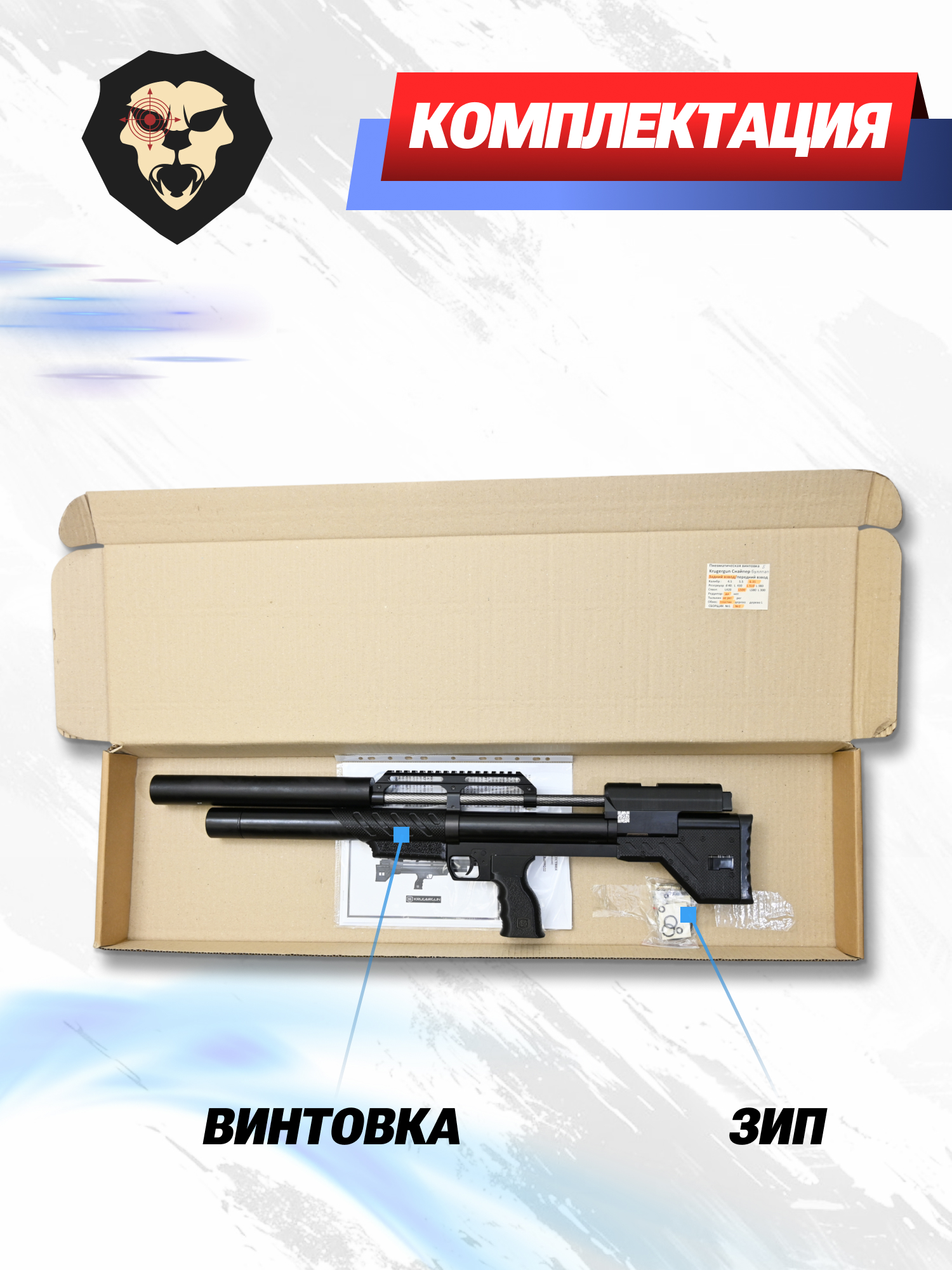 Информация о товаре "Пневматическая винтовка Krugergun Снайпер 6.35 мм Bullpup (500 мм, редуктор, пластик, резервуар 510)" носит ознакомительный характер, и не является публичной офертой, определяемой положениями Статьи 437 Гражданского кодекса Российской Федерации, характеристики, внешний вид, цвет и комплектация могут быть изменены производителем без уведомления.