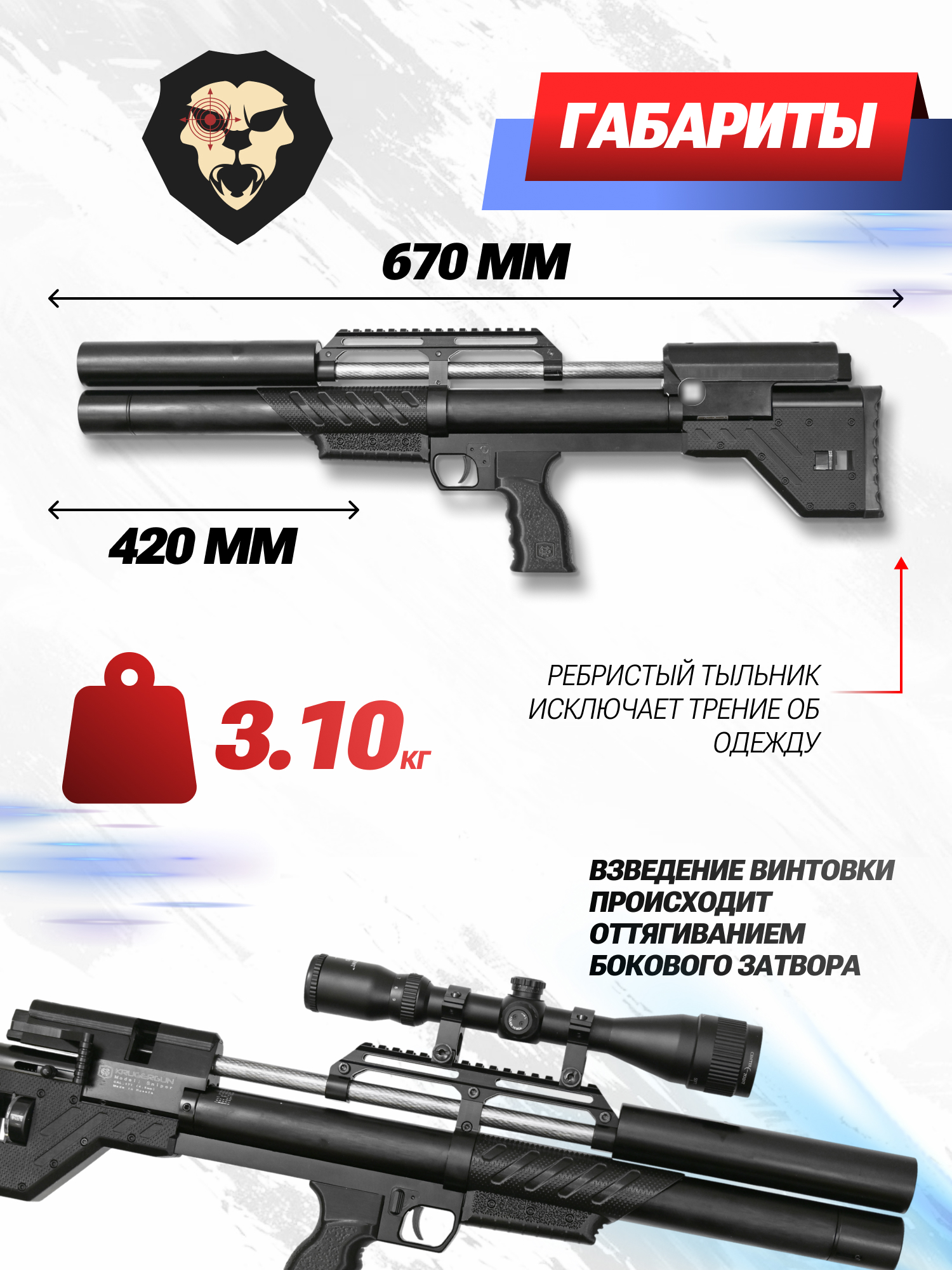 | Комплектация | Винтовка, упаковка, магазин, набор уплотнителей заправочный штуцер, краткая документация, копия сертификата (по запросу покупателя) |