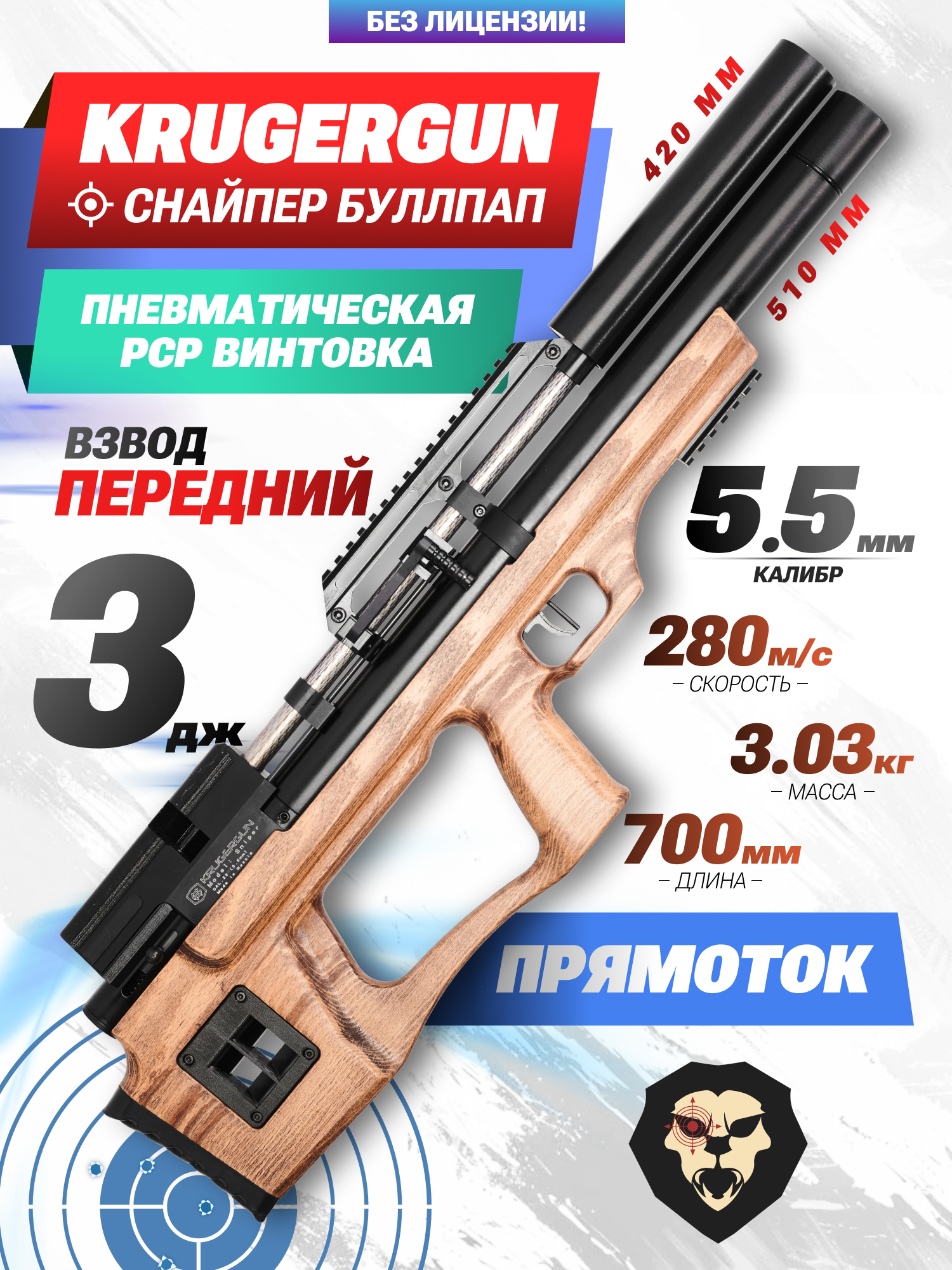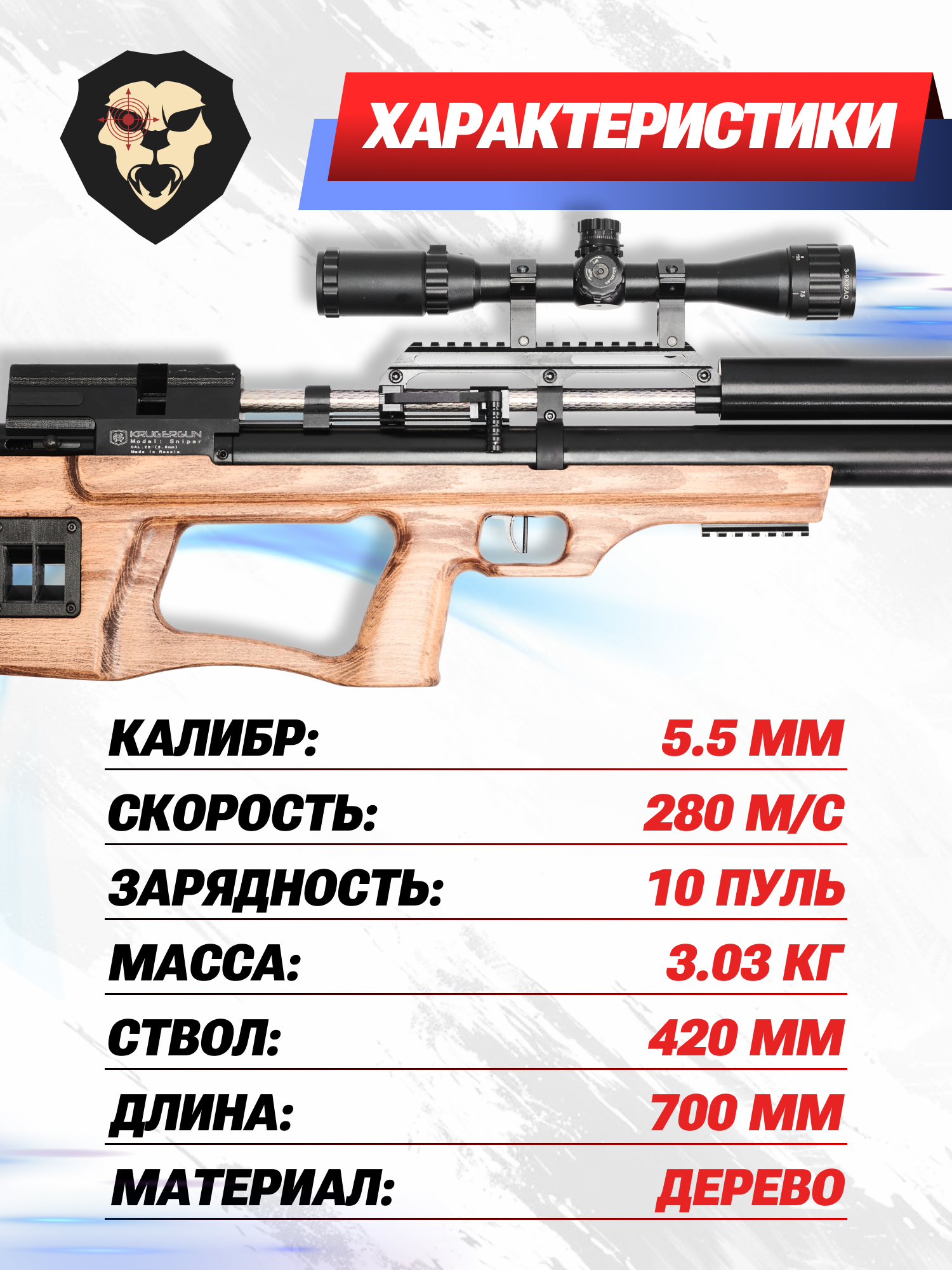 Информация о товаре "Пневматическая винтовка Krugergun Снайпер Буллпап 5.5 мм (420 мм, резервуар 510, передний взвод, прямоток, дерево)" носит ознакомительный характер, и не является публичной офертой, определяемой положениями Статьи 437 Гражданского кодекса Российской Федерации, характеристики, внешний вид, цвет и комплектация могут быть изменены производителем без уведомления.