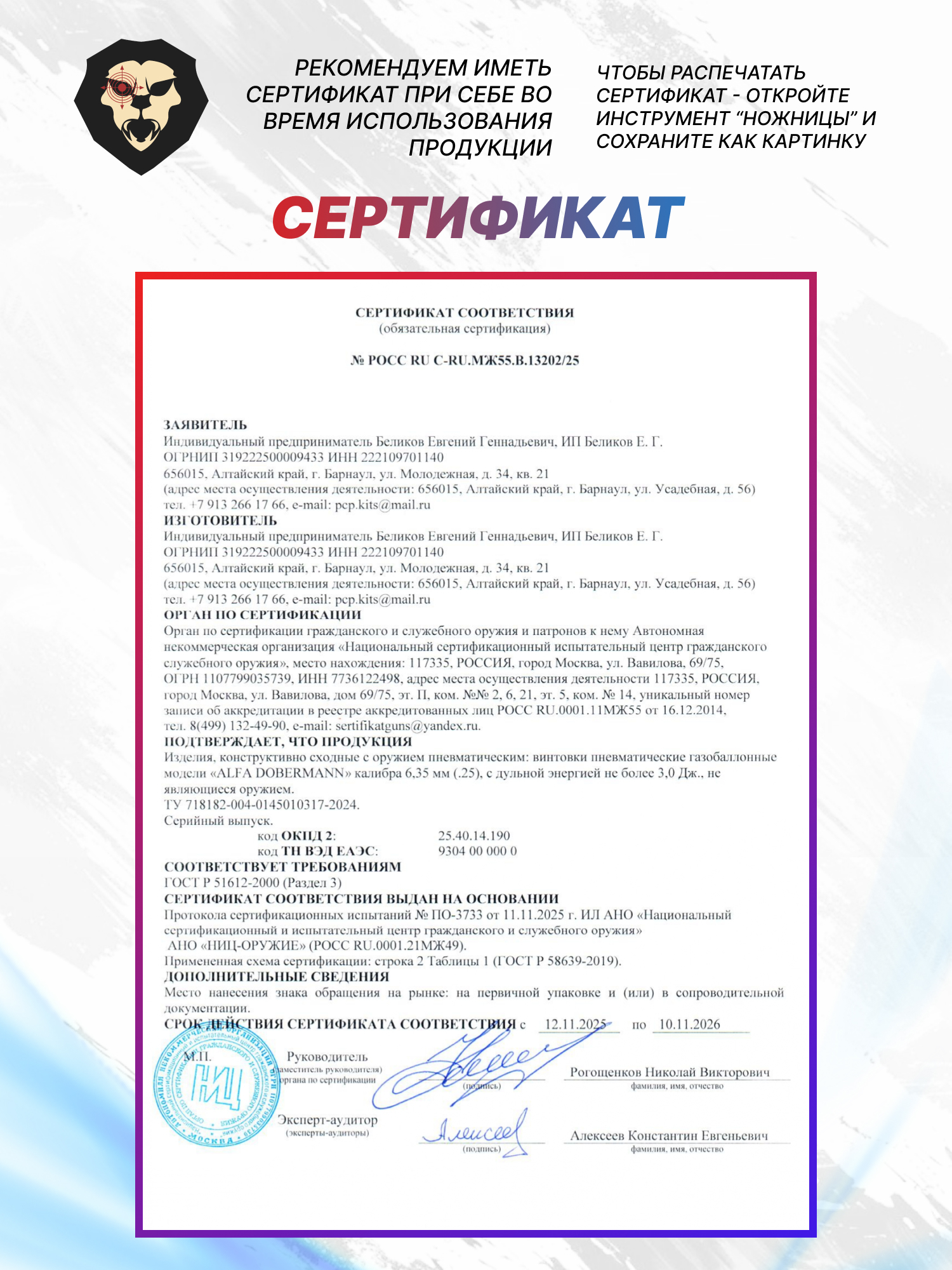 | Комплектация | Винтовка, упаковка, заправочный штуцер, краткая документация, магазин, РТИ, копия сертификата (по запросу покупателя) |