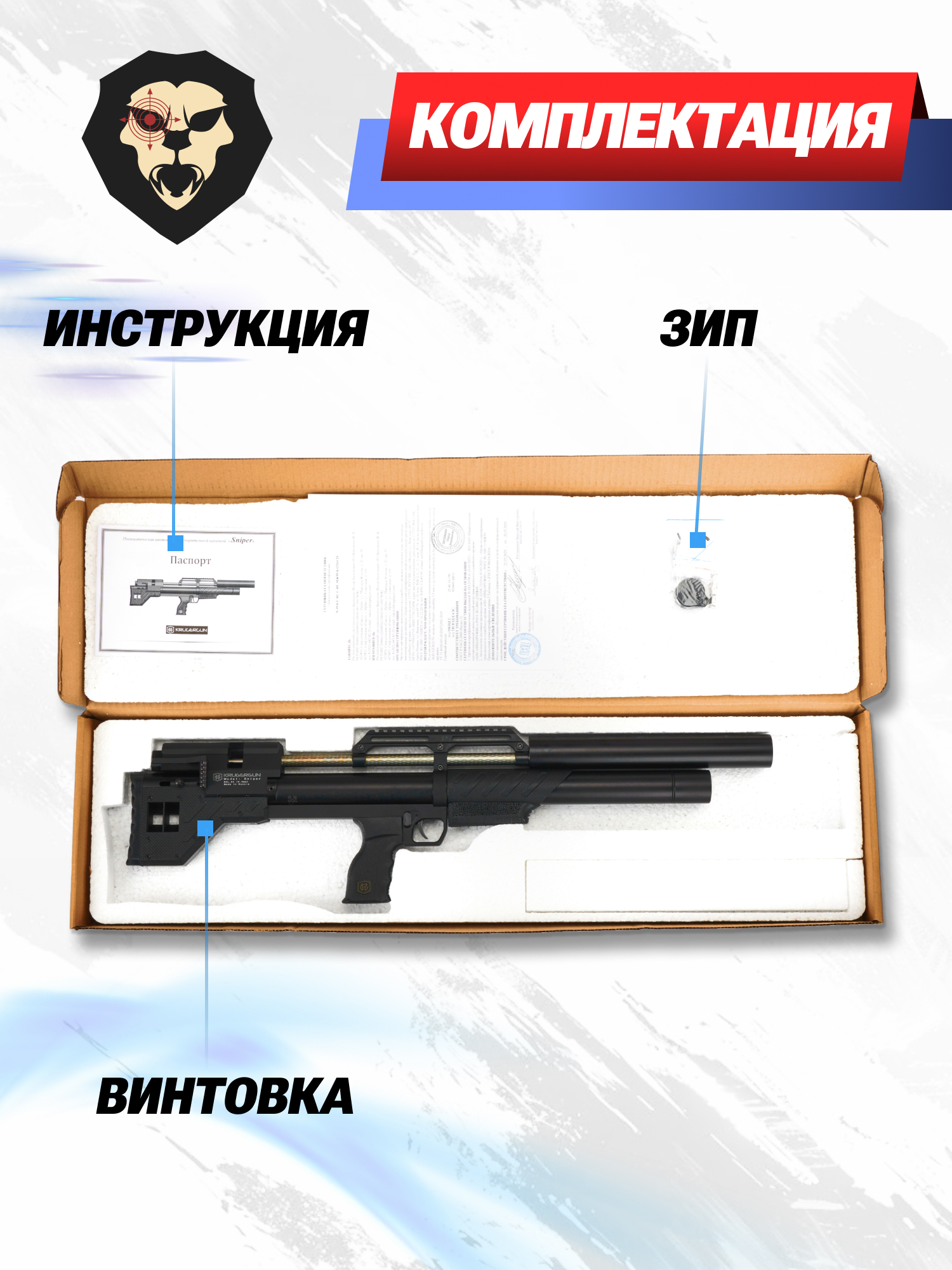 | Комплектация | Винтовка, упаковка, заправочный штуцер, магазин, набор уплотнителей, краткая документация, копия сертификата (по запросу покупателя) |