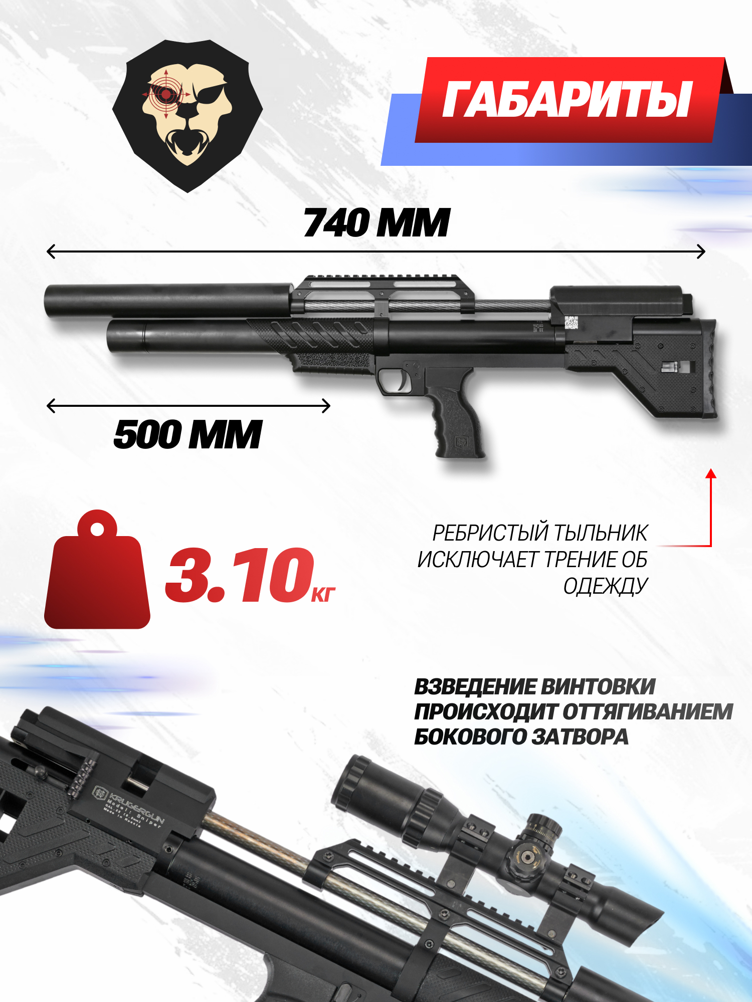 Согласно требованиям закона РФ, все пневматические винтовки оснащаются предохранителем. На винтовке KrugerGun Снайпер булл-пап 500 имеется флажковый предохранитель, который вынесен изготовителем на правую часть пистолетной рукояти.