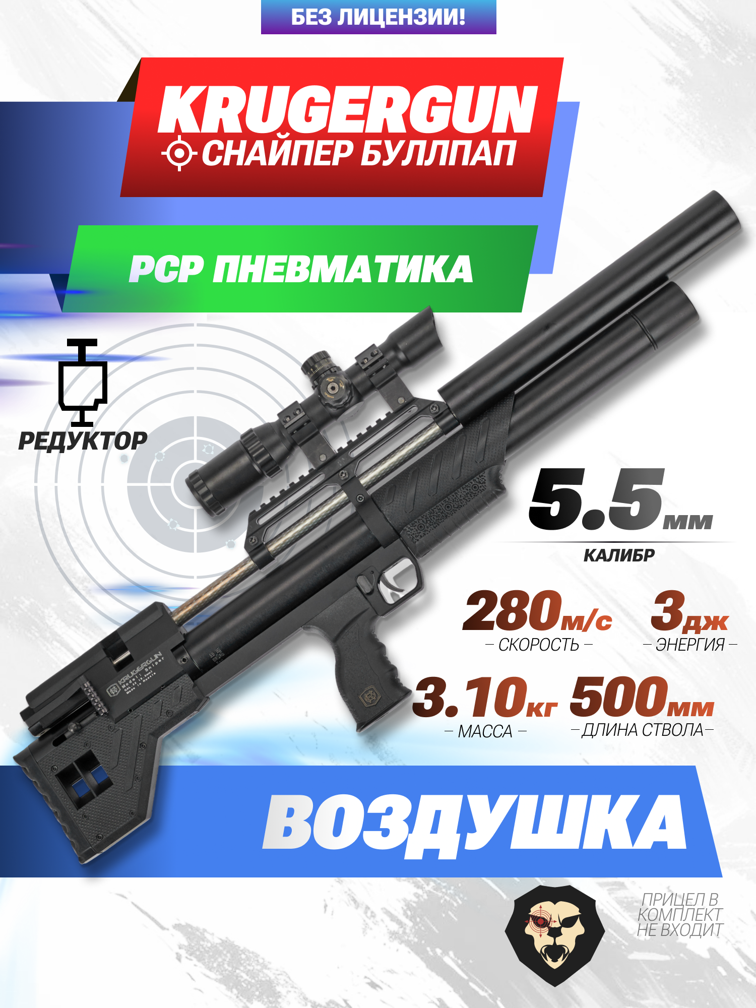 Информация о товаре "Пневматическая винтовка Krugergun Снайпер Буллпап 5.5 мм (500 мм, редуктор, пластик, резервуар 510)" носит ознакомительный характер, и не является публичной офертой, определяемой положениями Статьи 437 Гражданского кодекса Российской Федерации, характеристики, внешний вид, цвет и комплектация могут быть изменены производителем без уведомления.