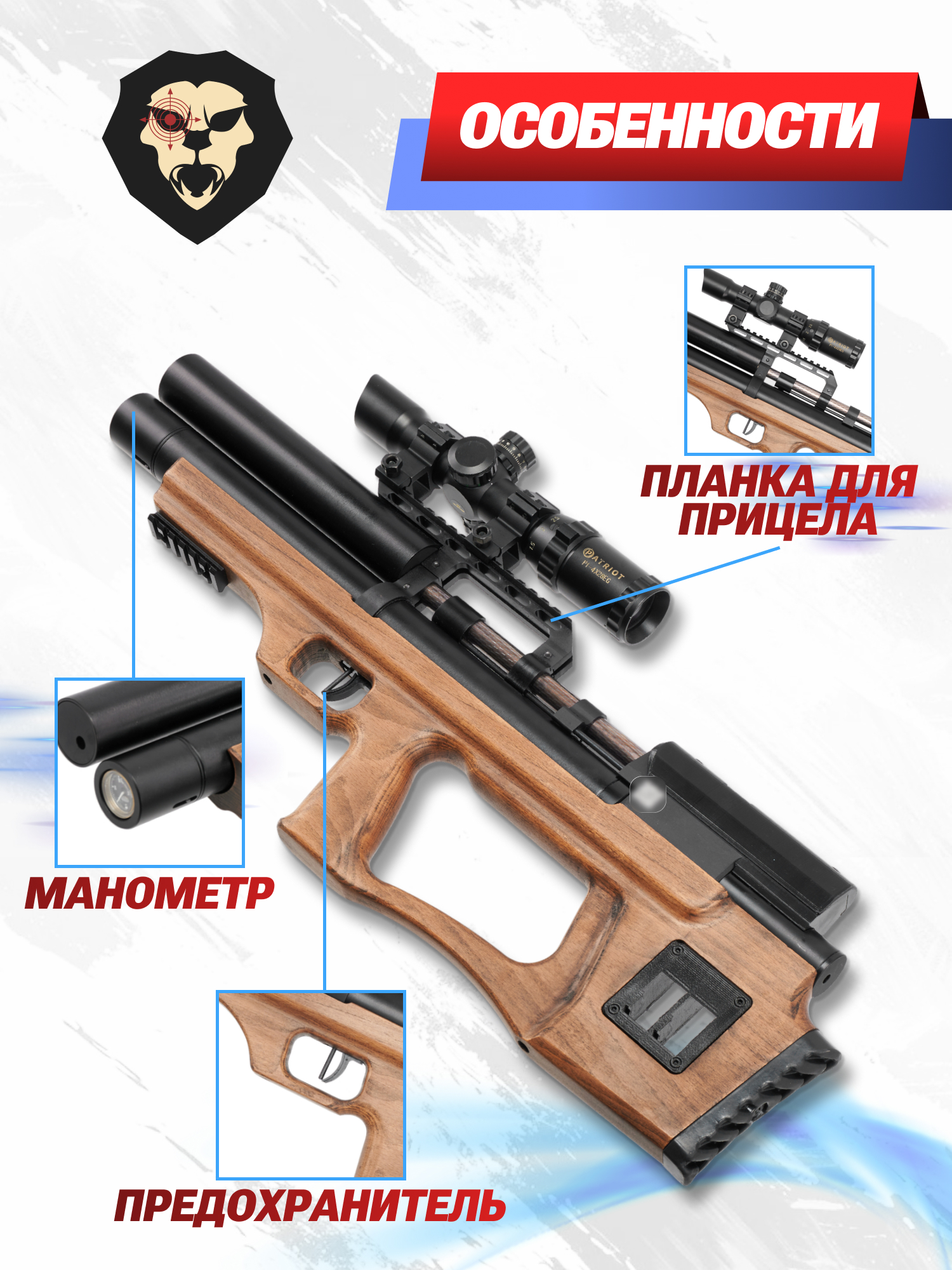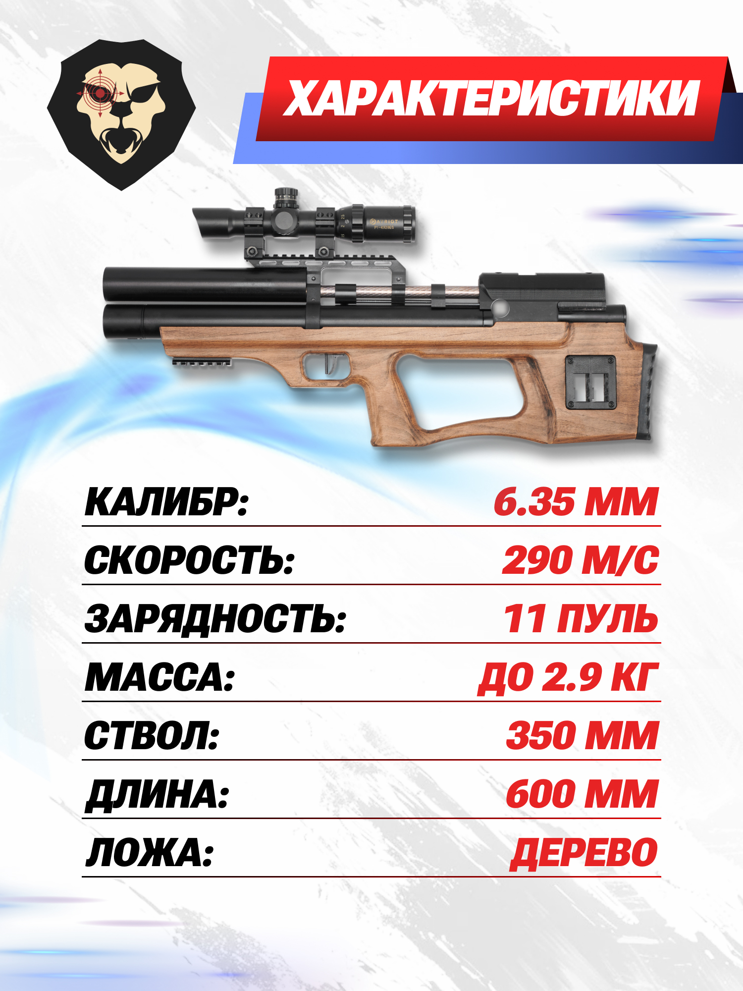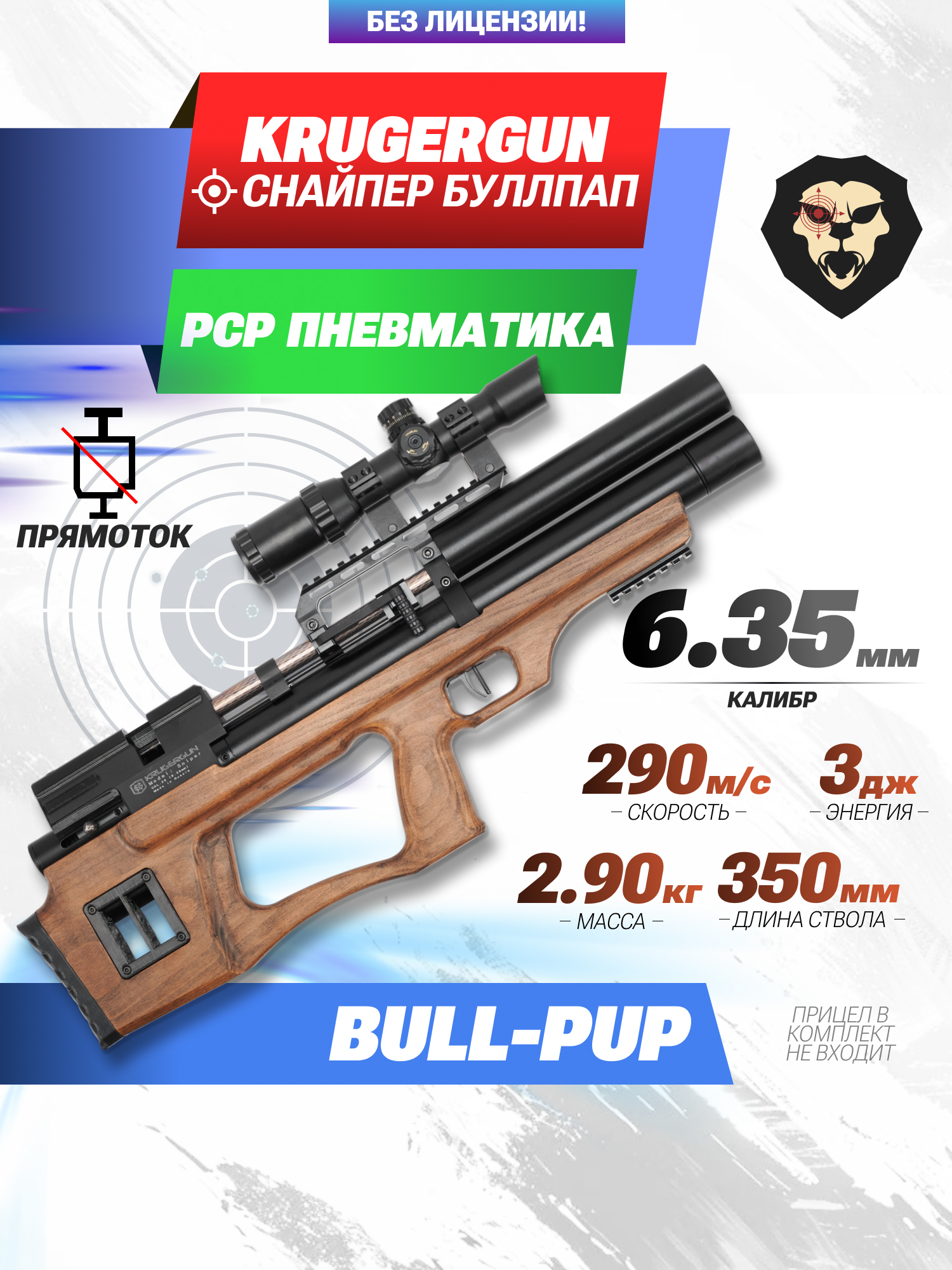 Информация о товаре "Пневматическая винтовка Krugergun Снайпер Буллпап 6.35 мм (350 мм, прямоток, резервуар 430, передний взвод, высокий мостик, дерево)" носит ознакомительный характер, и не является публичной офертой, определяемой положениями Статьи 437 Гражданского кодекса Российской Федерации, характеристики, внешний вид, цвет и комплектация могут быть изменены производителем без уведомления.
