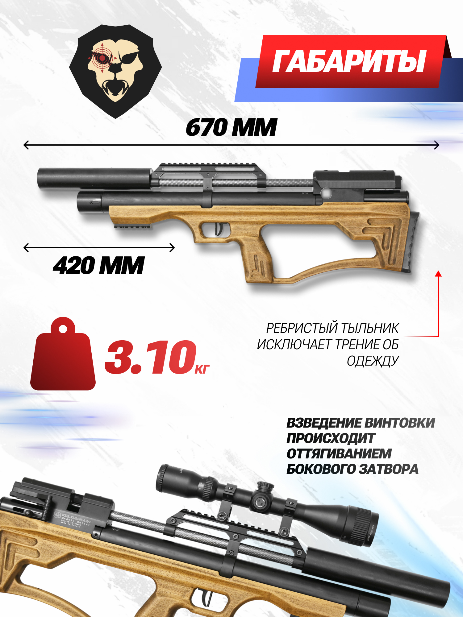 Компанией была представлена новая пневматическая винтовка KrugerGun модельного ряда Sniper, которая в рамках расширения ассортимента выпускается в варианте с новой ложей в деревянном исполнении. Ложа украшается резными фигурами, а древесина обрабатывается морилкой для придания материалу привлекательного внешнего вида.