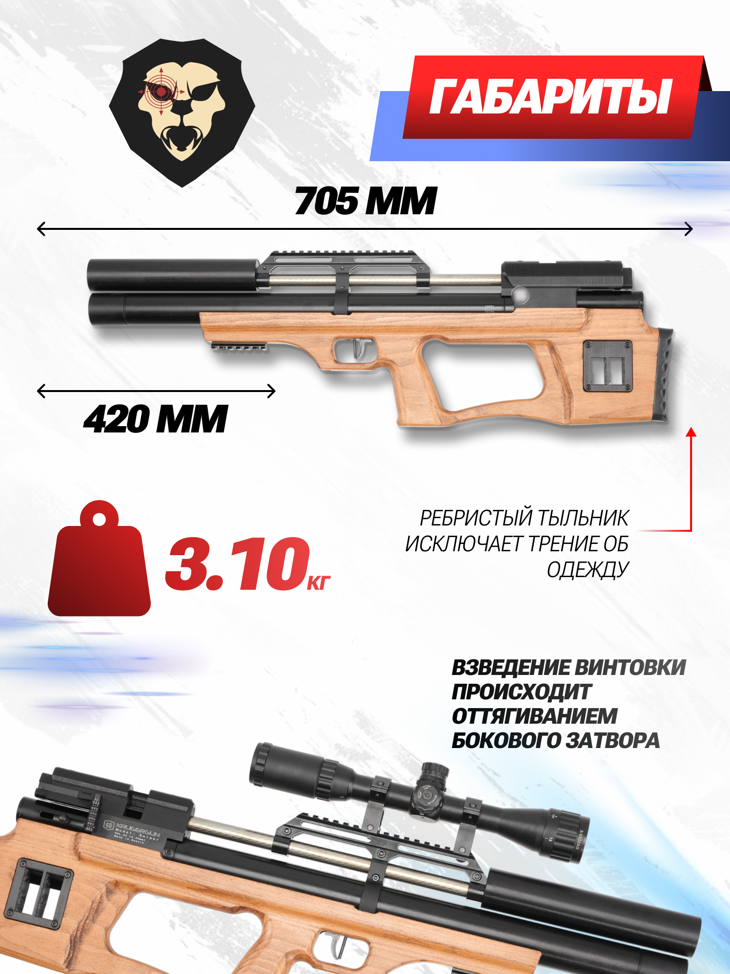 | Комплектация | Винтовка, упаковка, заправочный штуцер, краткая документация, магазин, РТИ, копия сертификата (по запросу покупателя) |