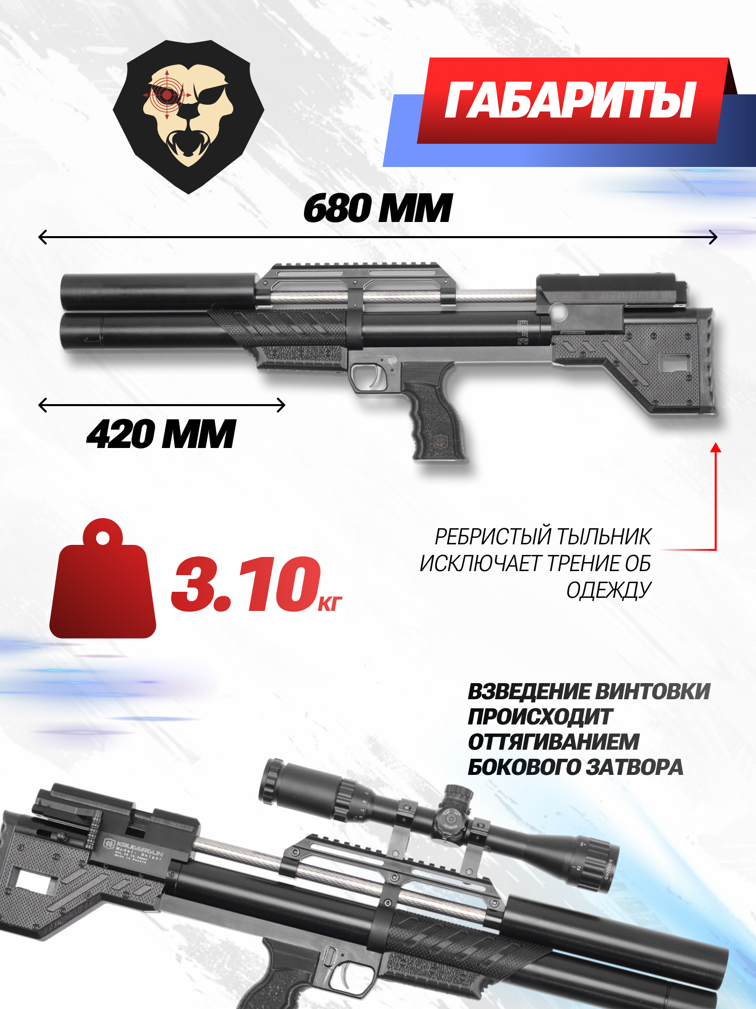 Крюгерган Снайпер — пневматическая винтовка, работающая от предварительно заряженного воздушного резервуара повышенного давления. Модель используемого ресивера вмещает в себя 365 кубических сантиметров полезного объема.