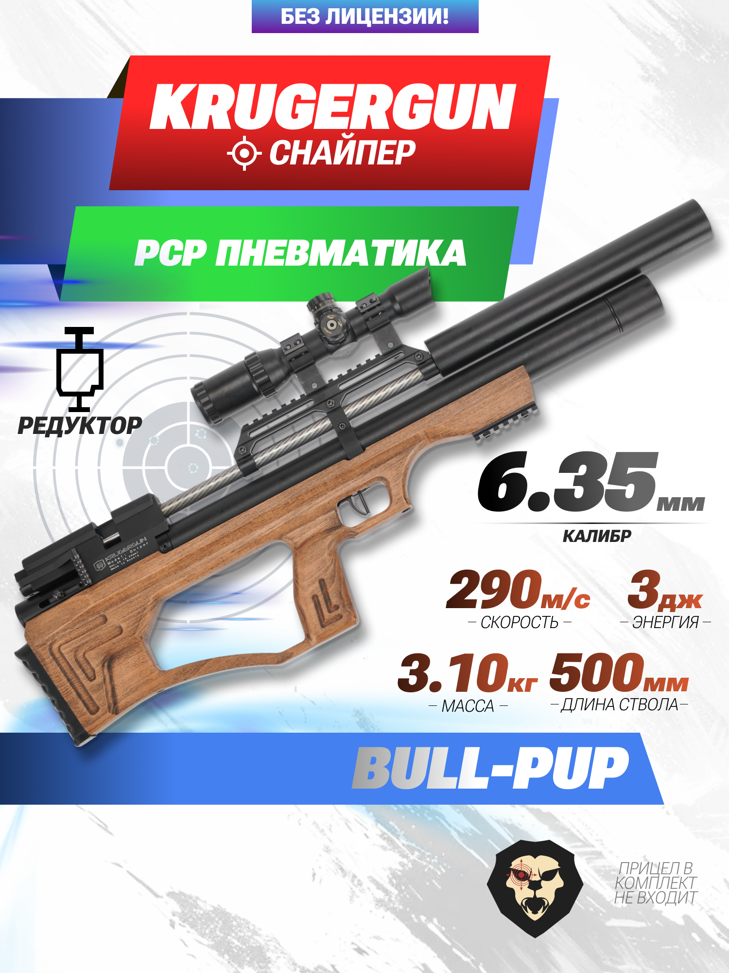 Информация о товаре "Пневматическая винтовка Krugergun Снайпер Буллпап 6.35 мм (500 мм, резервуар 510, передний взвод, редуктор, дерево L)" носит ознакомительный характер, и не является публичной офертой, определяемой положениями Статьи 437 Гражданского кодекса Российской Федерации, характеристики, внешний вид, цвет и комплектация могут быть изменены производителем без уведомления.