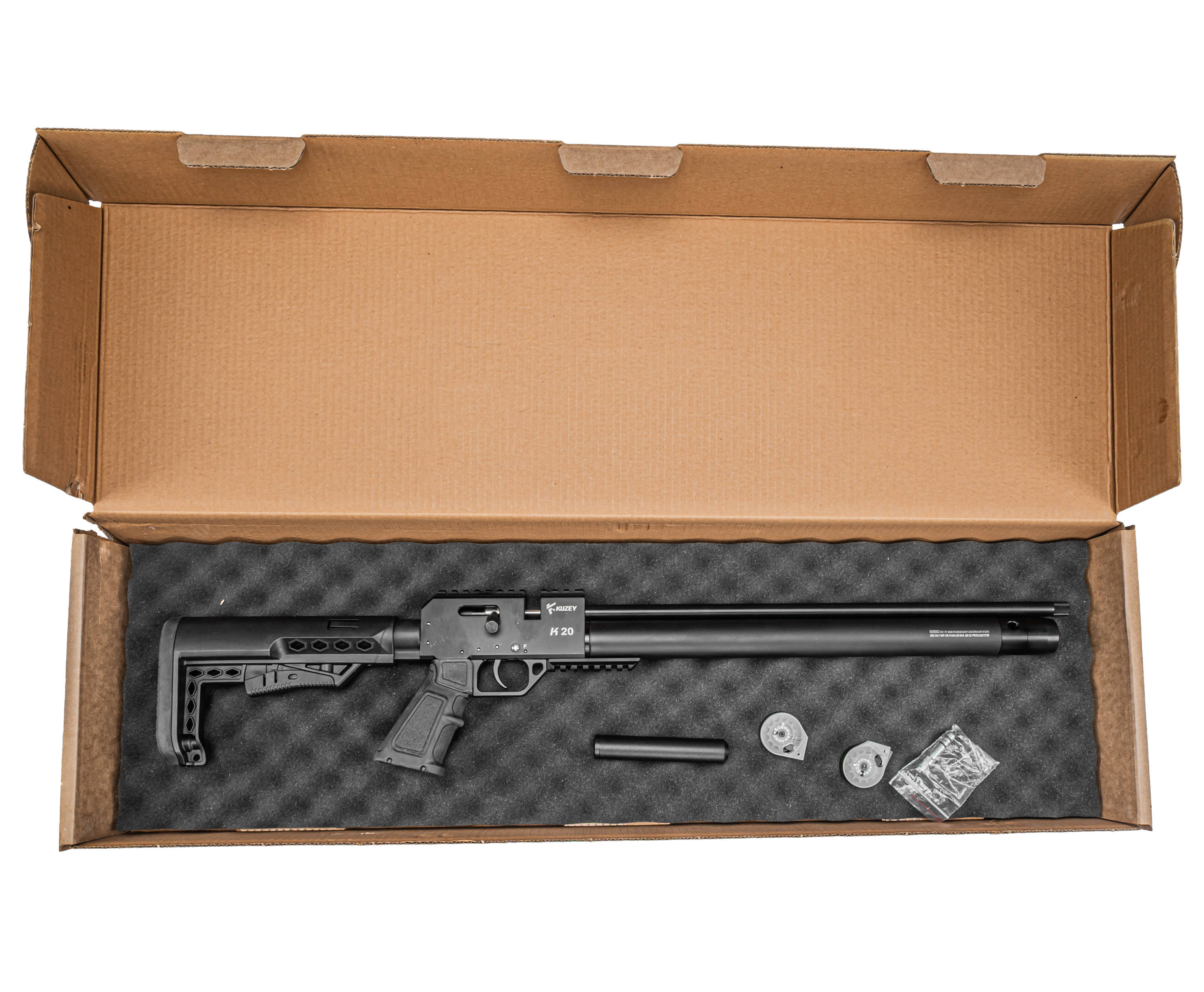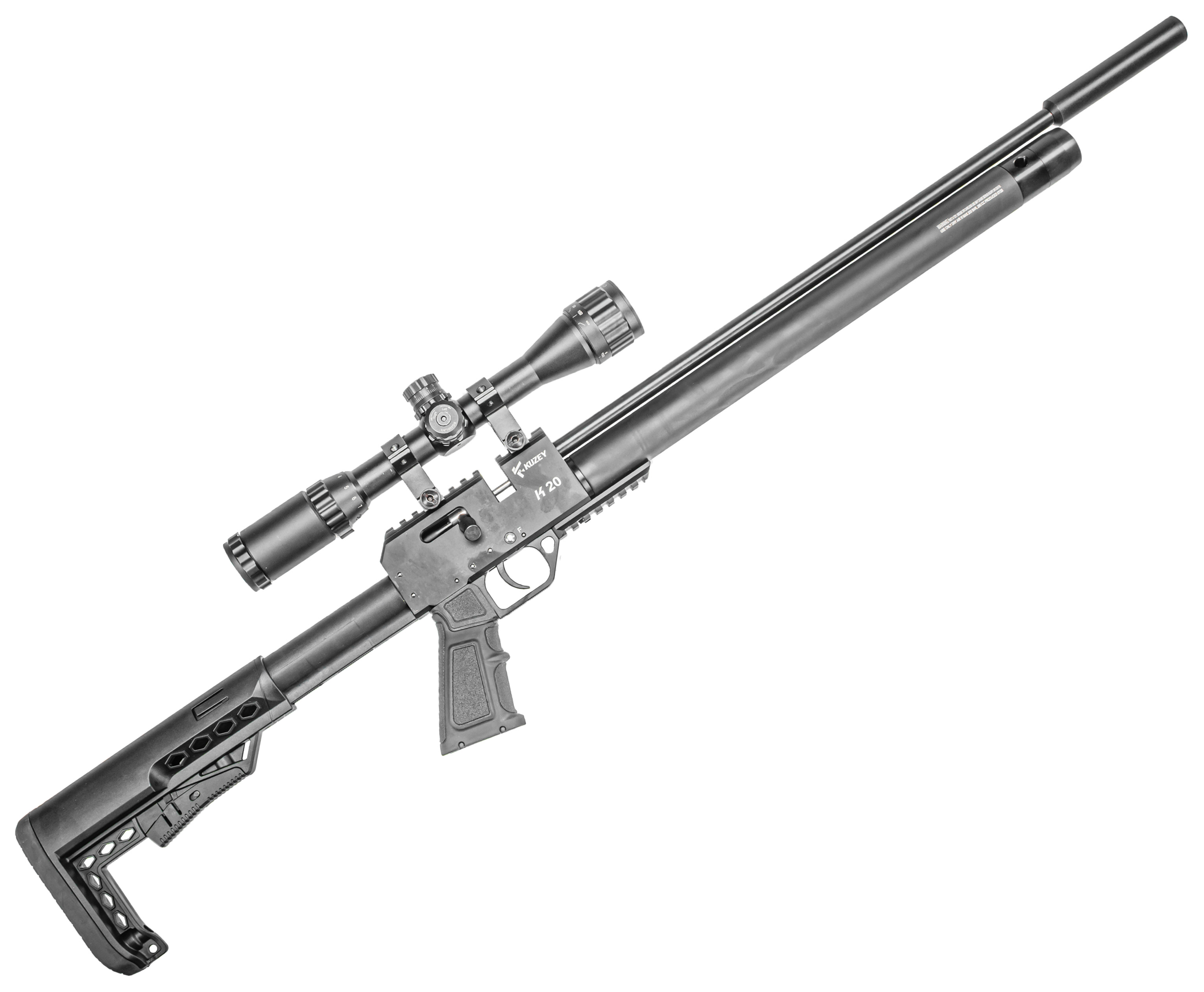 Даже с учетом установленного ствола, PCP винтовка Kuzey K20 отличается небольшими размерами 85 сантиметров. Карабин показывает приемлемую кучность боя и при этом остается максимально управляемым и комфортным в обращении. Немаловажную роль в этом сыграл современный телескопический приклад формата AR15.