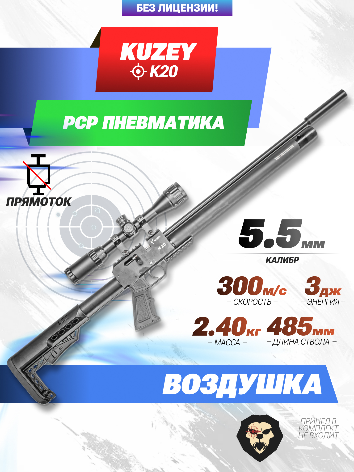 В теории пневматика Кузей для зарубежного рынка способна выпустить пулю со скоростью до 300 метров в секунду. На практике в конфигурации для российских пользователей добиться такого показателя не выйдет, так как карабины К20 поставляются с мощностью до 3 Дж. Благодаря такой особенности они доступны каждому по мере достижения возраста совершеннолетия - лицензия при этом не требуется.
