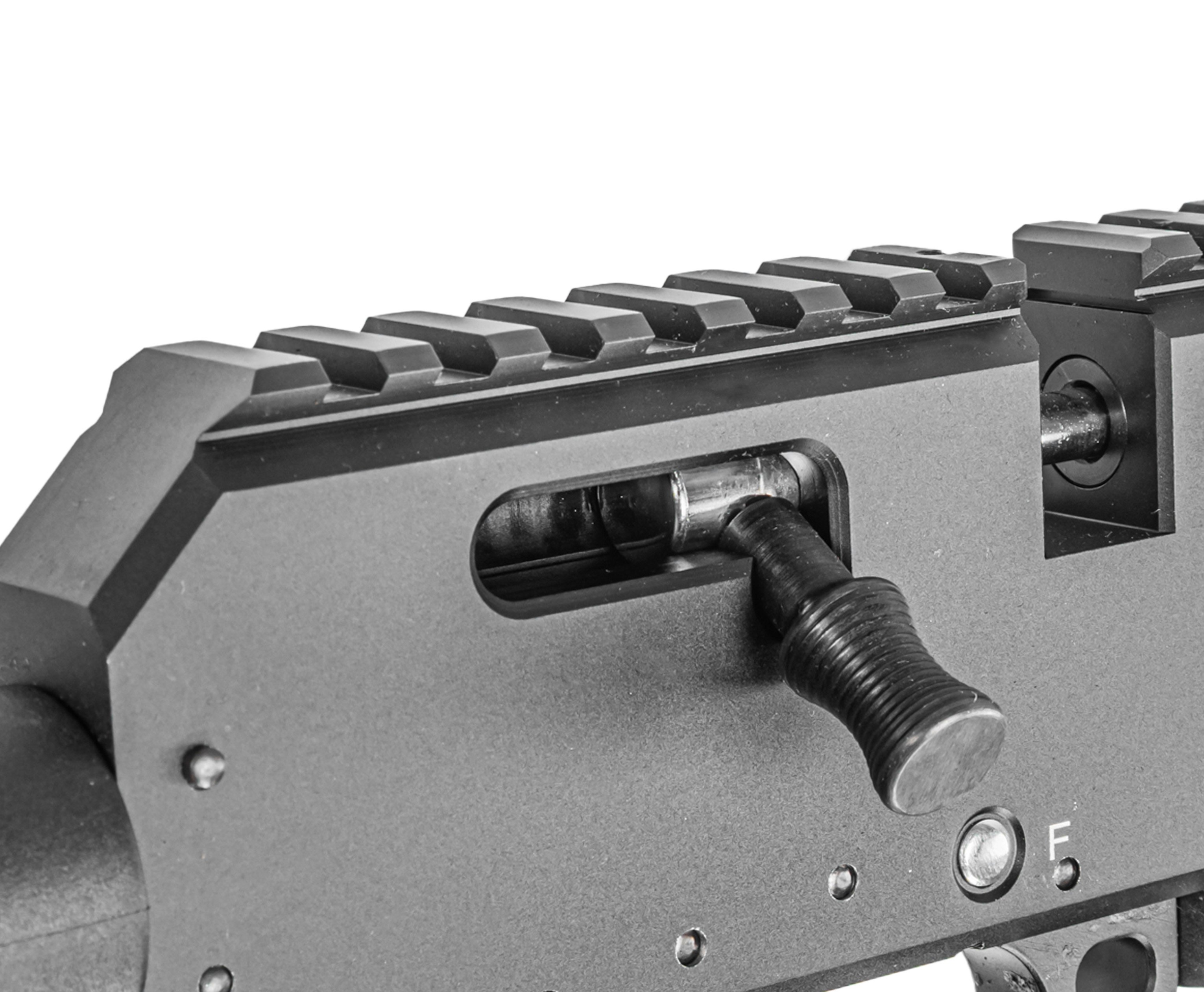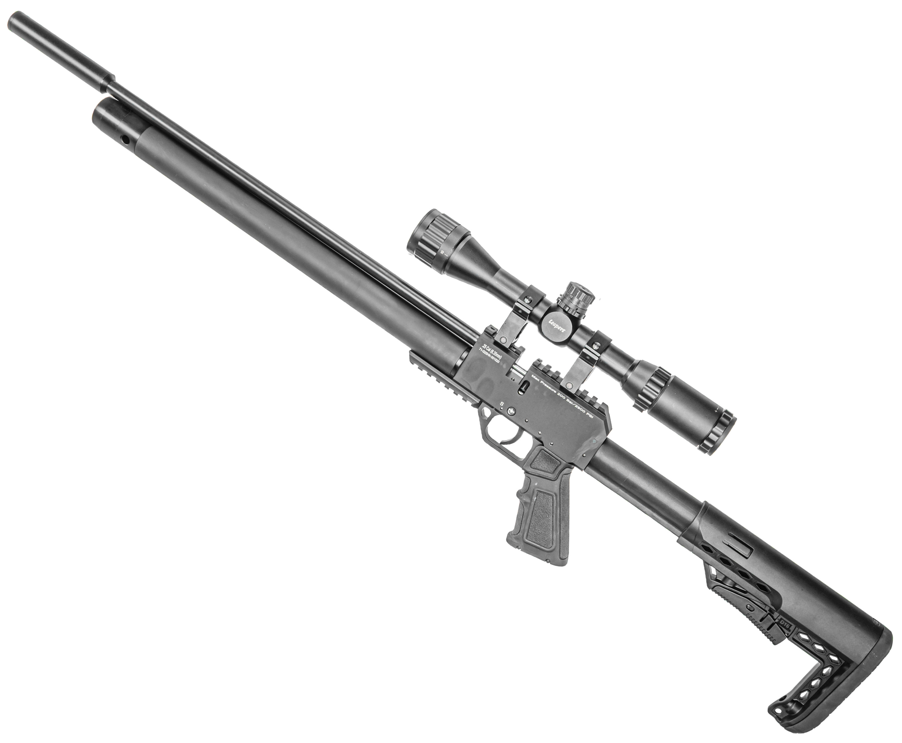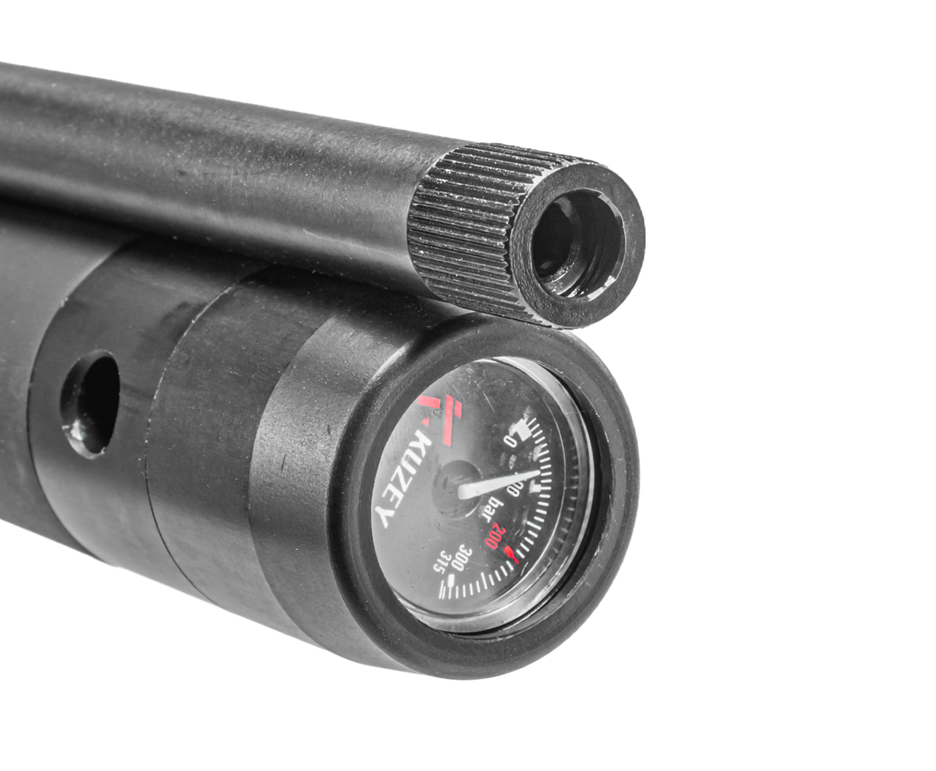 Под стволом внедрен резервуар 280 куб. см, в который нагнетается воздух, задействуя ручной или электрический насос ВД. Рекомендованное предельное значение заправки, которое оперативно контролируется манометром, составляет 200 Бар. Сама система предполагает прямоточное функционирование, а перед совершением выстрела потребуется взвести правосторонний рычаг затвора.