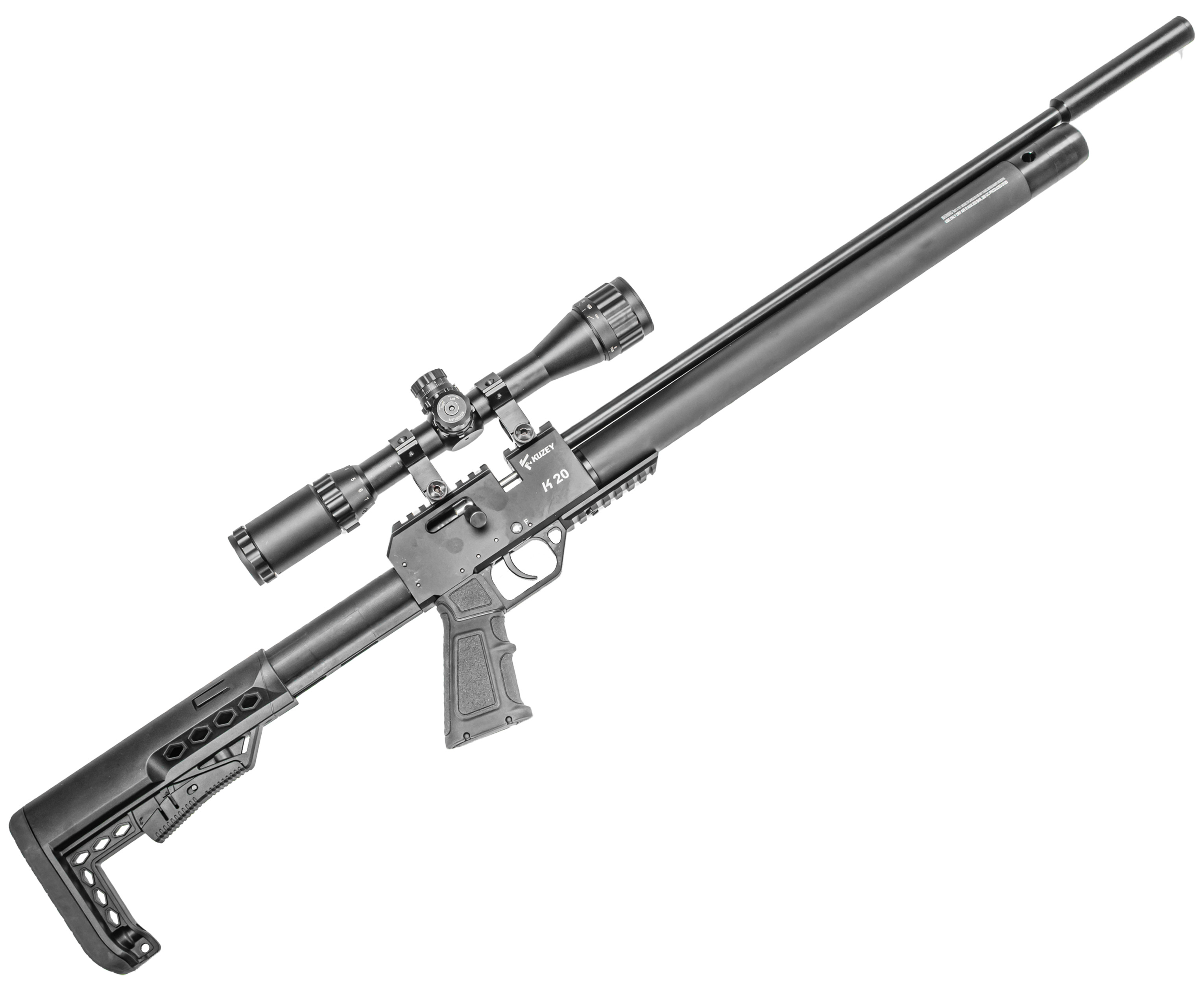 Серия К20 выполнена в классической компоновке, что не мешает стрелковым единицам быть компактными. Обозреваемое исполнение с бланком 48.5 см характеризуется общим размером 85 сантиметров. При этом такой показатель актуален в крайнем положении телескопического приклада - если его сомкнуть до упора, габарит дополнительно сокращается, что повышает удобство перевозки до тира.