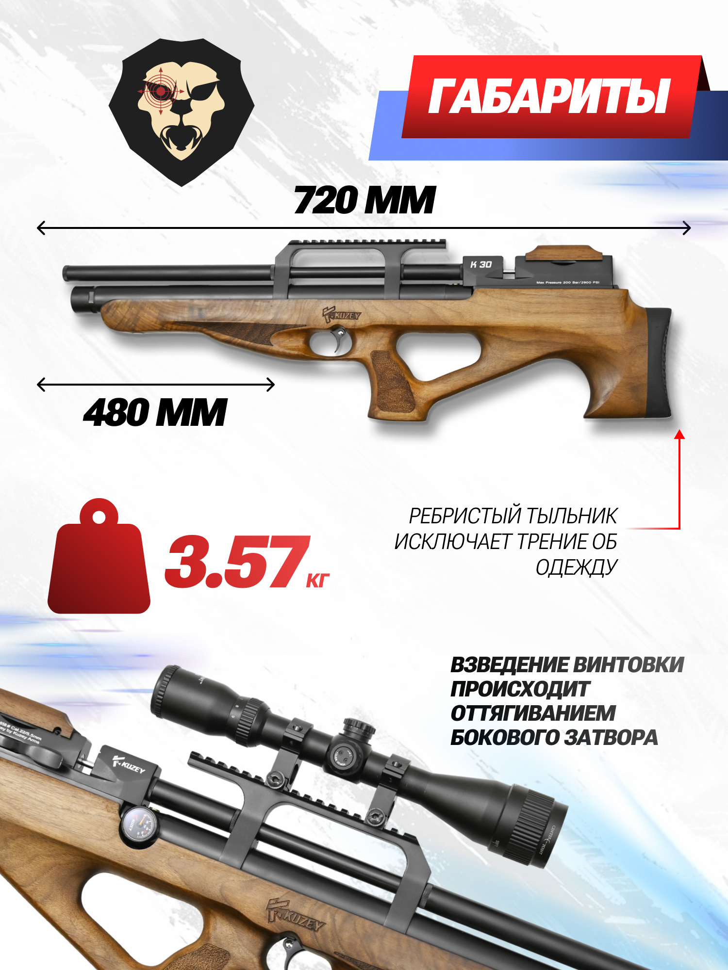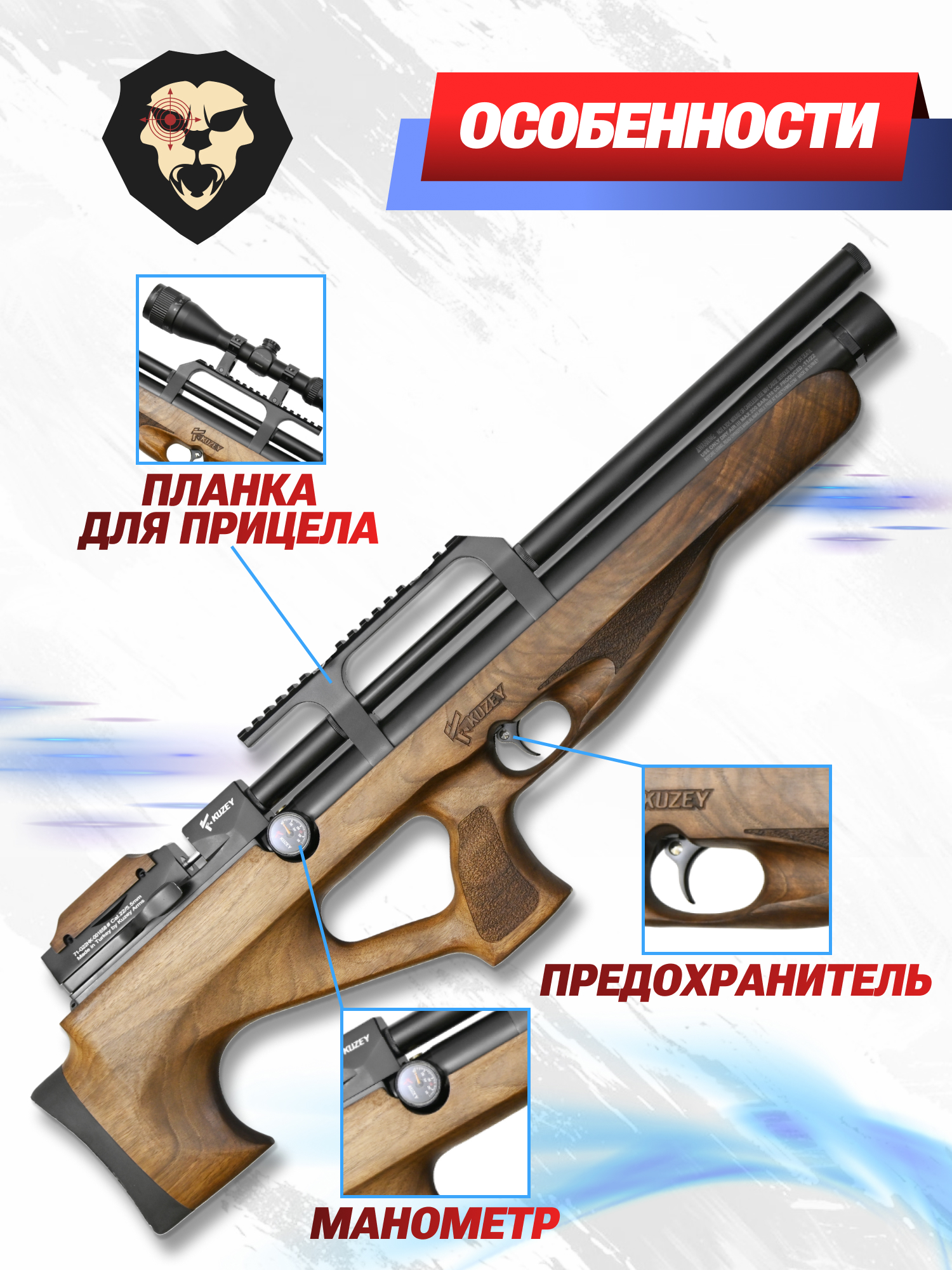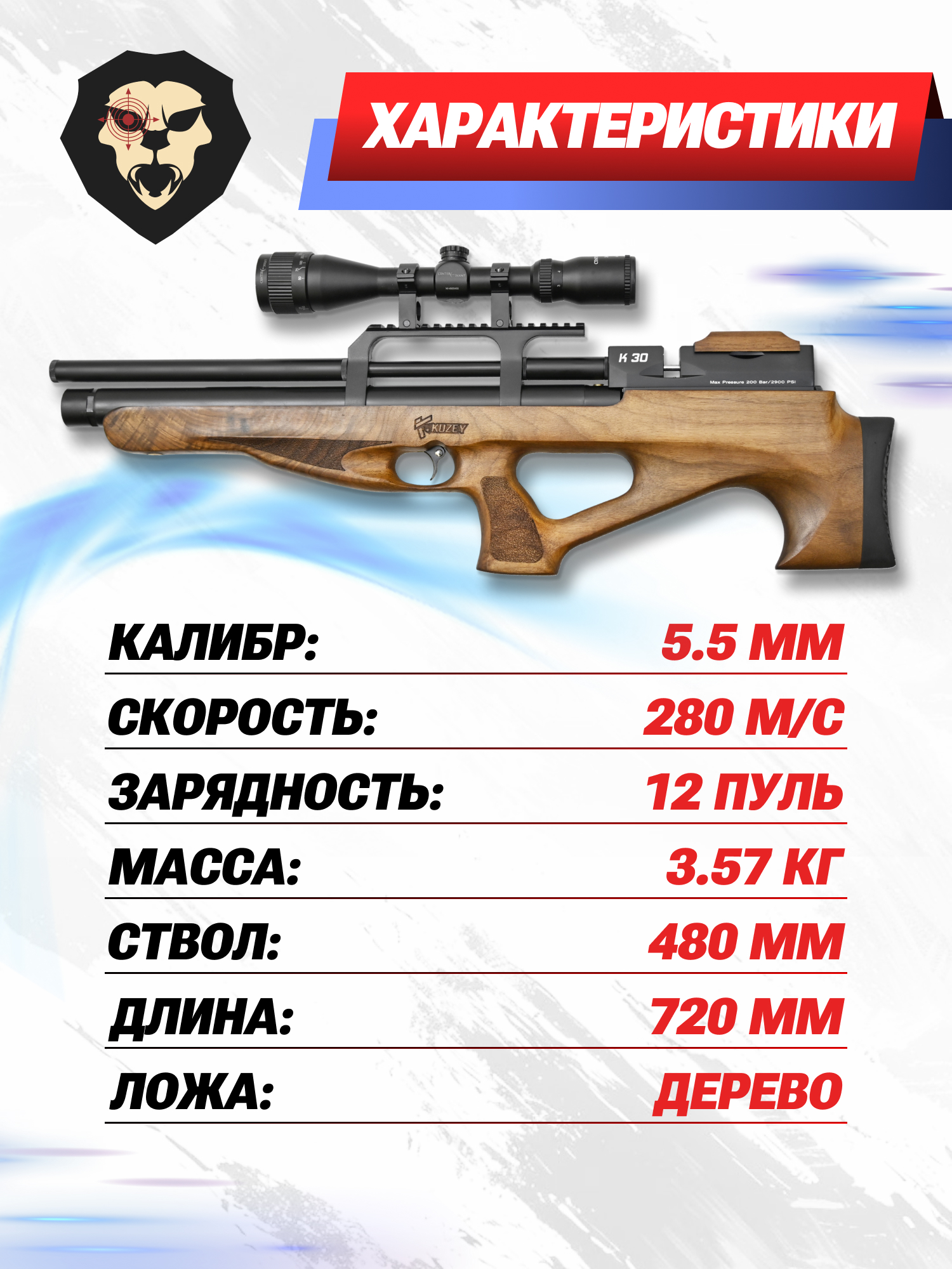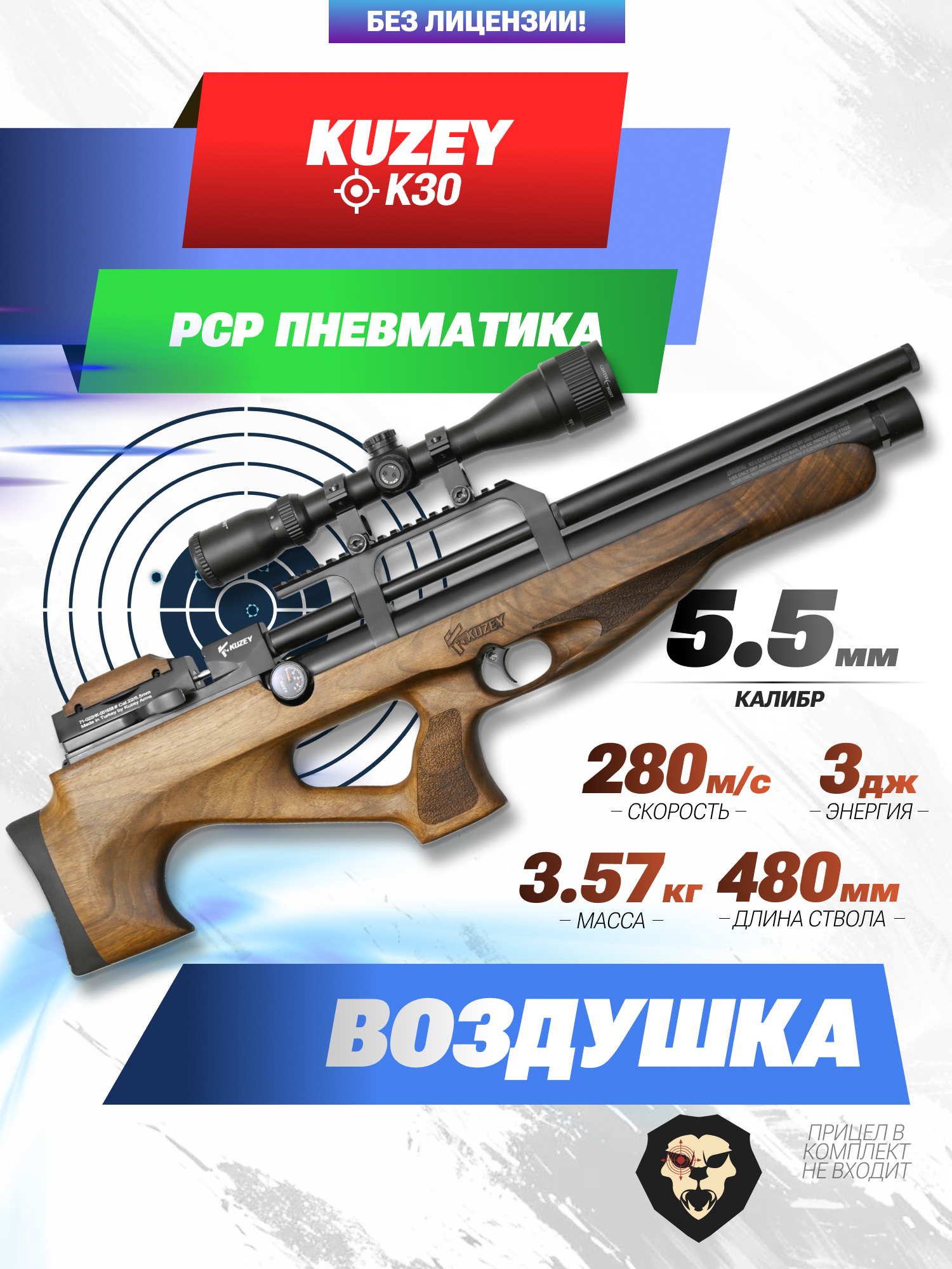 Информация о товаре "Пневматическая винтовка Kuzey K30 5.5 мм (орех, боковой взвод)" носит ознакомительный характер, и не является публичной офертой, определяемой положениями Статьи 437 Гражданского кодекса Российской Федерации, характеристики, внешний вид, цвет и комплектация могут быть изменены производителем без уведомления.