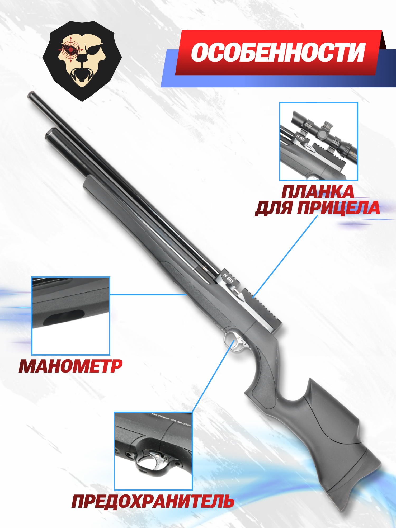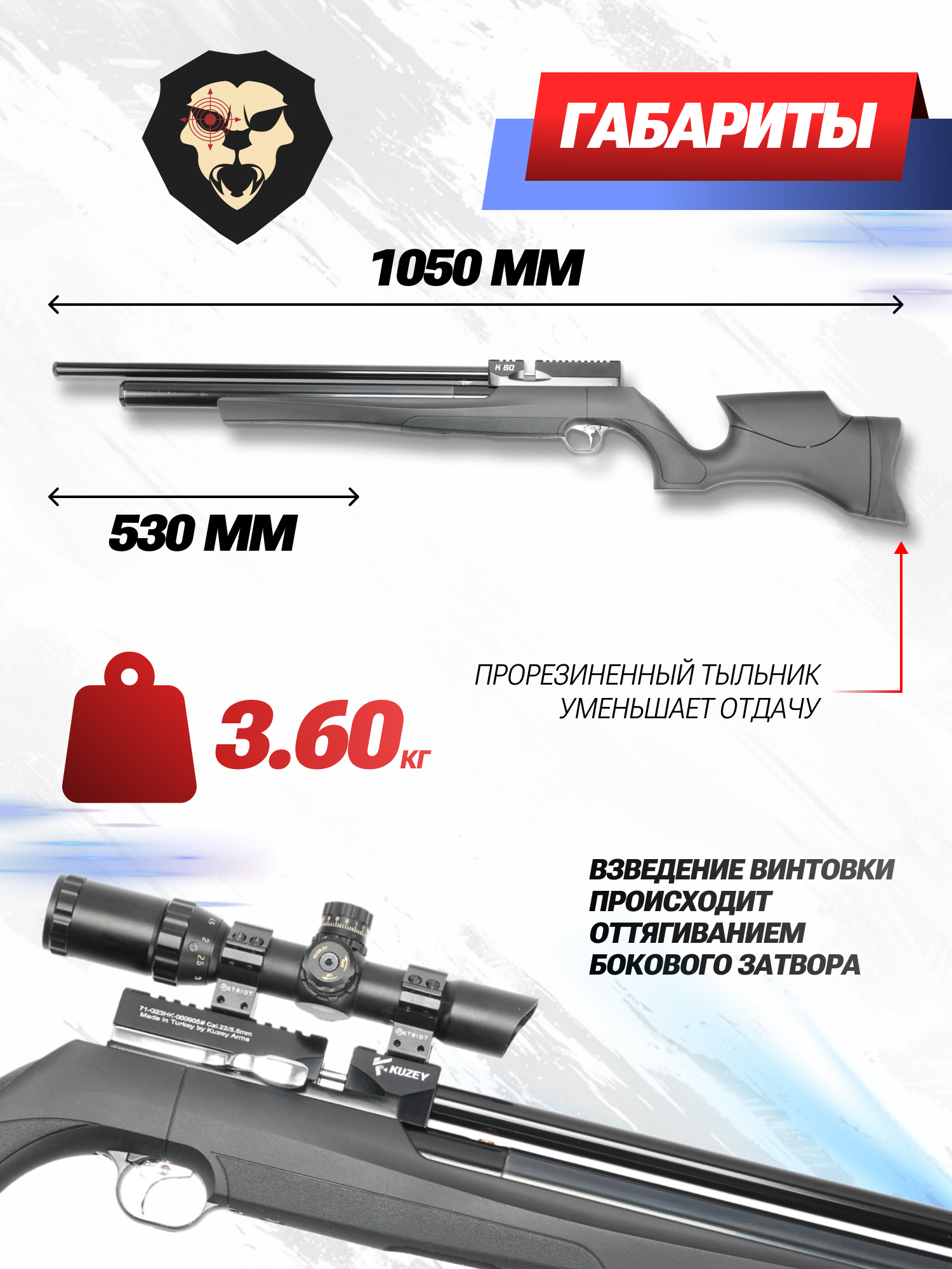 Винтовка Kuzey модели К60 также отличилась расширенным резервуаром - во встроенный ресивер входит до 310 кубических см сжатого воздуха. При этом емкость рассчитана на работу с постоянным давлением в 250 Bar. Для заправки используется быстросъемный переходник - элемент также предусмотрен комплектом.