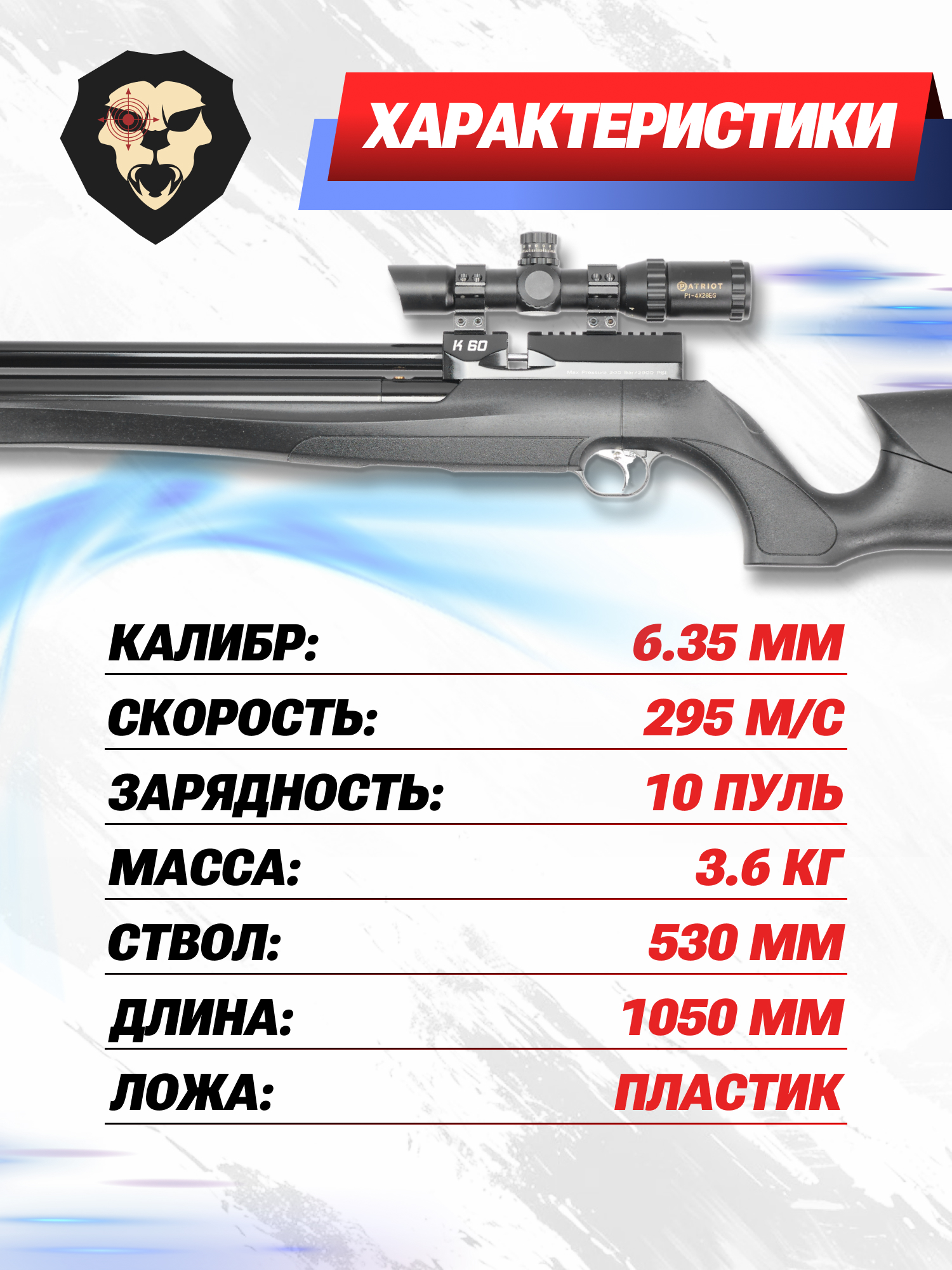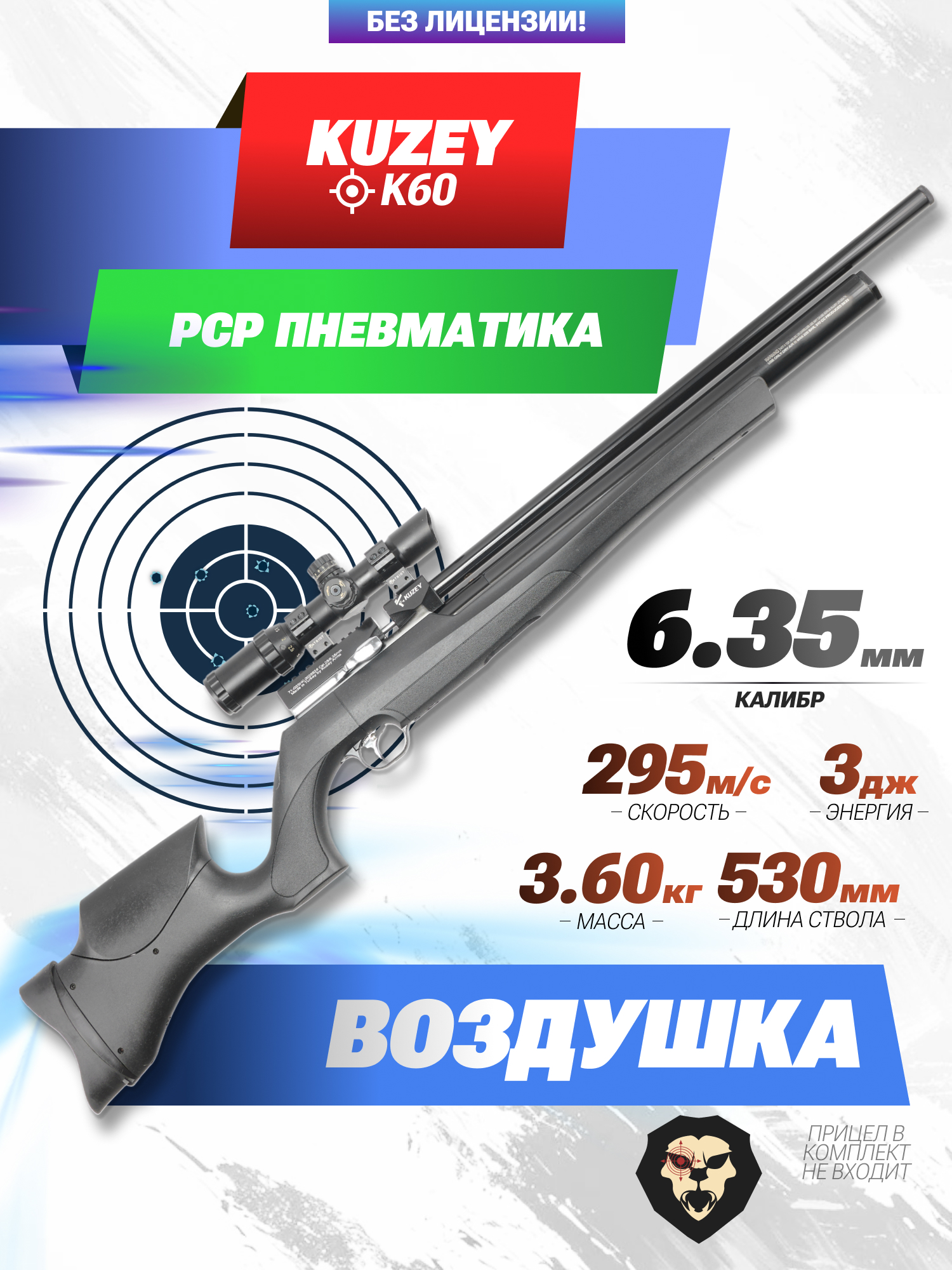 Обозреваемая пневматическая винтовка Kuzey K60 6.35 мм пластик относится к категории мощных образцов PCP оружия за счет способности разгонять свинцовую пулю при выстреле до скорости больше 295 метров в секунду, что позволяет точно поражать цели, находящиеся на больших дистанциях. При этом изготовитель обращает внимание на то, что представленное изделие приобретается свободно, не обращаясь к органам лицензионно-разрешительной работы, что достигается за счет ограничения дульной энергии в пределах трех Джоулей.