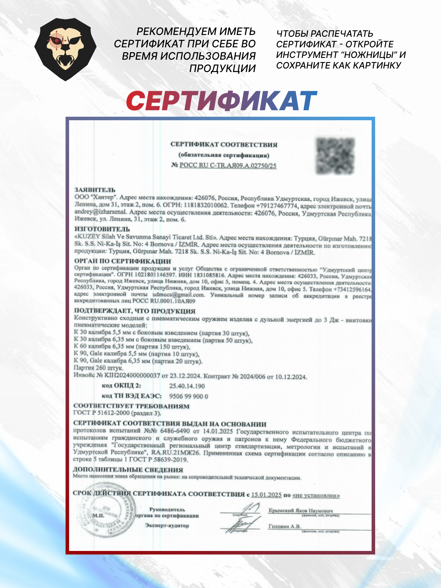Информация о товаре "Пневматическая винтовка Kuzey K60 6.35 мм (пластик)" носит ознакомительный характер, и не является публичной офертой, определяемой положениями Статьи 437 Гражданского кодекса Российской Федерации, характеристики, внешний вид, цвет и комплектация могут быть изменены производителем без уведомления.