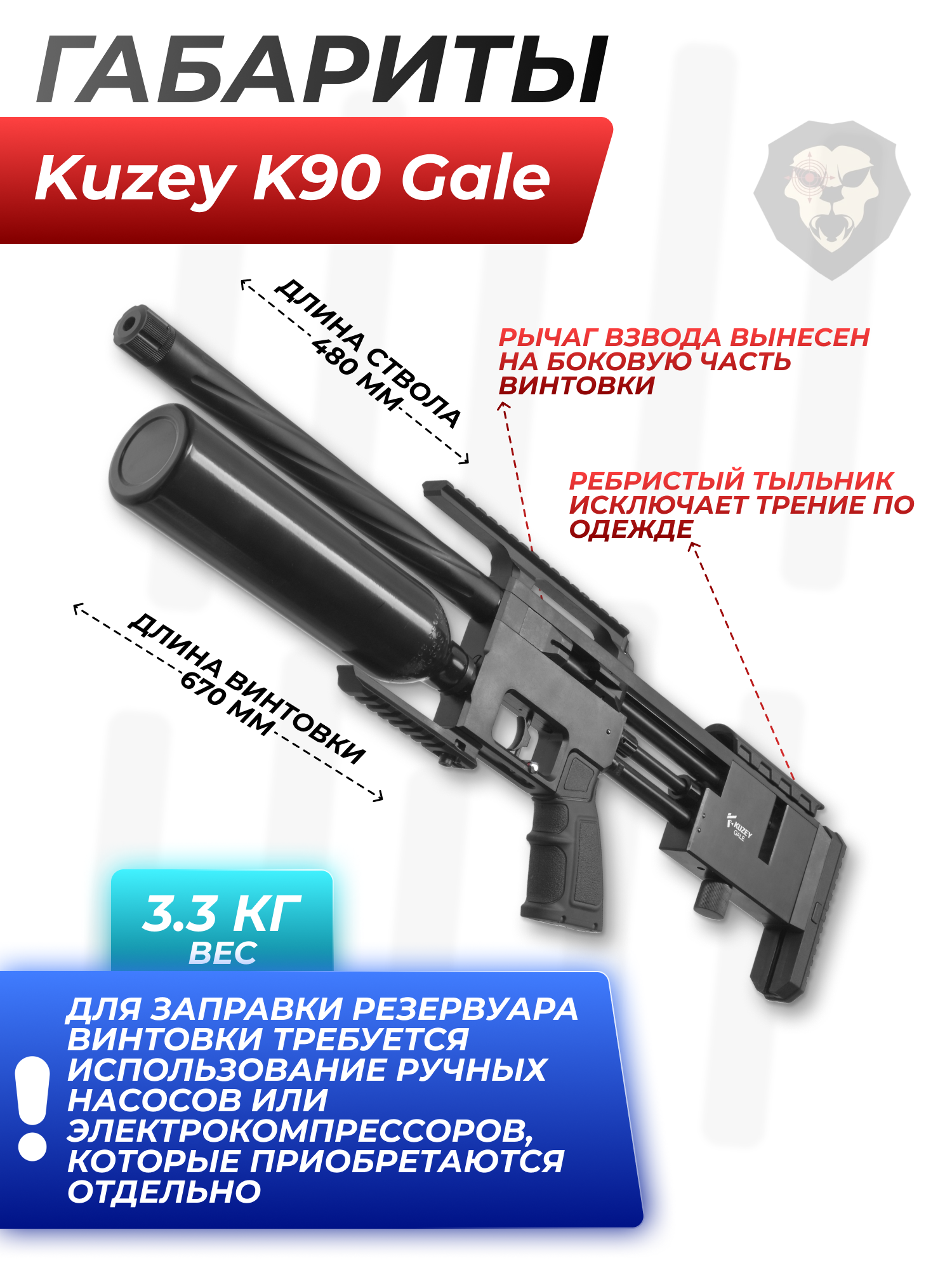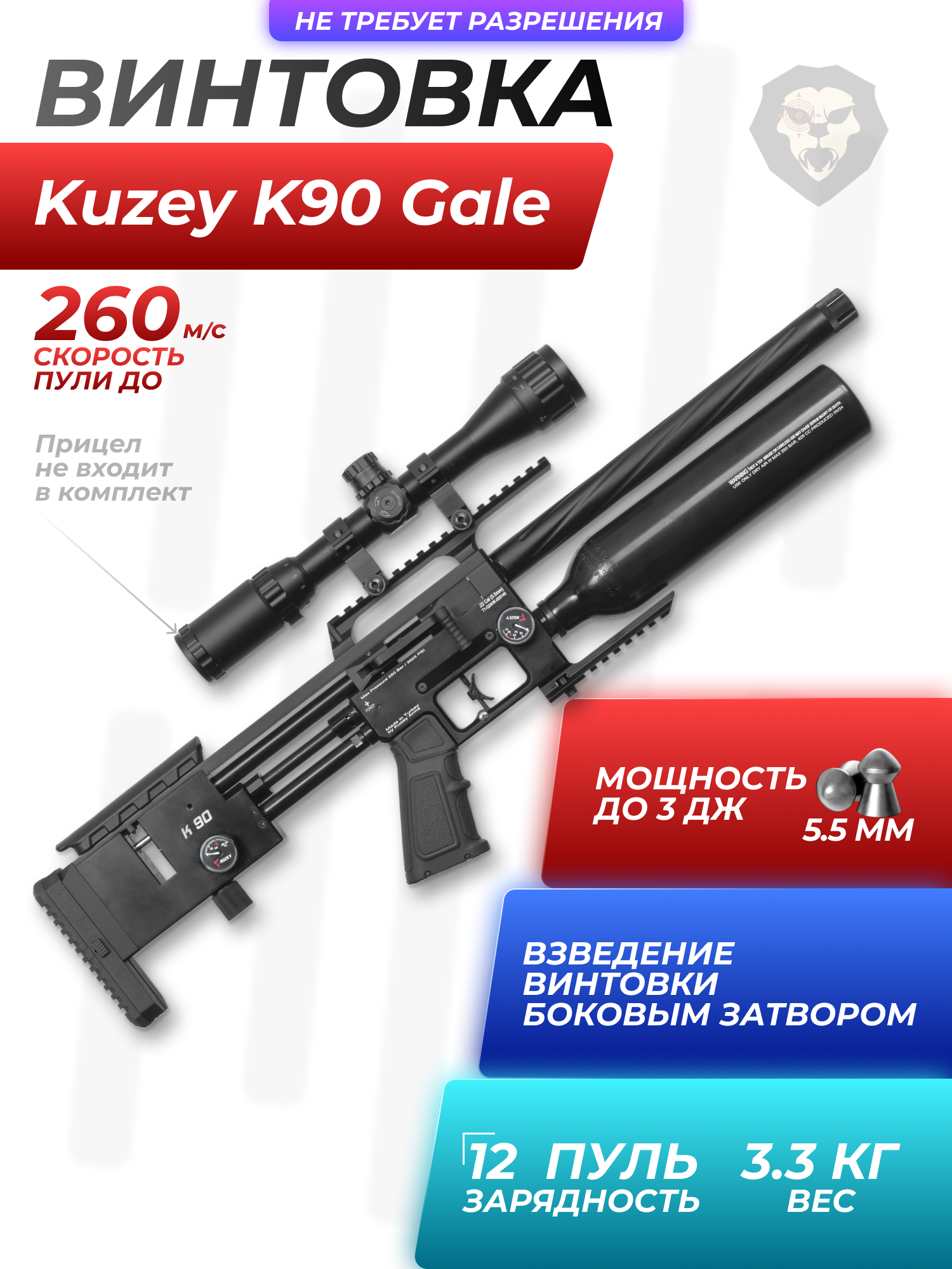 Обновляя линейку винтовок в Булл-Пап конфигурации, изготовитель выпустил Kuzey K90 Gale в калибре 5.5 мм. Многозарядная пневматика создана для стрельбы воланчиковыми пулями, снаряжаемыми в комплектный барабанный магазин. Последний рассчитан на 12 слотов и устанавливается в паз приемника со стороны приклада.