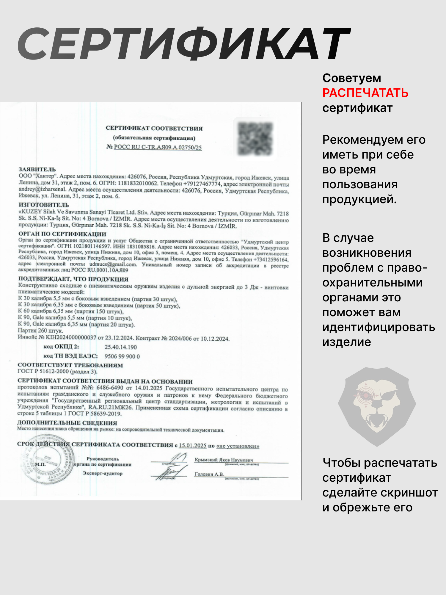Комплектация | Винтовка, магазин, упаковка, заправочный штуцер, краткая документация, копия сертификата (по запросу покупателя) |