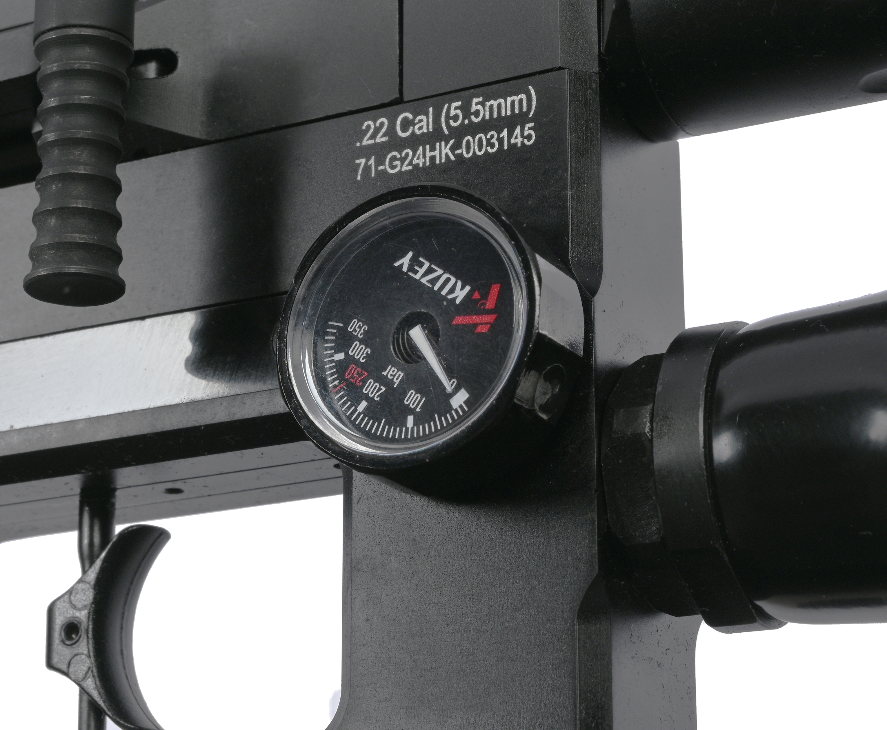 Механизм служит для самостоятельной регулировки давления пропускаемого в ствол воздуха под поставленную задачу. Для контроля значений на выходе из редуктора и ресивера предусмотрены манометры. Максимальная степень заполнения резервуара по рекомендации изготовителя - 250 Бар.