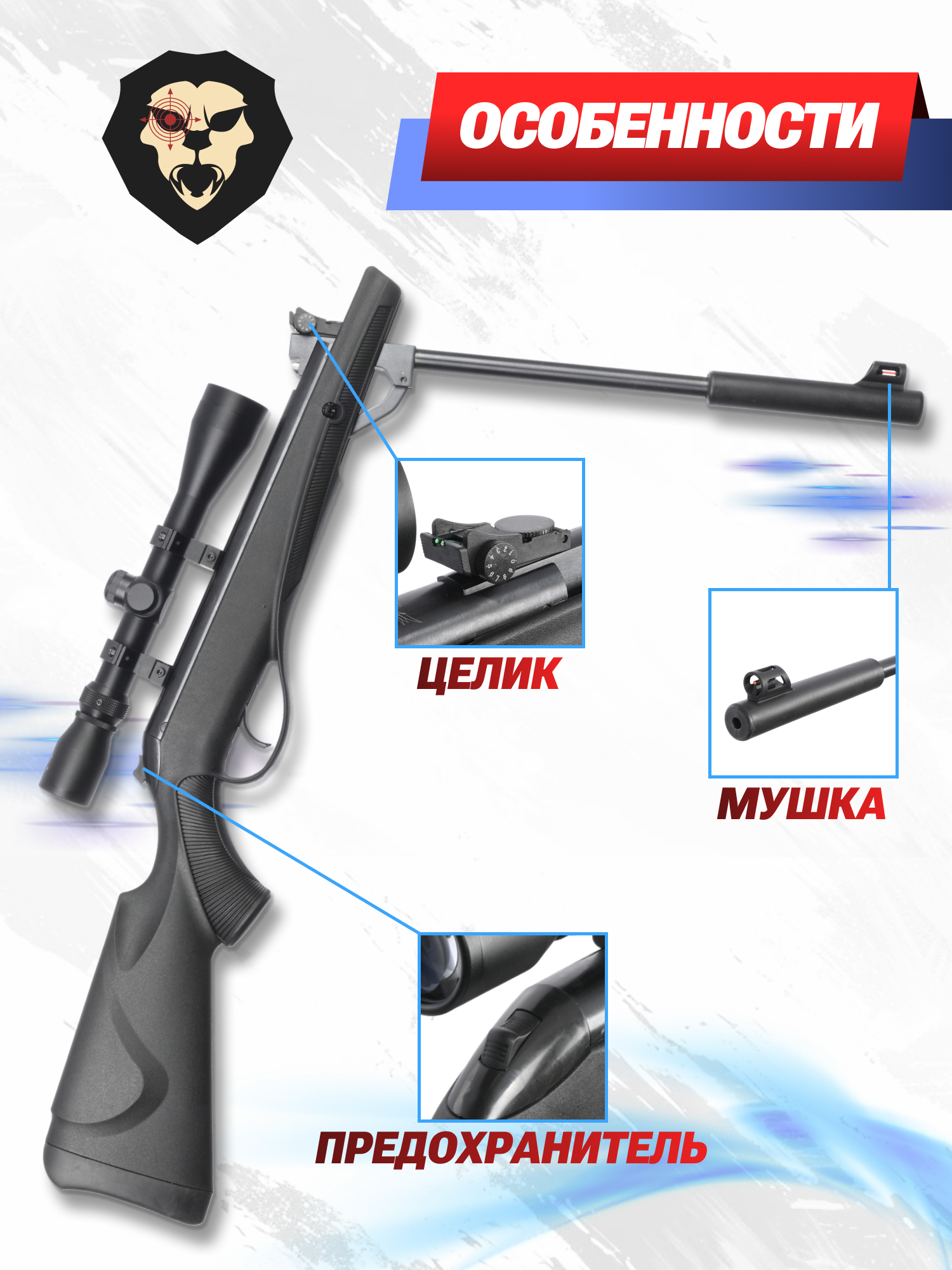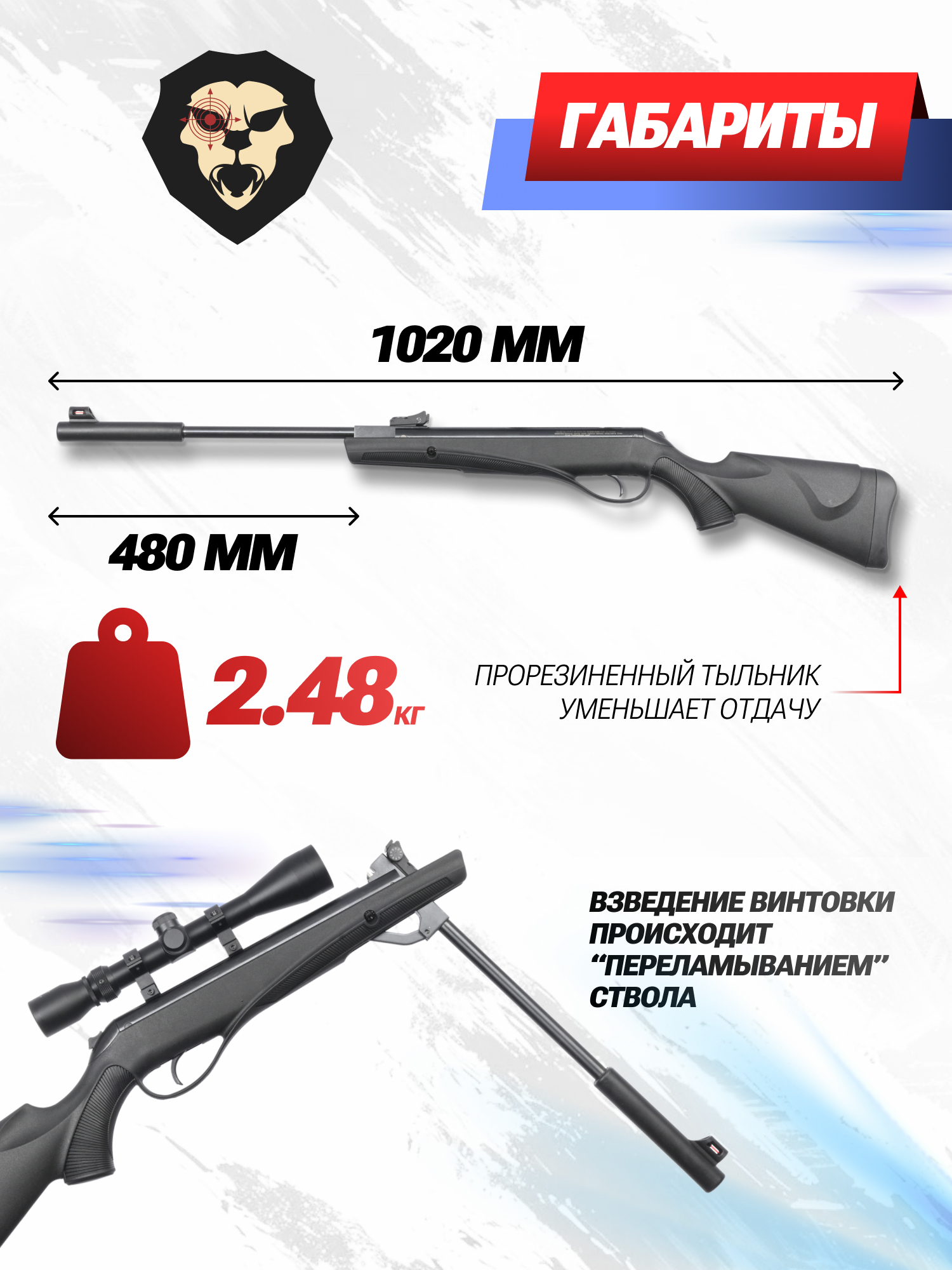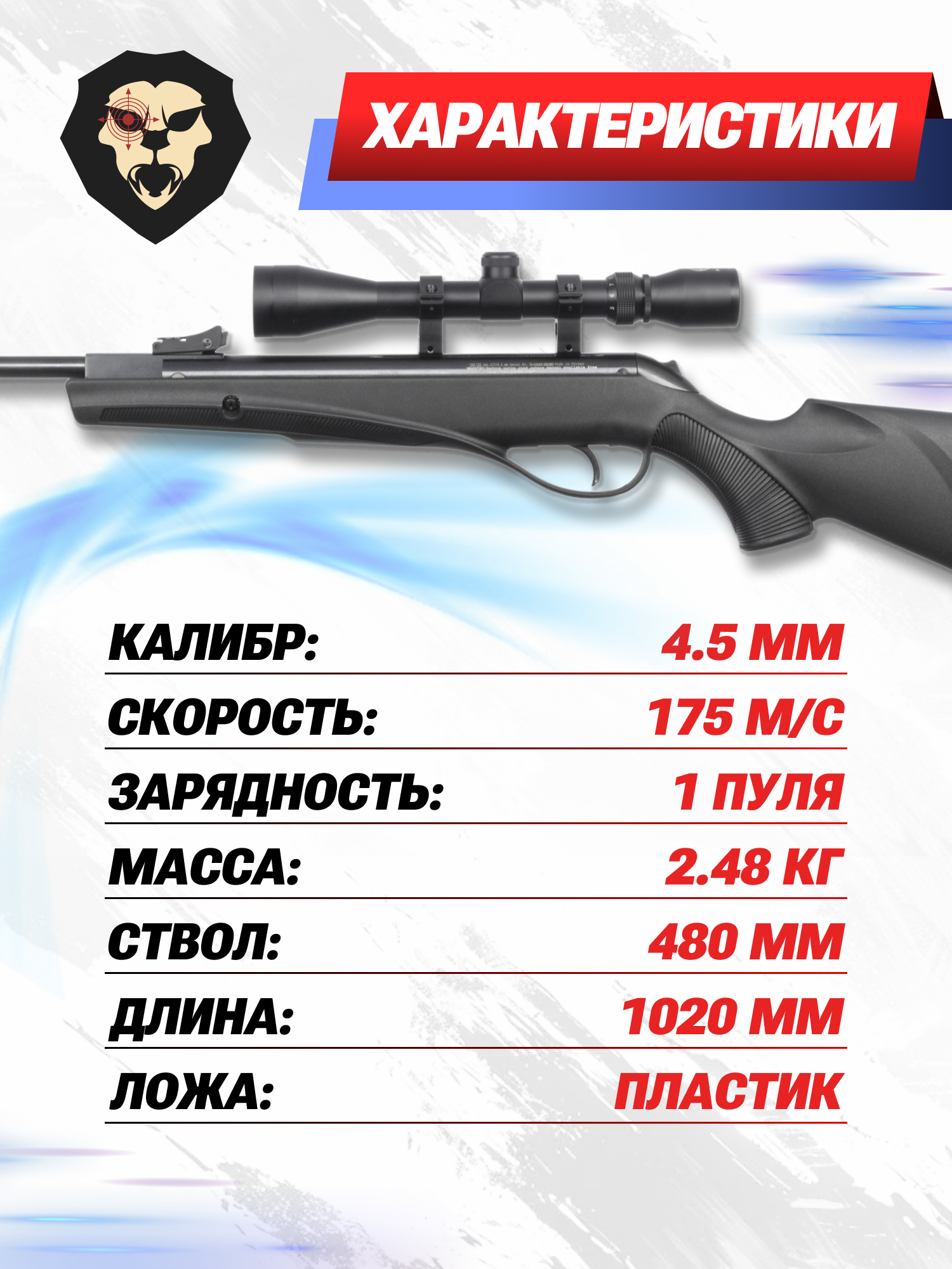 Конкретная модель под калибр 4.5 мм относится к классическим винтовкам с переламывающимся механизмом - особенность ее конструкции заключается в том, что единственным необходимым расходником для стрельбы выступает свинцовая пуля. Для ее метания используется воздух, сжимаемый поршнем с пружиной - перед выполнением выстрела требуется «переломить» ствол до крайнего положения и поместить в казенник боеприпас, после чего вернуть бланк в исходное состояние.