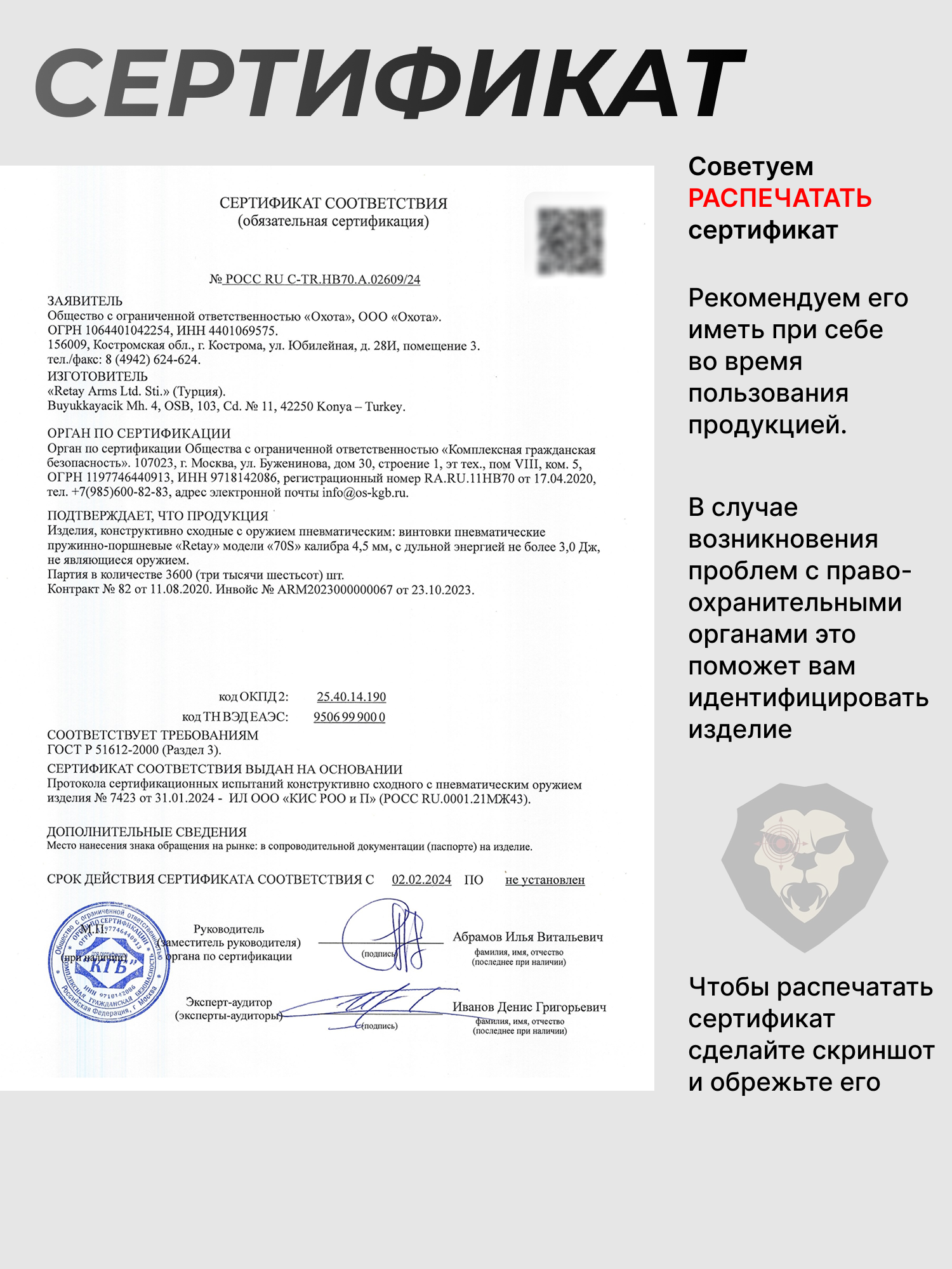 Информация о товаре "Пневматическая винтовка Retay 70S 4.5 мм подарочный набор Hunter №4 (прицел, кольца, чехол, набор для чистки, мишени, пули)" носит ознакомительный характер, и не является публичной офертой, определяемой положениями Статьи 437 Гражданского кодекса Российской Федерации, характеристики, внешний вид, цвет и комплектация могут быть изменены производителем без уведомления.
