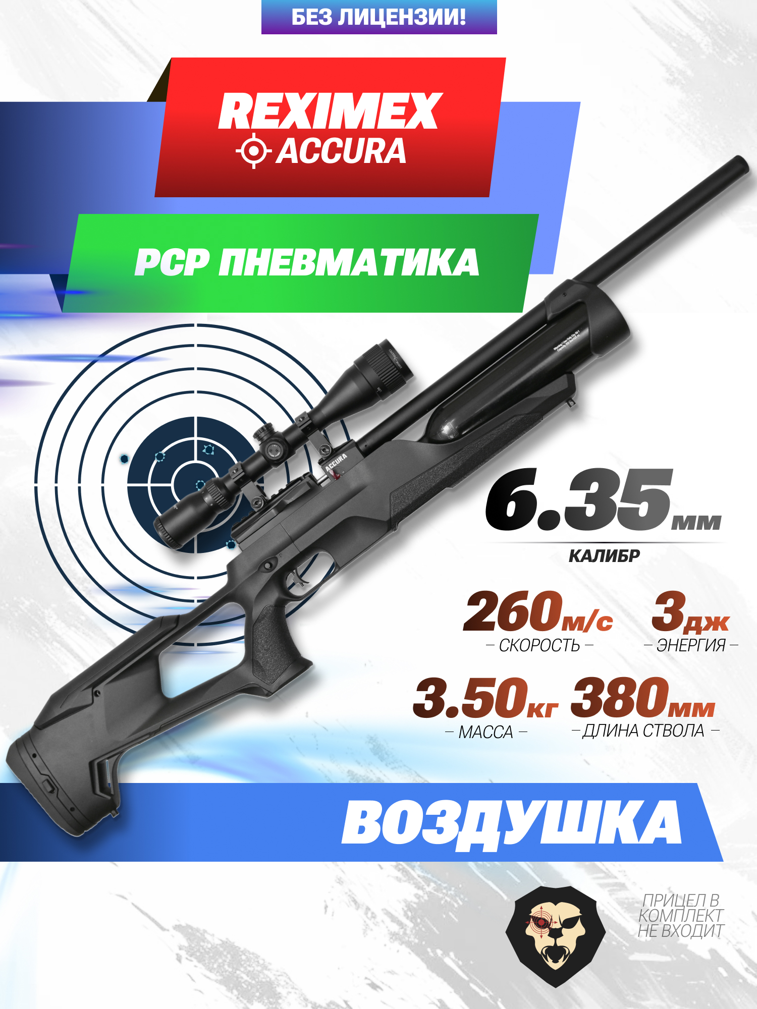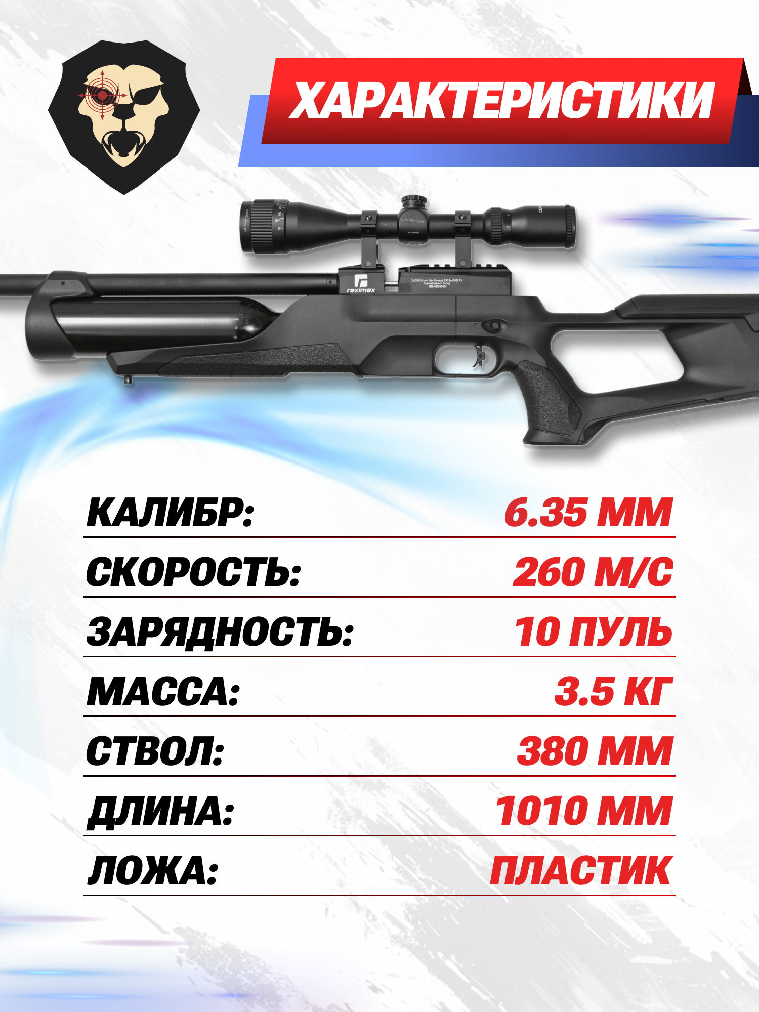 Информация о товаре "Пневматическая винтовка Reximex Accura 6.35 мм (3 Дж, пластик)" носит ознакомительный характер, и не является публичной офертой, определяемой положениями Статьи 437 Гражданского кодекса Российской Федерации, характеристики, внешний вид, цвет и комплектация могут быть изменены производителем без уведомления.