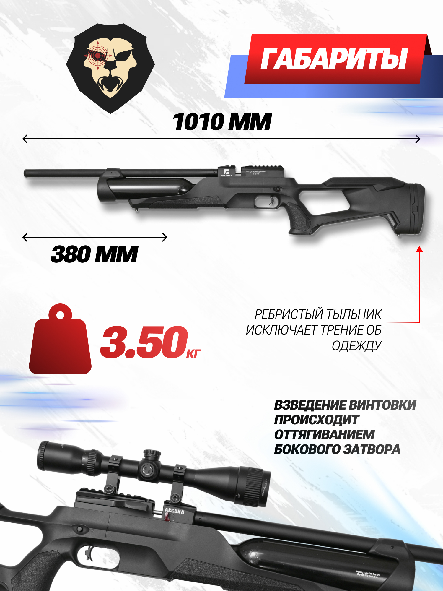 Оружию от Reximex присуща уникальная особенность - изделия сохраняют эргономичность и комфорт работы даже в исполнениях с расширенными характеристиками. Это же справедливо и для модели Аккура - будучи оснащенным колбой образец остается удобным в прикладке и переноске.