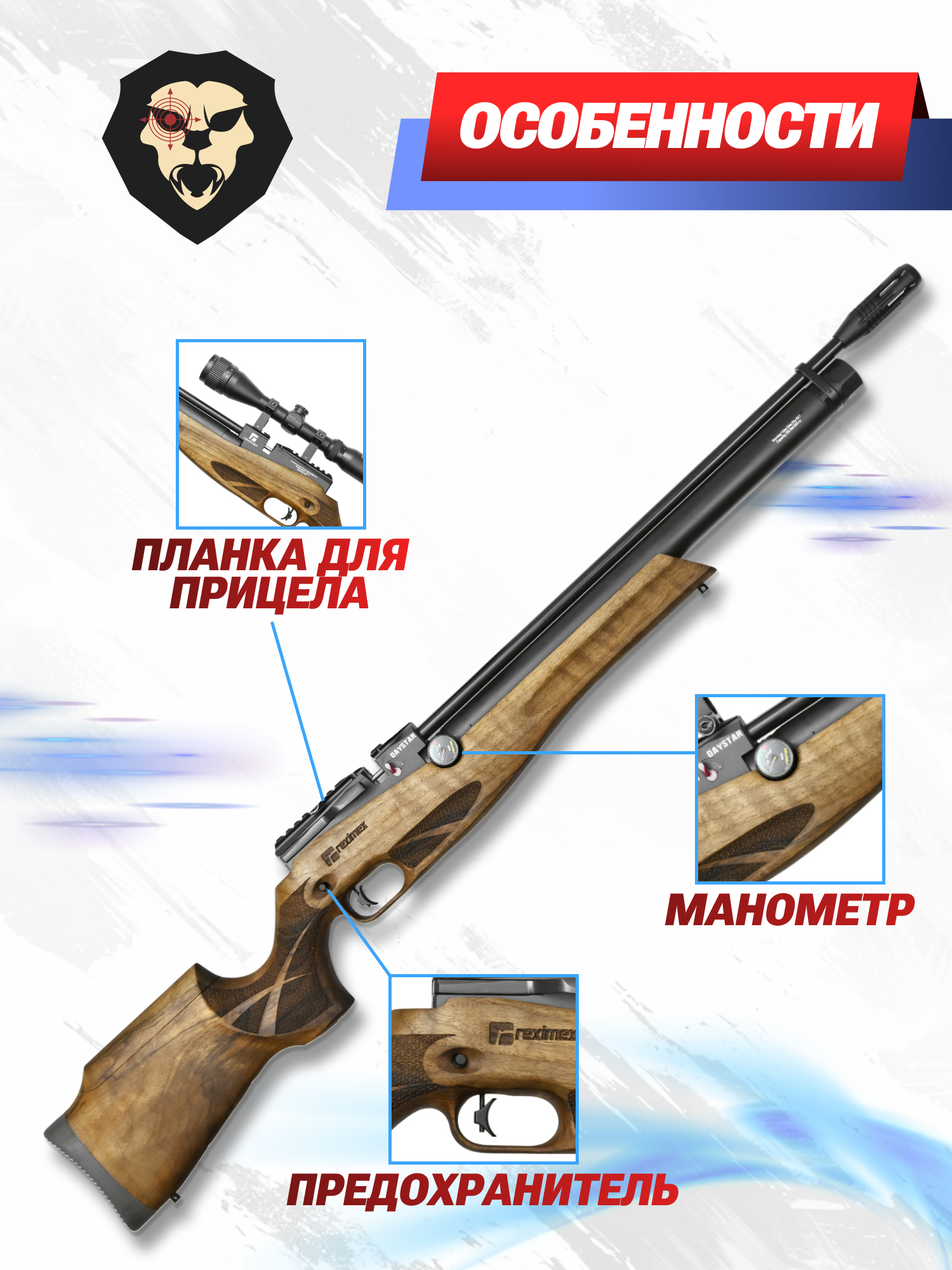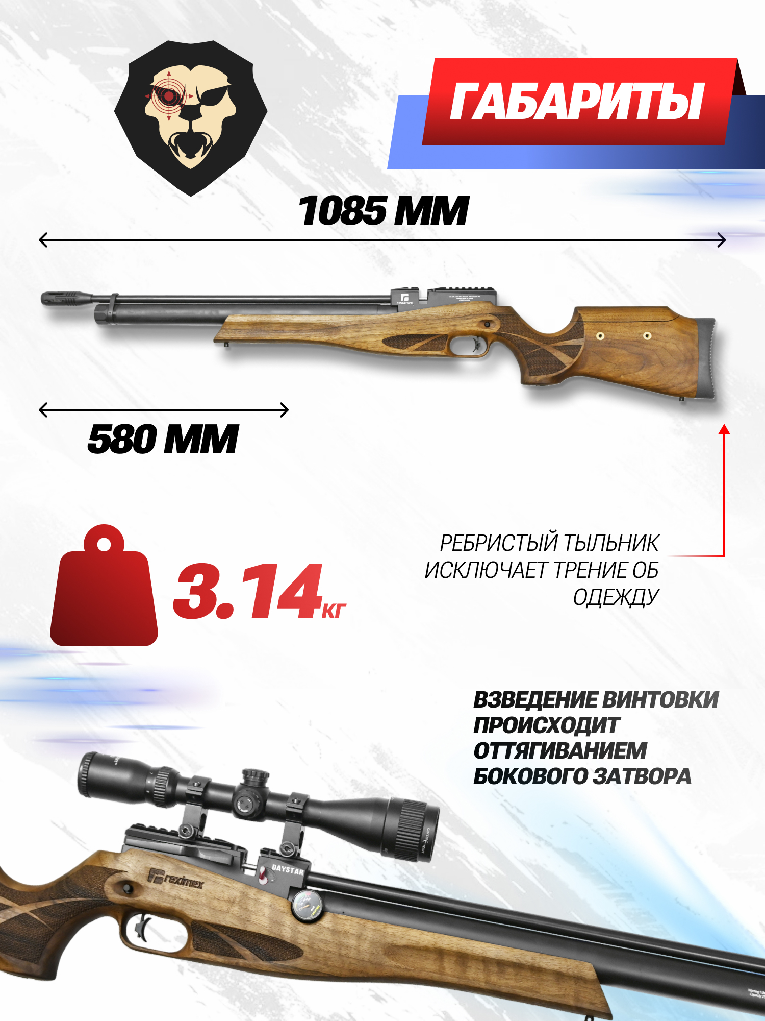 Новая винтовка Reximex выпускается в исполнении с деревянной ложей в классической компоновке. Оружие с таким видом однозначно придется по вкусу ценителям пневматических PCP винтовок. Деревянная ложа выполнена с учетом эргономичных форм, задача которых заключается в повышении уровня комфортного использования винтовки.