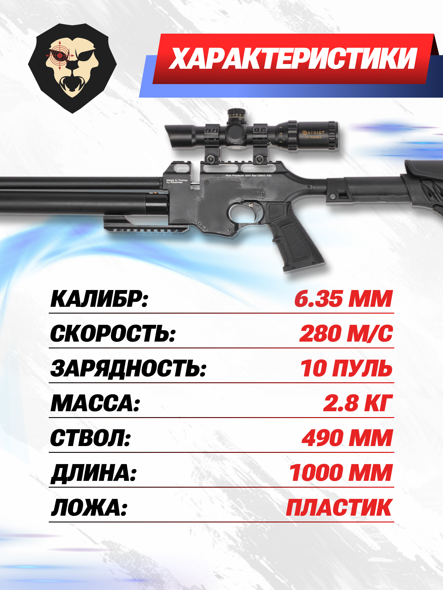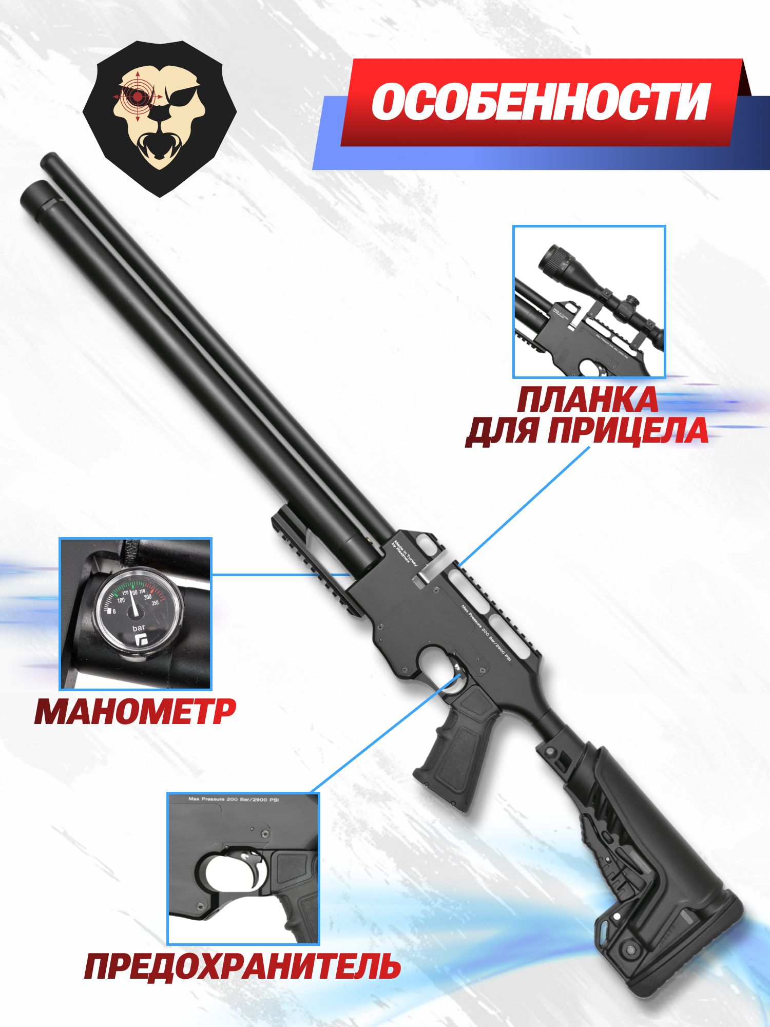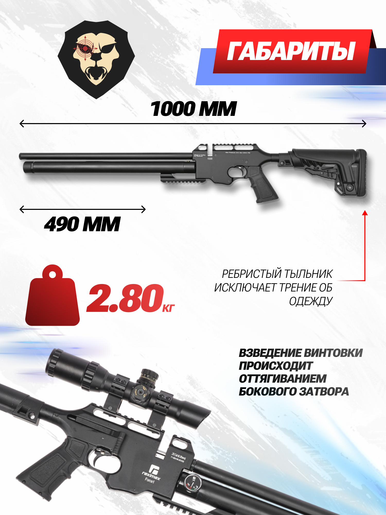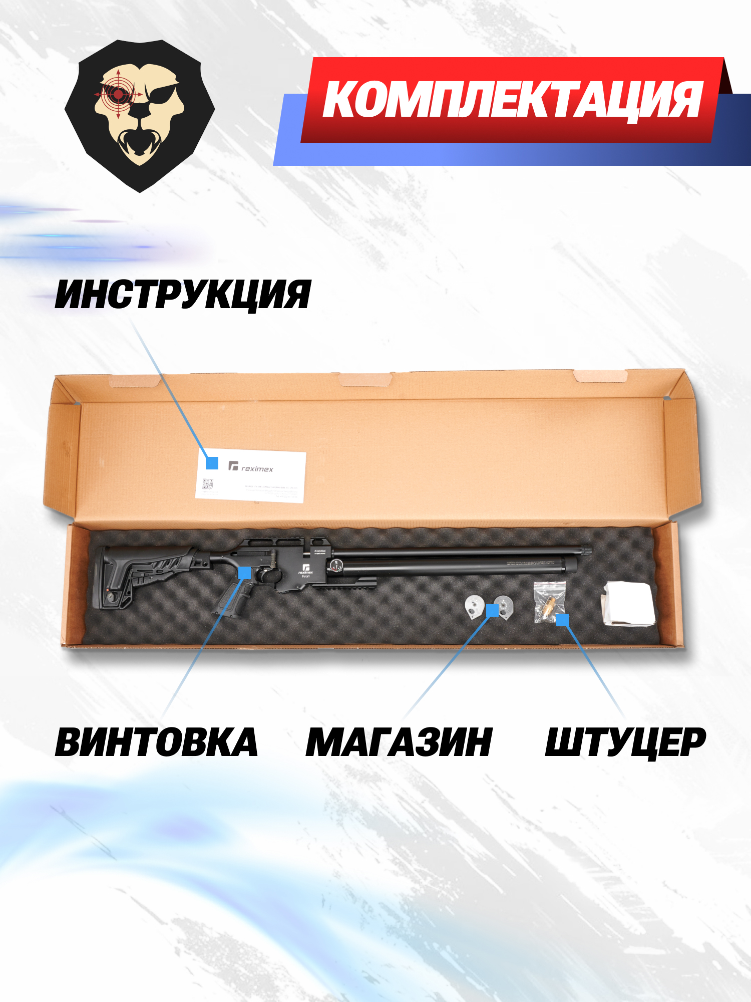 | Комплектация | Винтовка, упаковка, заправочный штуцер, набор уплотнителей, два магазина, краткая документация, копия сертификата (по запросу покупателя) |