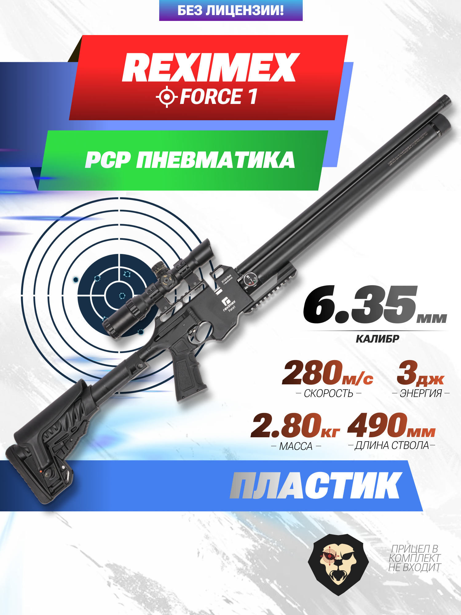 Оригинальная PCP Reximex Force1 кал 6.35 мм со стволом 490 мм способна выдавать скорость до 290 метров в секунду. Российский вариант намерено ослаблен до мощности в три Джоуля — исходя из правил легализации пневматики этого калибра.