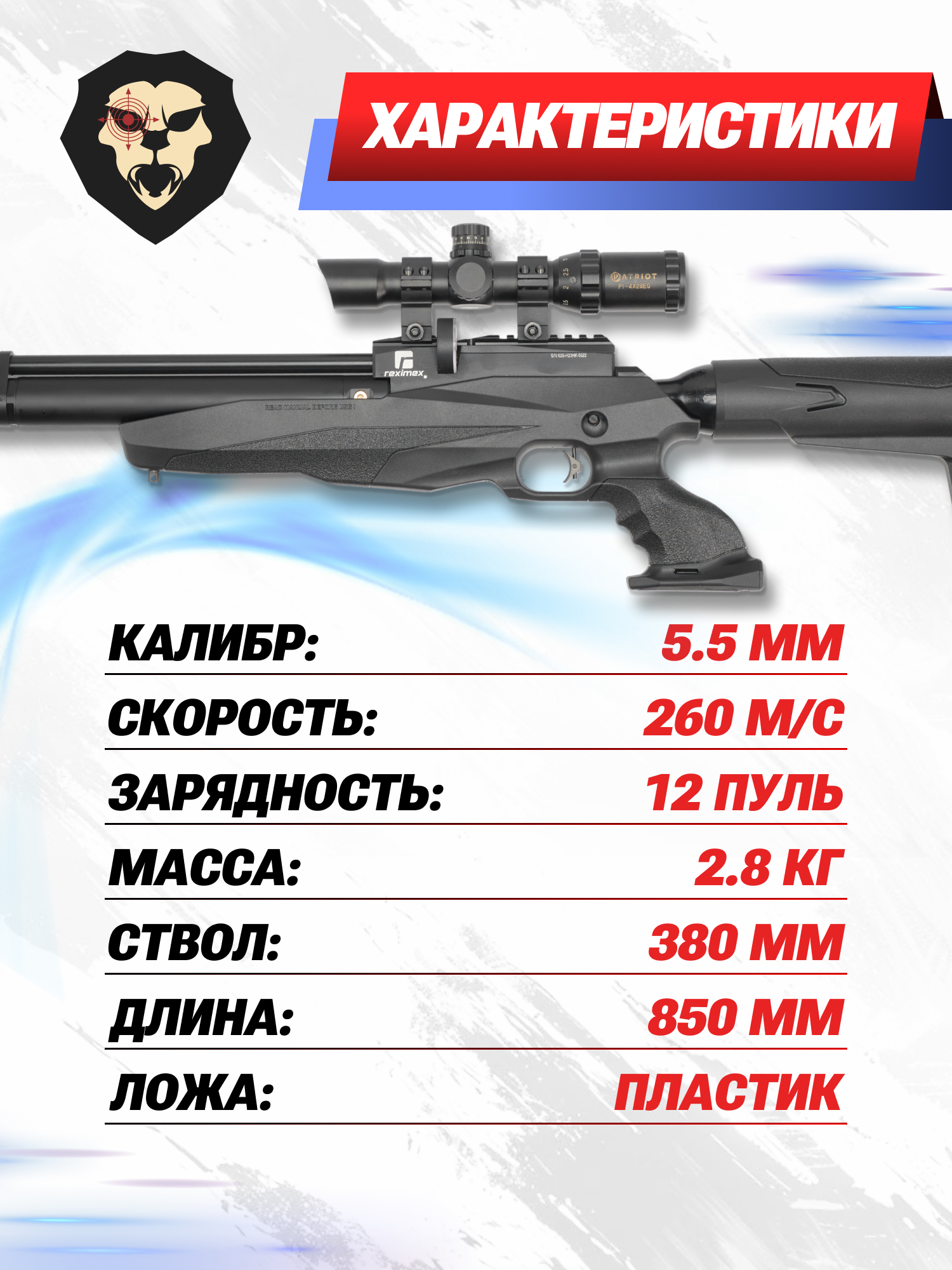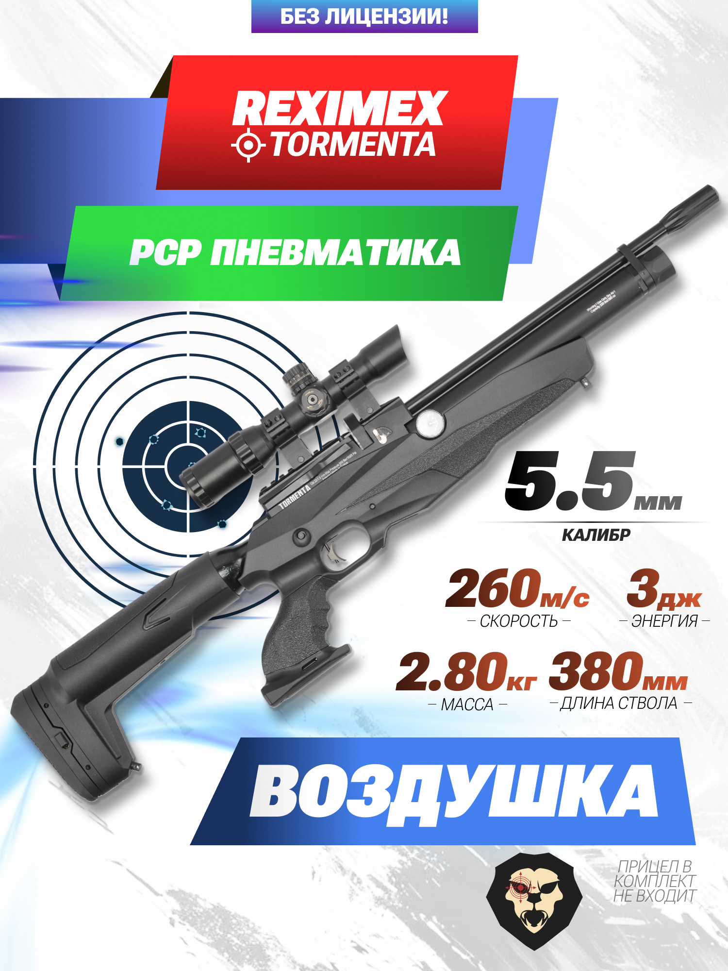 Reximex Tormenta пневматическая винтовка, которая выпукается под пули в калибре 5.5 миллиметров. Возможность использовать полнотелки и воланчиковые пульки доступна благодаря наличию нарезного ствола с длиной 380 миллиметров.