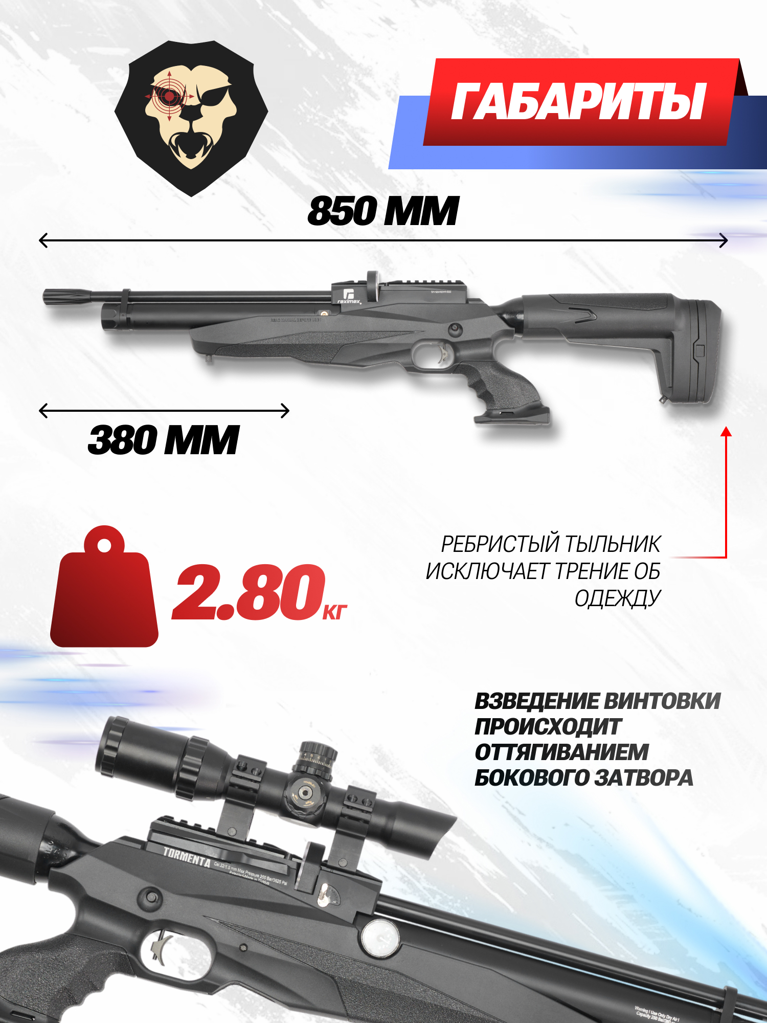 Новой винтовкой, представленной турецкой фирмой, стала пневматическая многозарядная PCP Reximex Tormenta. ПЦП воздушка небольшими размерами и умеренным весом, который дает использовать винтовку даже начинающим молодым стрелкам. Даже в классической винтовочной компоновке полная длина воздушки составляет 850 миллиметров, что делает турецкую винтовку наиболее подходящей для стрельбы в условиях ограниченного пространства.