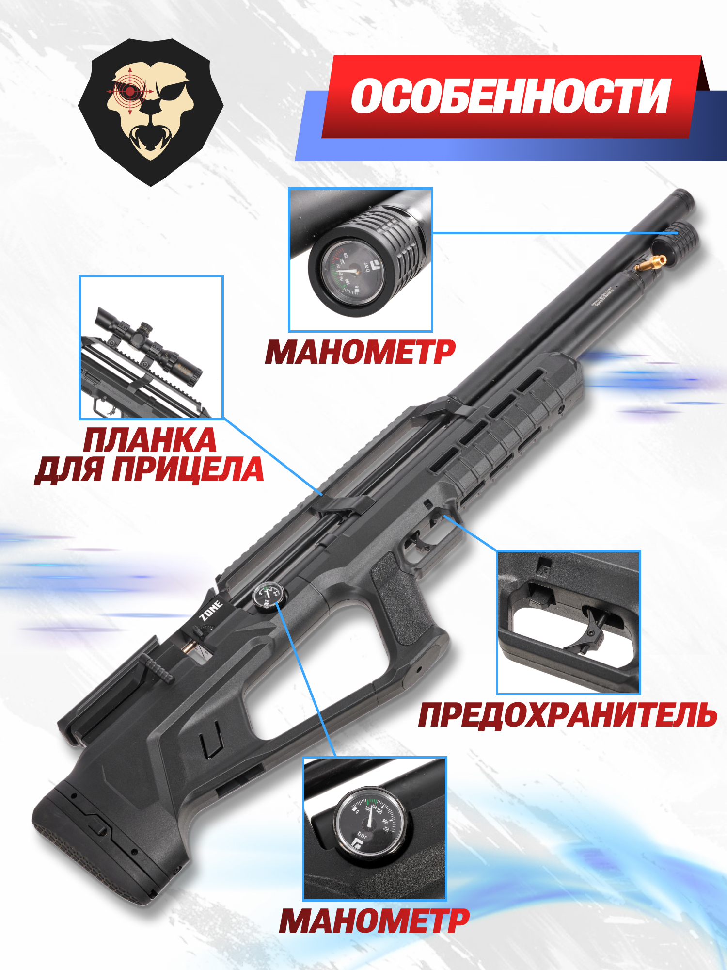 Винтовки серии Zone получили 58 сантиметровый нарезной ствол с интегрированным саундмодератором, который дополнительно снижает резкость выстрела, превращая его в едва различимый хлопок. В конкретном исполнении PCP пневматика рассчитана на ведение одиночной стрельбы, а в качестве боеприпасов выступают стандартные воланчиковые пули. Для наведения на мишень предусмотрен кронштейн с направляющей рельсовой планкой стандарта Вивер, на которую монтируются предпочитаемые оптические прицелы.