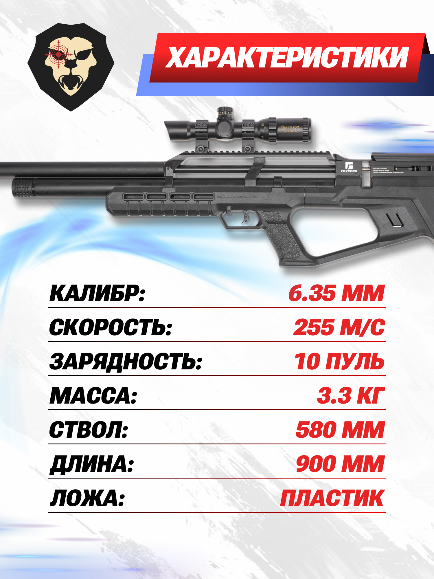 Информация о товаре "Пневматическая винтовка Reximex Zone 6.35 мм (3 Дж, пластик)" носит ознакомительный характер, и не является публичной офертой, определяемой положениями Статьи 437 Гражданского кодекса Российской Федерации, характеристики, внешний вид, цвет и комплектация могут быть изменены производителем без уведомления.