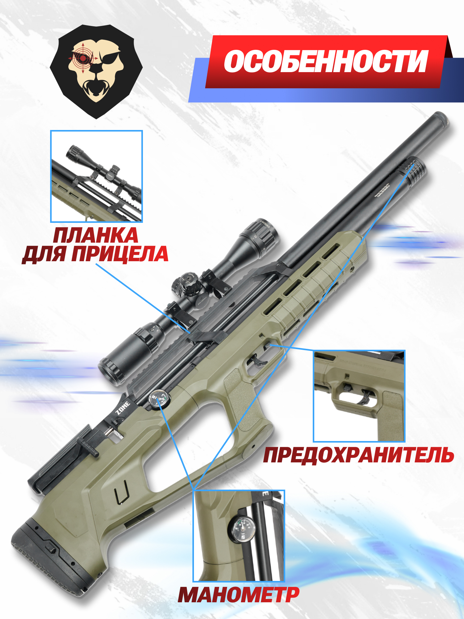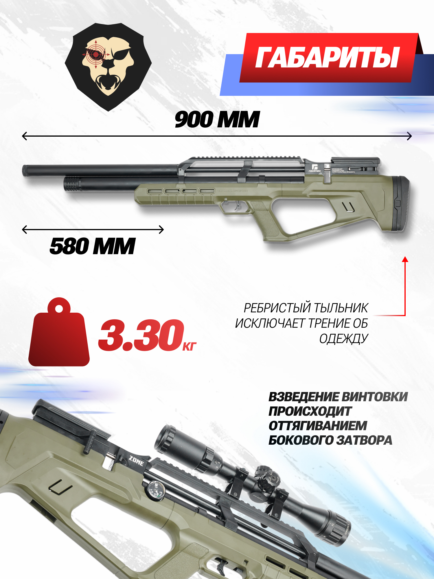 В сравнении с аналогичными пневматическими устройствами, выгодно отличаются недорогие и надежные образцы турецкого производства фирмы Reximex. Модельный ряд компании пополнился новейшей линейкой PCP винтовок Zone в компоновке Bull-Pup, благодаря которой удалось сократить габариты до 90 см. Ложа подобных изделий производится из высокопрочного и легкого полимера - в конкретном исполнении деталь имеет окрас OD Green.