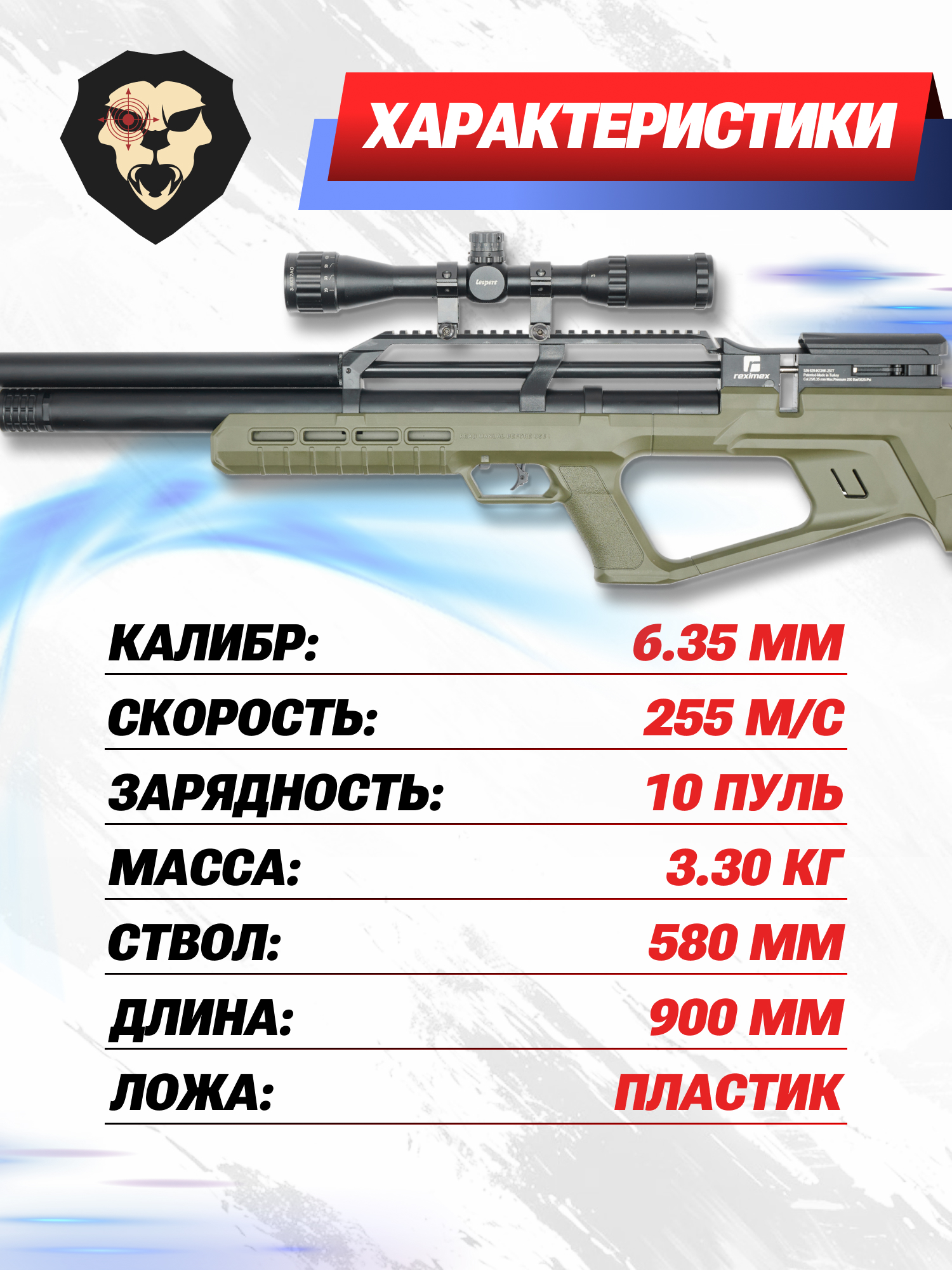 Информация о товаре "Пневматическая винтовка Reximex Zone 6.35 мм (3 Дж, пластик, OD Green)" носит ознакомительный характер, и не является публичной офертой, определяемой положениями Статьи 437 Гражданского кодекса Российской Федерации, характеристики, внешний вид, цвет и комплектация могут быть изменены производителем без уведомления.