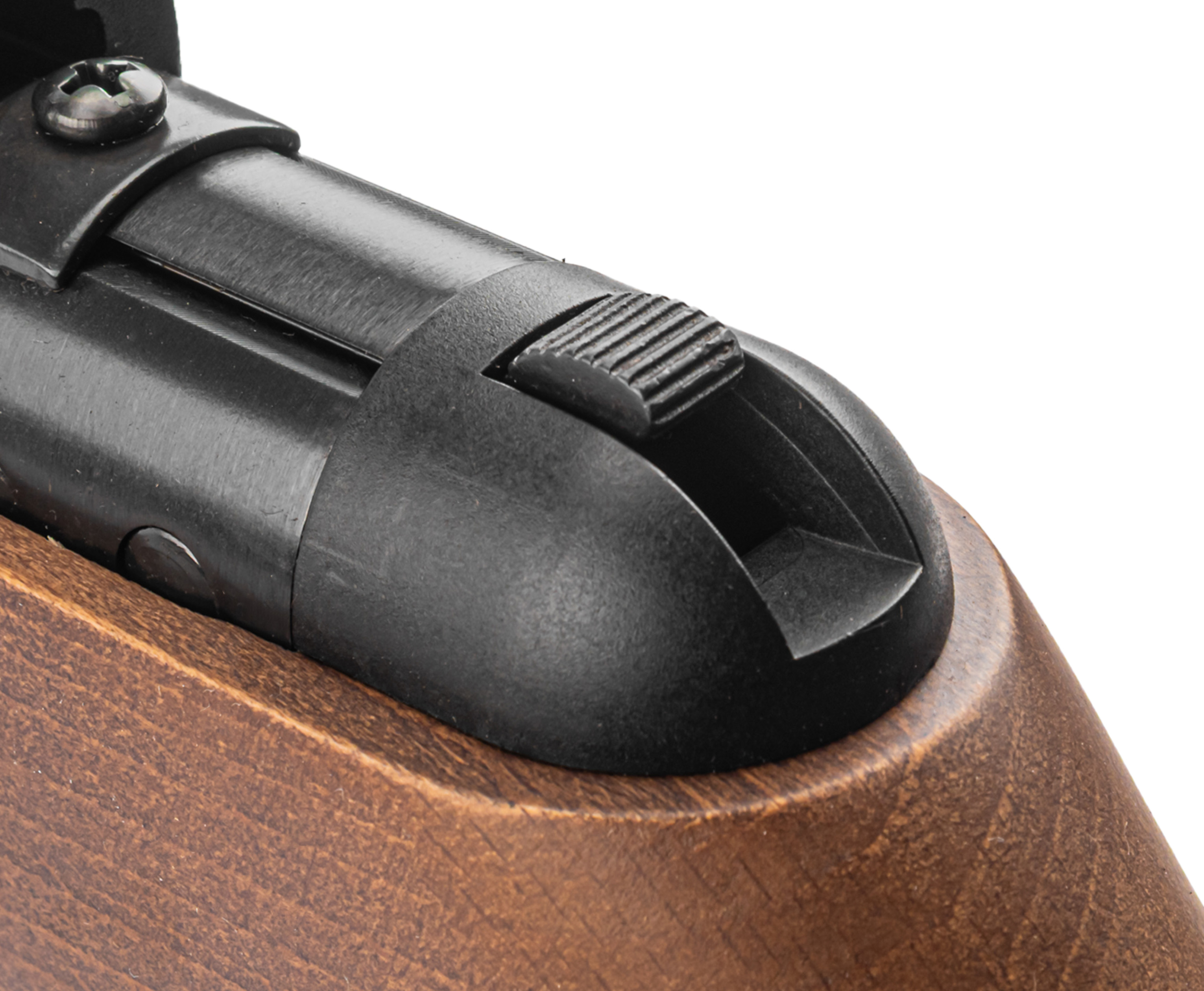 В переломленном состоянии пользователь также получает доступ к казеннику для самостоятельного досылания боеприпаса калибром 4.5 мм. После этого ствол возвращается на место, а оружие автоматически выставляется на предохранитель, что исключает случайный выстрел. Для снятия блокировки потребуется сместить переключатель с торцевой стороны коробки, которая выполнена из стали.