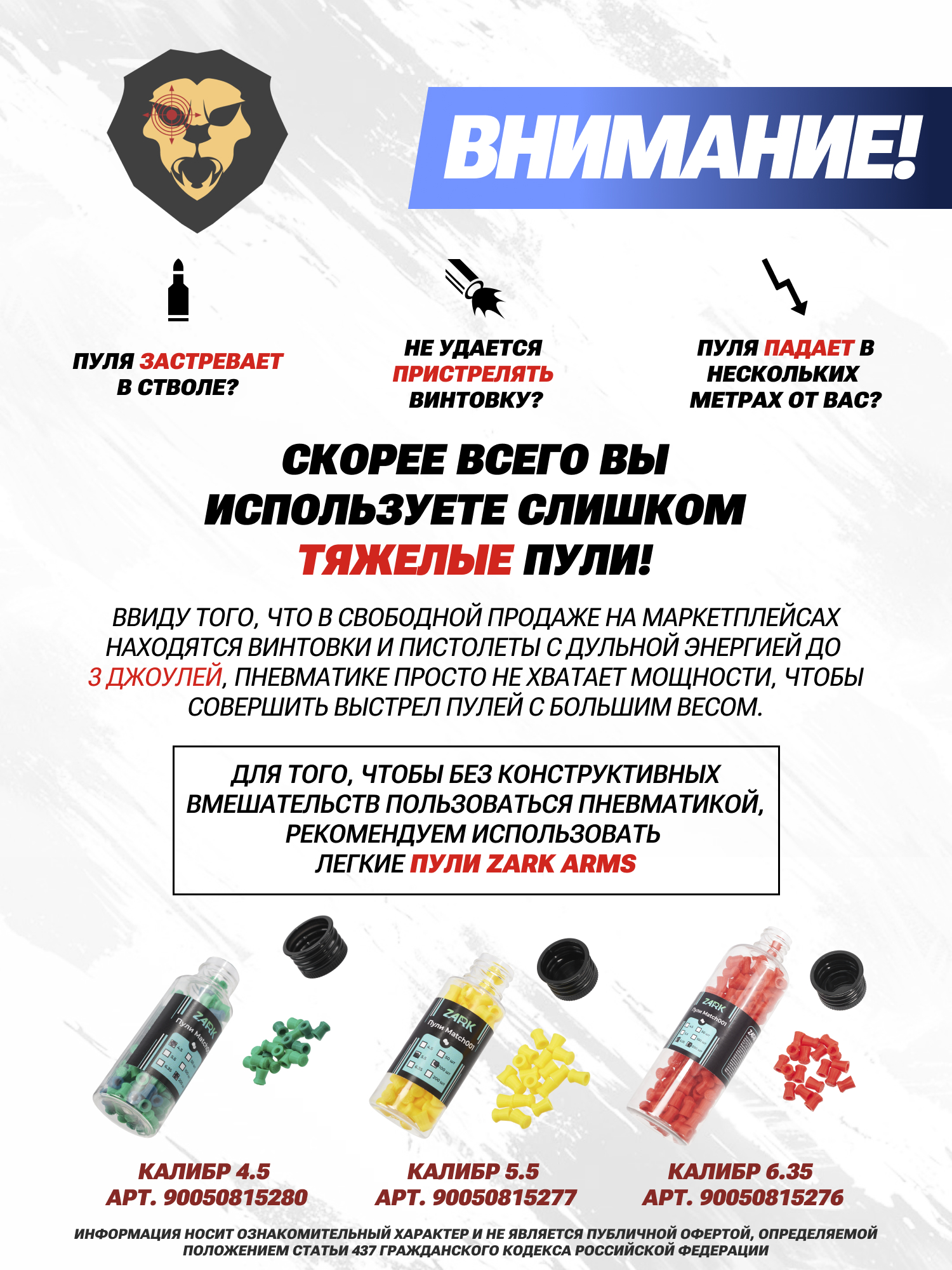 Внимание! Данная модель поставляется в разрешенной мощности для свободного приобретения на территории Российской Федерации. При этом в модели имеется возможность увеличения мощности путем замены части деталей или настройки конструкции, однако не стоит забывать о Федеральном законе «Об оружии» № 150 - ФЗ. В случае необходимости, опираясь на данный закон и руководствуясь им, возможно, потребуется получить разрешение от ЛЛР ГУ МВД России после вмешательства в конструкцию.