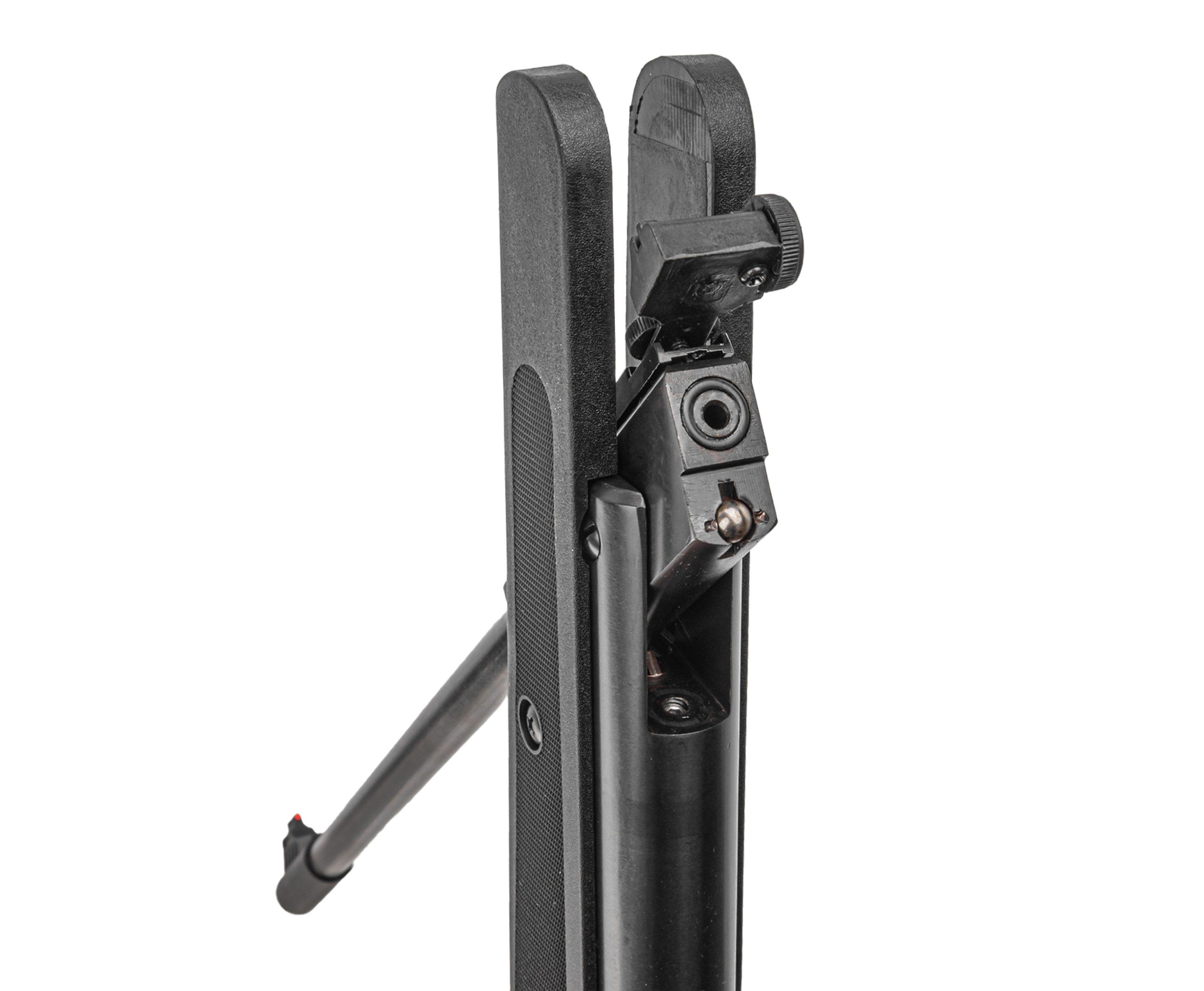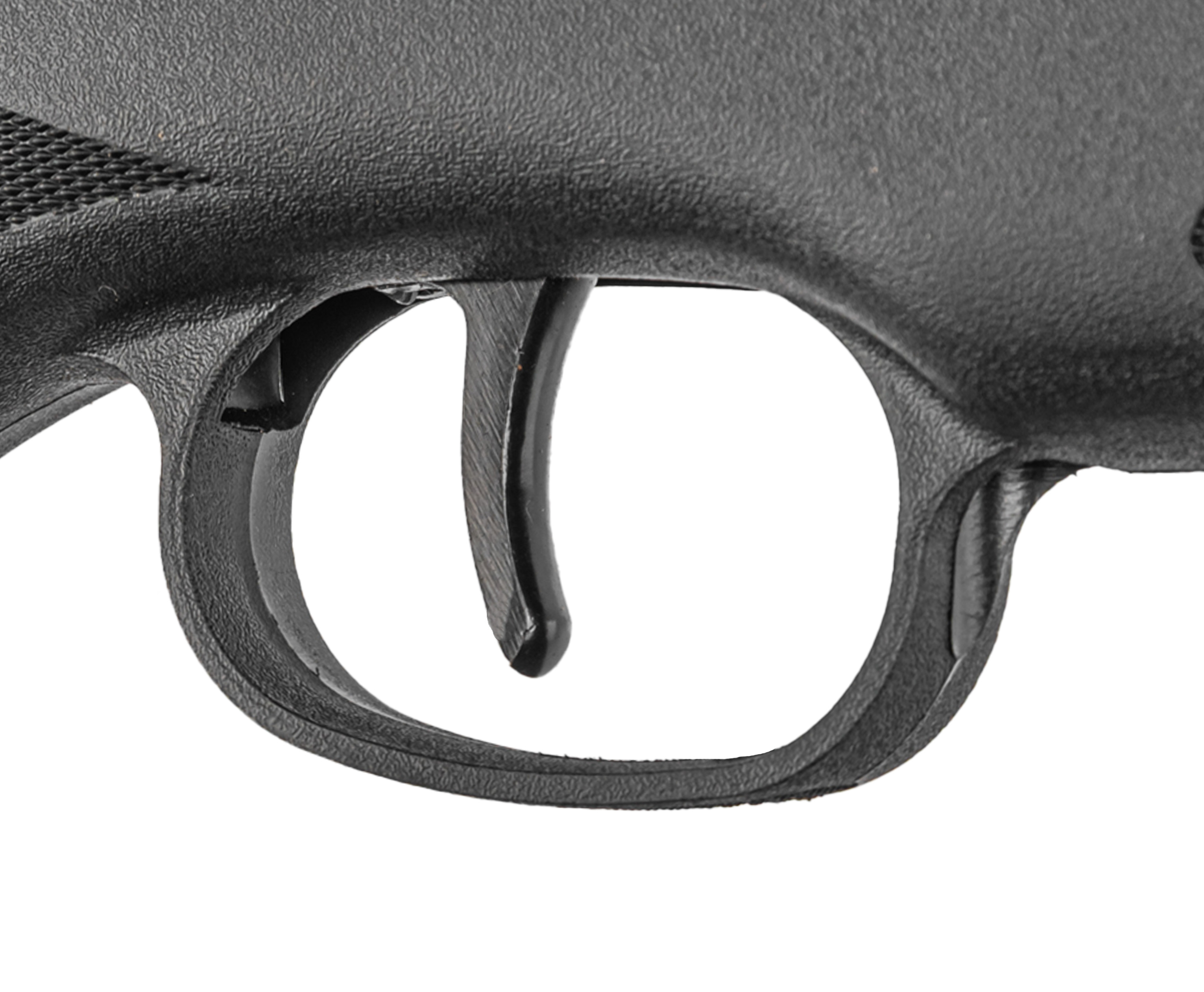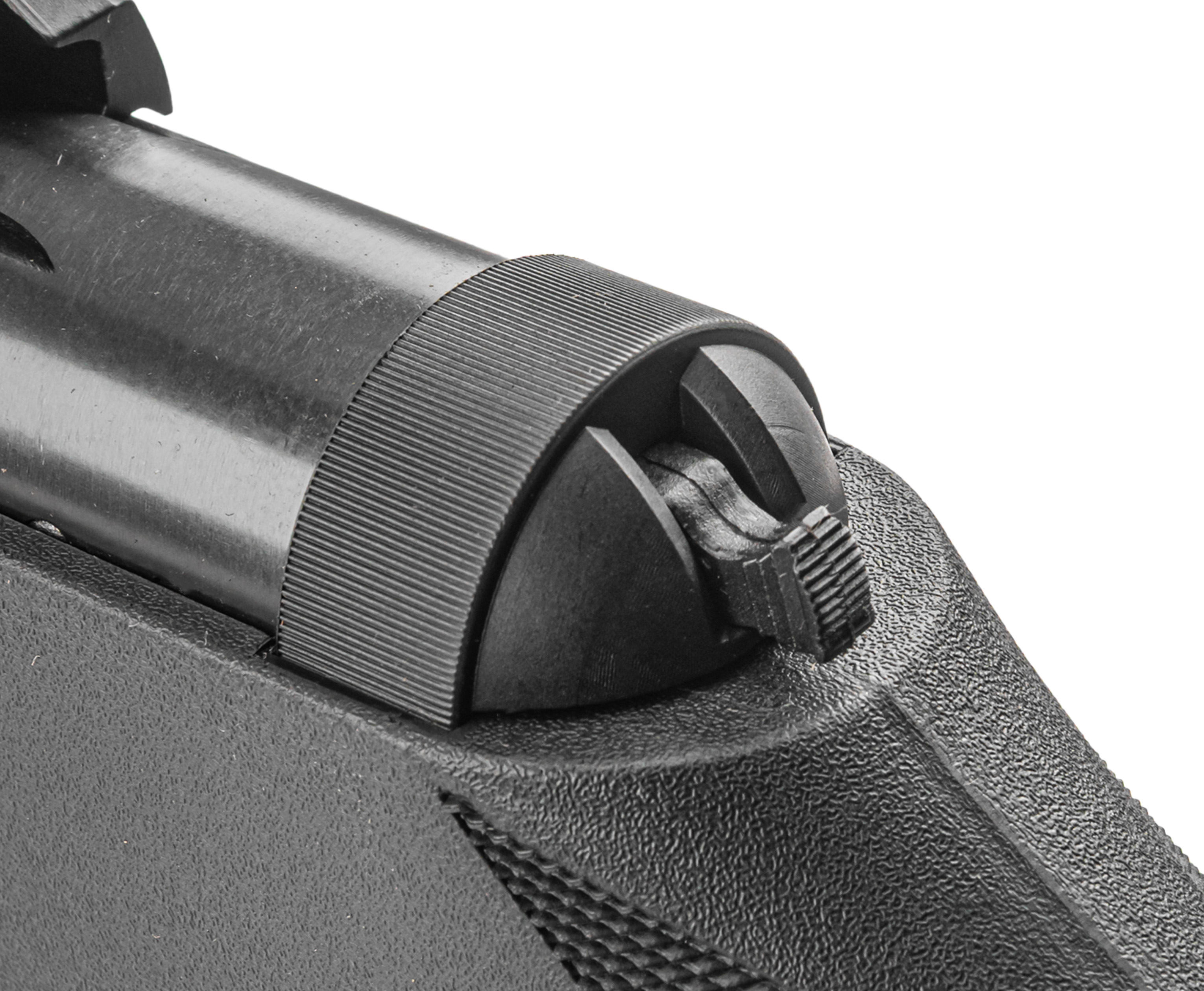 Разместив пулю калибром 4.5 мм, ствол возвращается на место, одновременно с чем срабатывает автоматический предохранитель. Такая система не дает совершить случайный выстрел, а снять блокировку можно большим пальцем руки - переключатель вынесен на торцевую часть коробки. В процессе «переламывания» также осуществляется подготовка спускового механизма и сжатие витой пружины, отвечающей за компрессию воздуха.