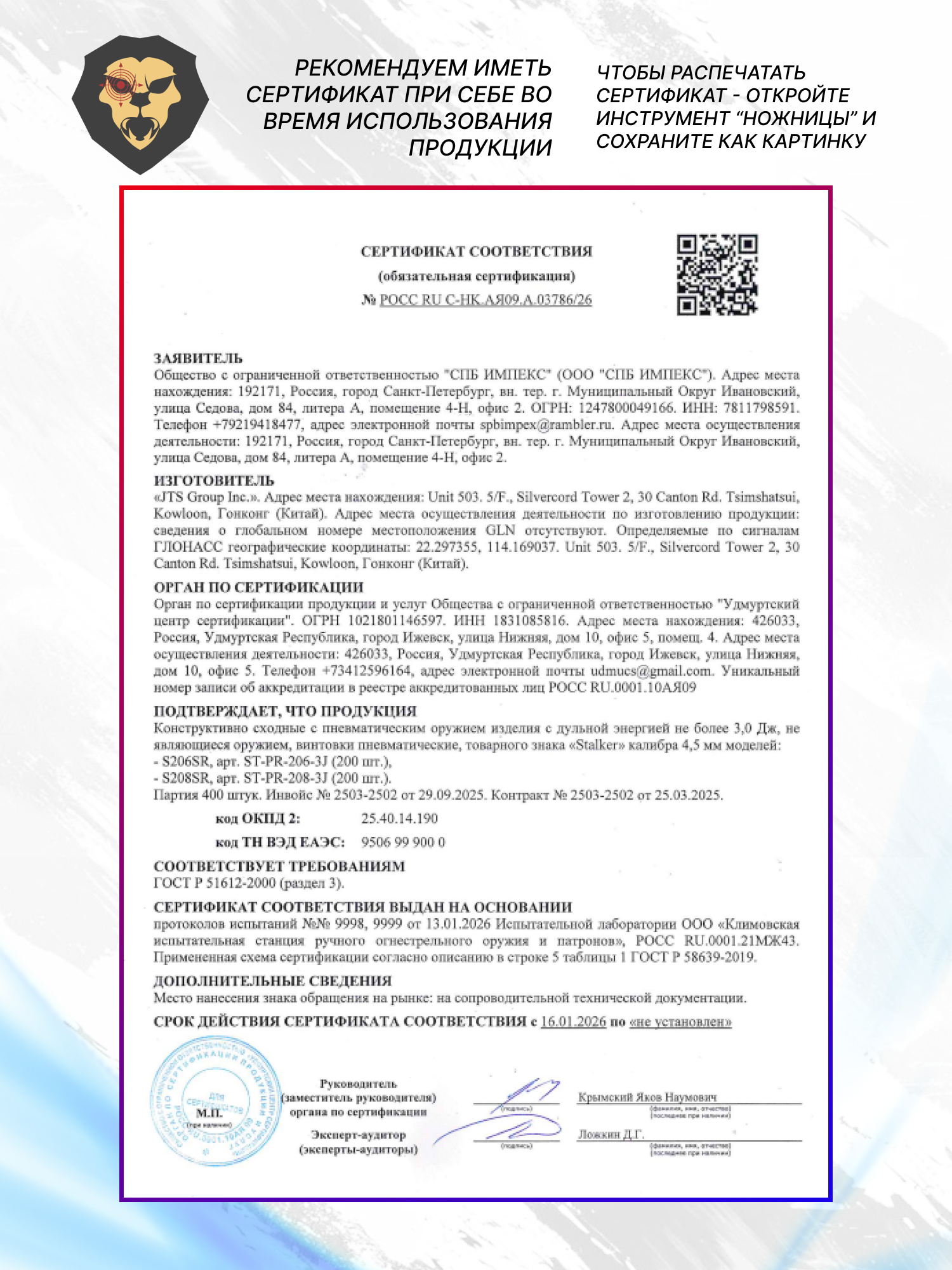 Артикул производителя ST-PR-206-3J Пневматическая винтовка Stalker S206SR 4.5 мм (3 Дж) по низкой цене 24010 руб. Модель со штрихкодом производителя Вы можете оплатить наложенным платежем с доставкой или в отделении транспортной компании (ПЭК, СДЭК, Boxberry). Ваш заказ со штрихкодом 2000000183473 забрать на почте с оплатой при получении в любой части Российской Федерации.