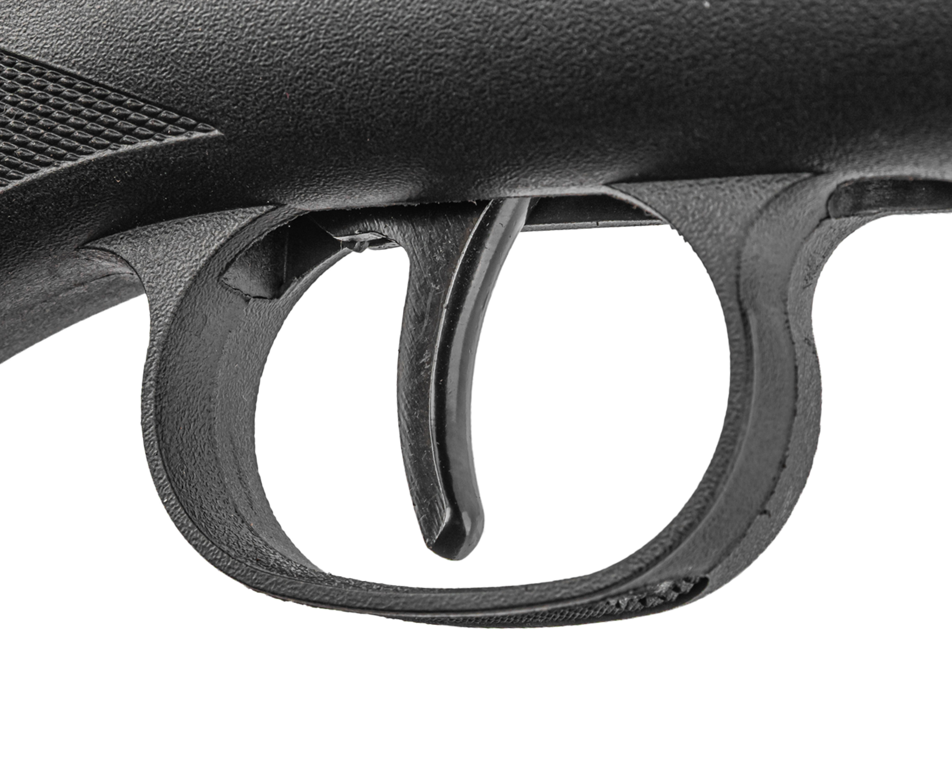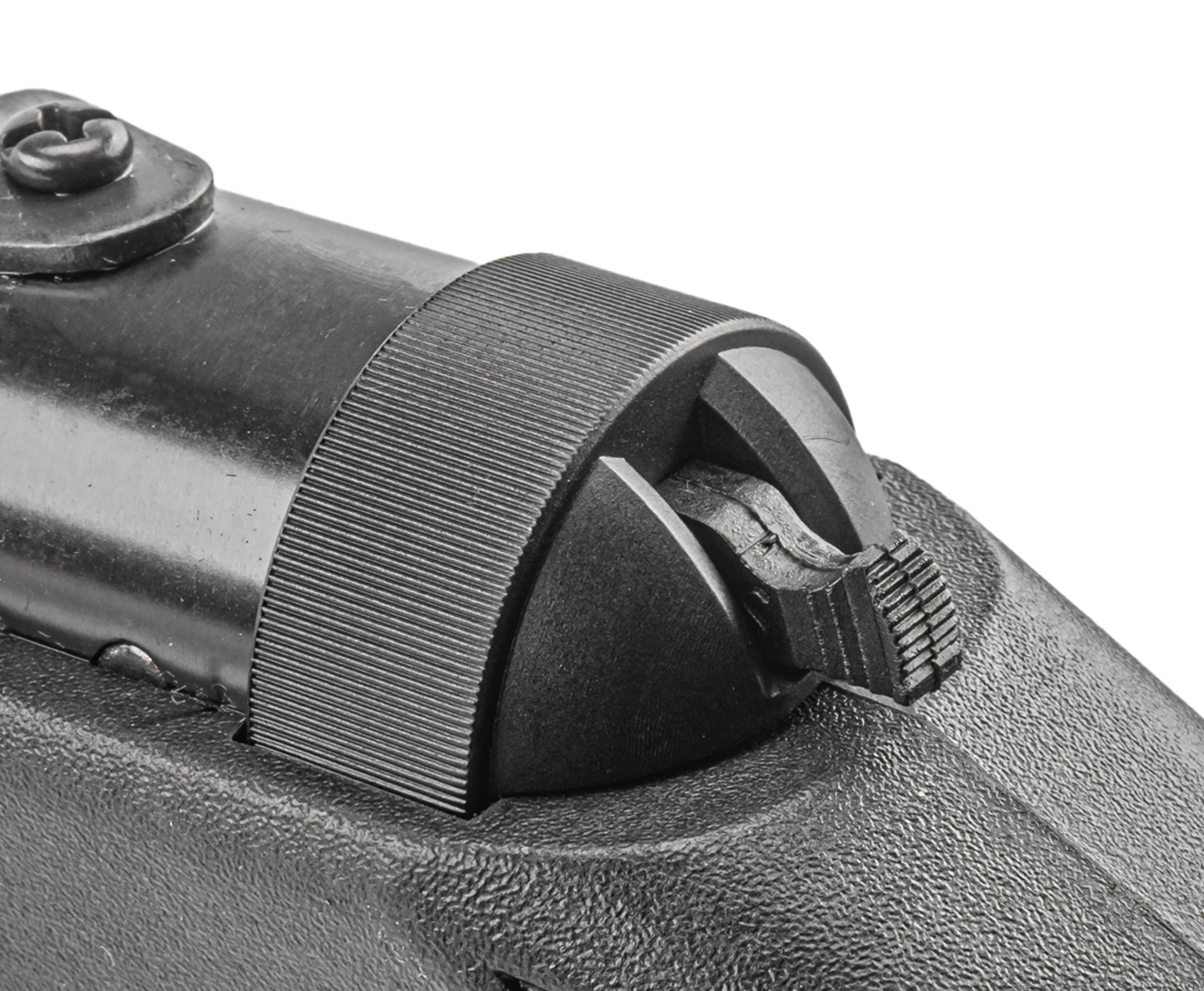 Блокировка снимается переключателем, расположенным с торца коробки. В процессе переламывания также происходит сжатие витой пружины, отвечающей за компрессию. При взаимодействии с триггером она распрямляется и толкает поршень - сжатый воздух затем из цилиндра устремляется в канал ствола.